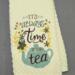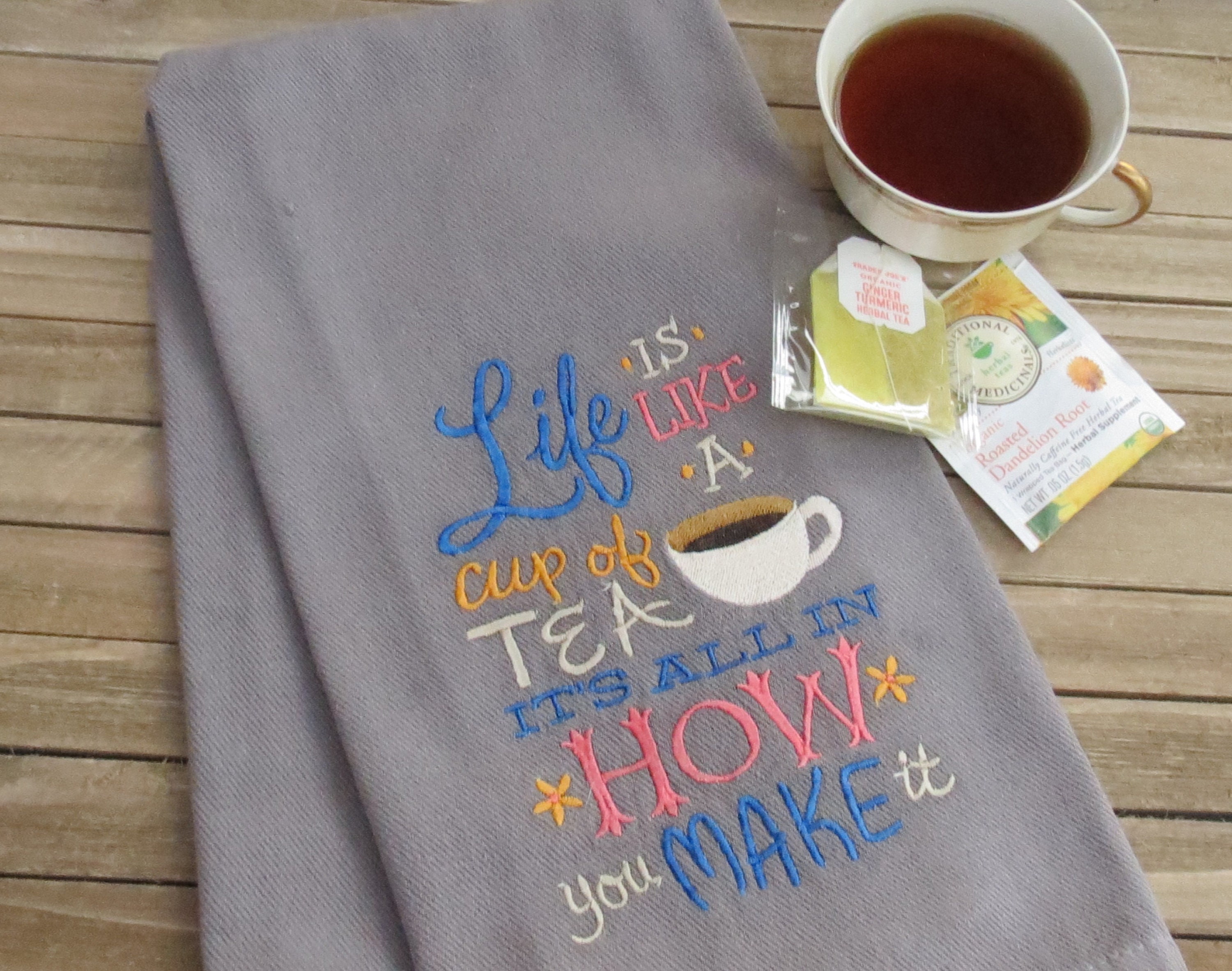 *Life is like a cup of Tea: Is embroidered on a Gray tea towel