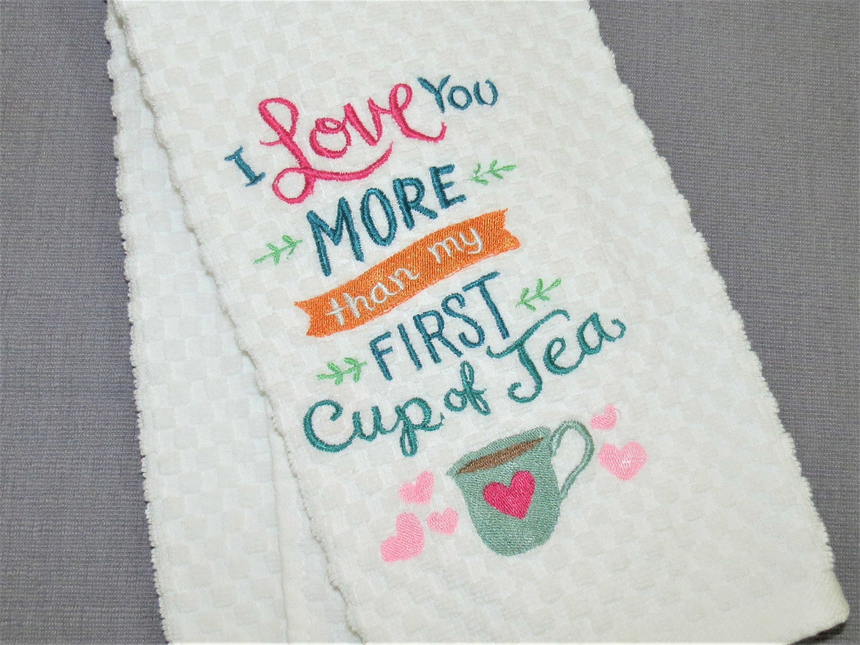 *Love you more than Tea: Is embroidered on a White thick cotton towel