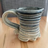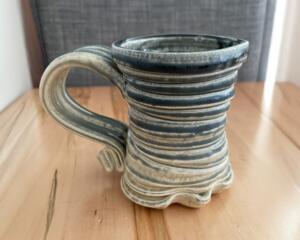 This one is a smaller cup and excellent for tea servings. A green glaze and an organic abstract shape makes it fun to hold. Add his unique handle and you have a piece of art you get to have your nightly chamomile out of!