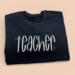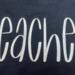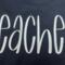 The embroidered design consist of Hand lettered font that reads TEACHER with a heart to the right.
