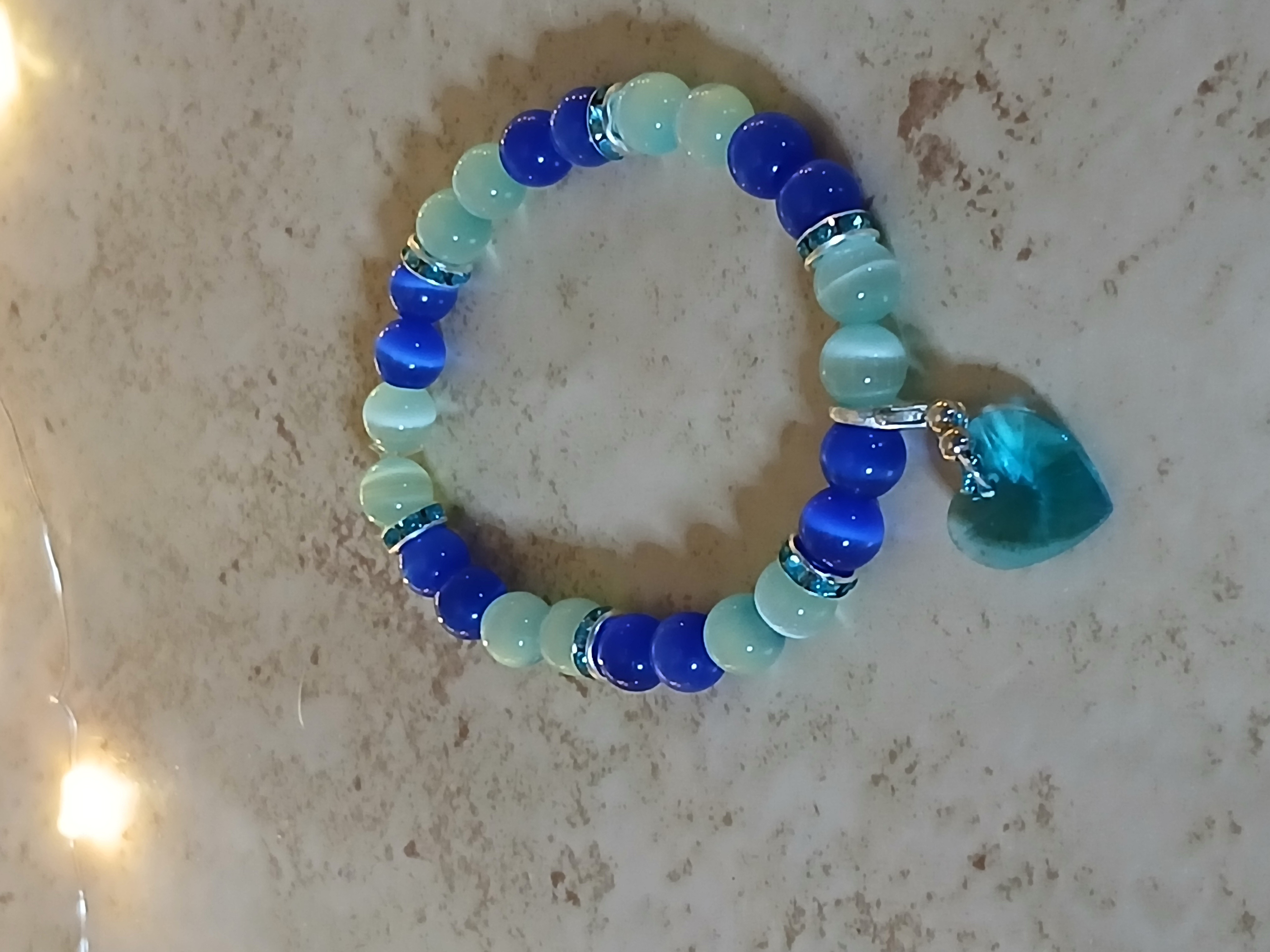 Teal and blue cat eye beads and lt blue rhinestone spacers and a teal heart charm make this a great bracelet for this that want some different color