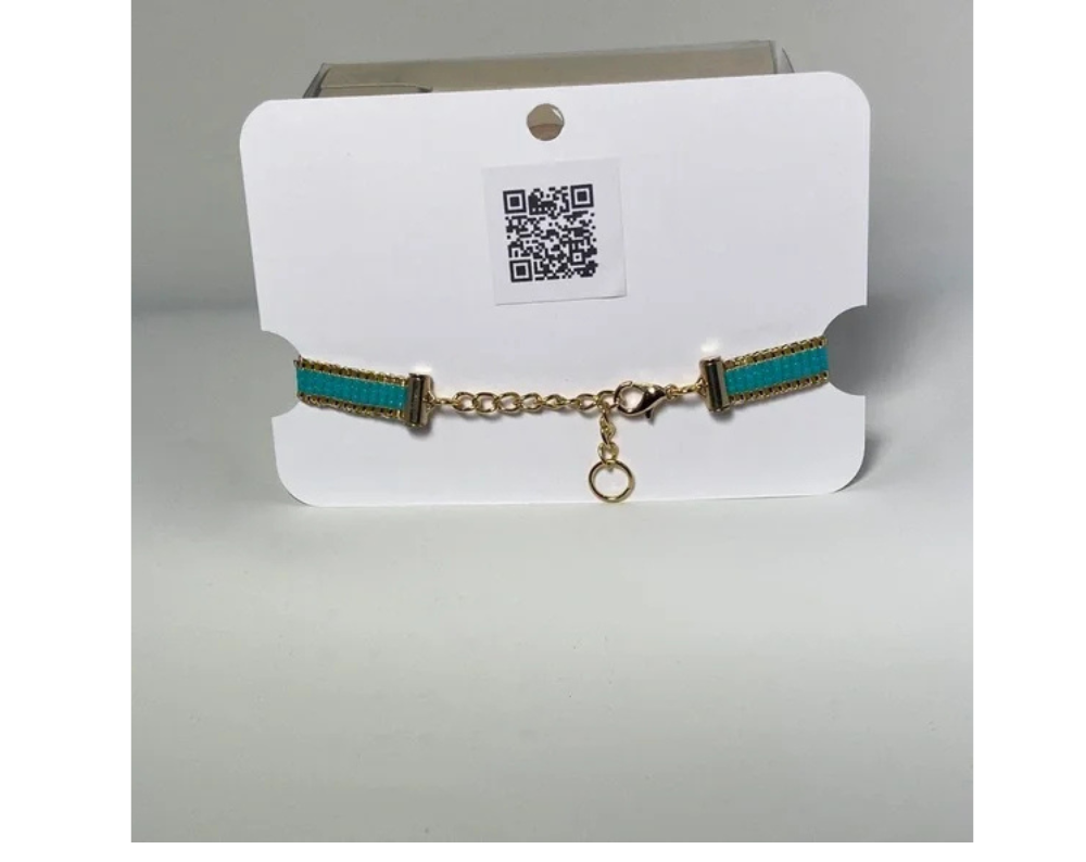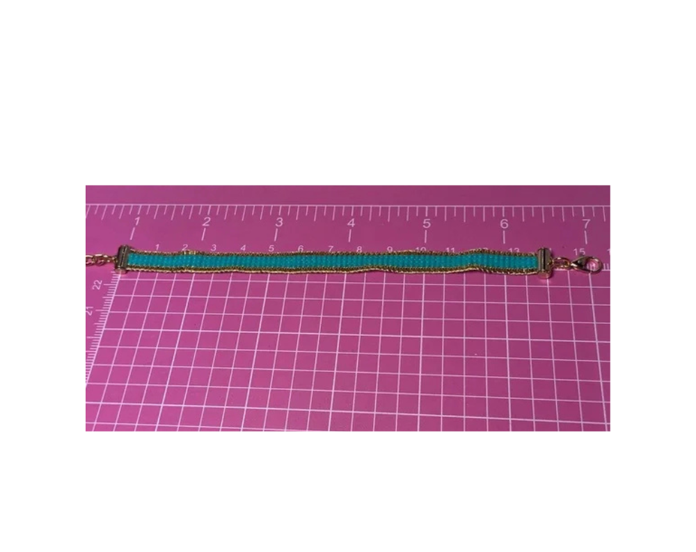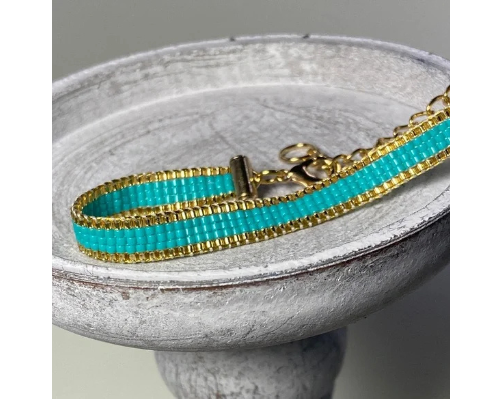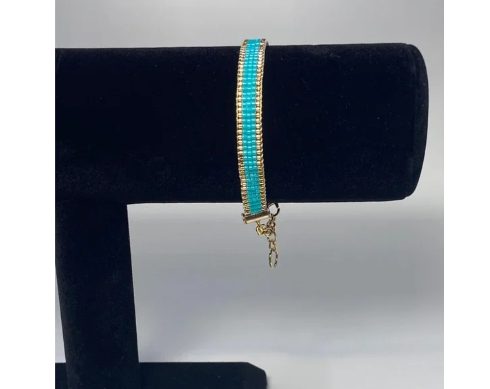 Traditional Native American Indian style beading ,weaving ,woven boho bohemian. Turquoise blue green . Chic bracelet featuring intricate gold and Turquoise beadwork. Stylish and versatile accessory. Great gift idea for her for Mother's Day ,Birthday or Christmas.