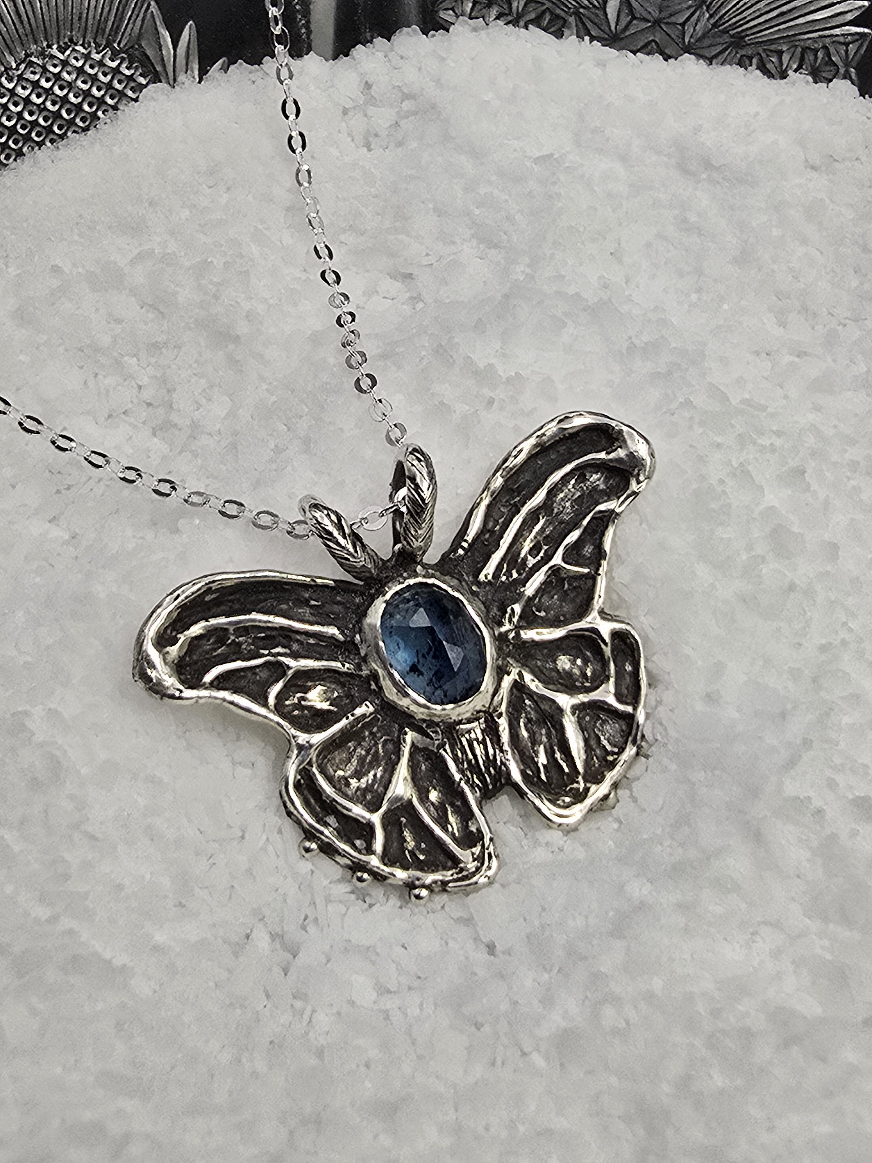 This intricate moth talisman was hand sculpted in wax and cast in sterling silver. Set with a beautiful teal moss kyanite in the center, she feels like she would guide you through the dark.