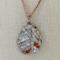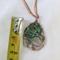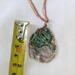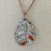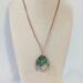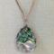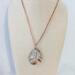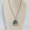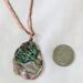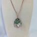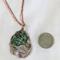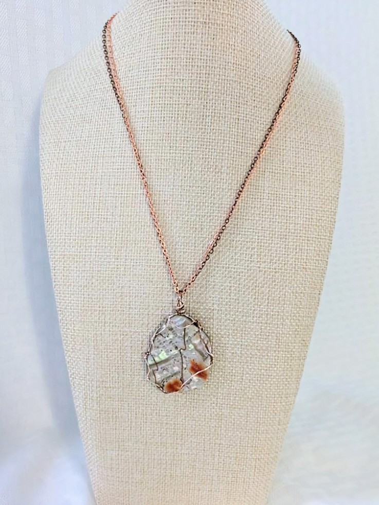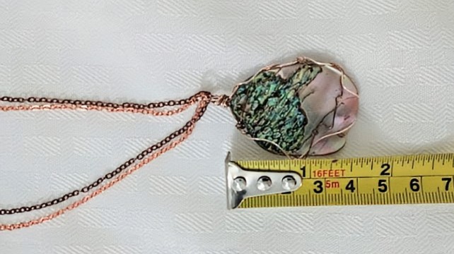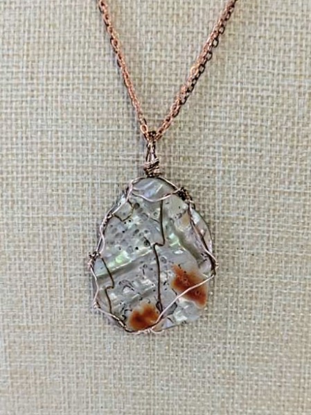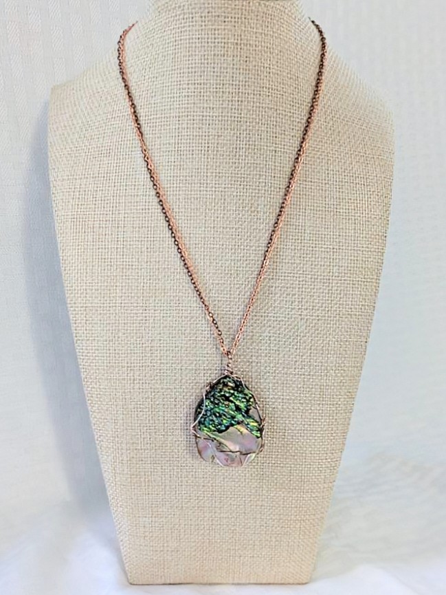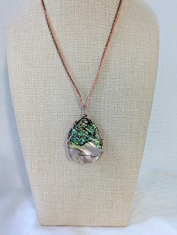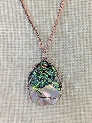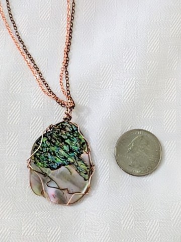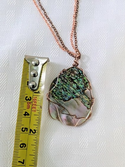 This iridescent Abalone teardrop is just over 1 1/2" in length and 1 1/4" in width at its widest point. The length from the top of the bail to the bottom of the shell is approximately 2" in length. Beautifully wire wrapped with copper and rose gold wire, this necklace can be worn front or back, as both sides are stunning in their own way.