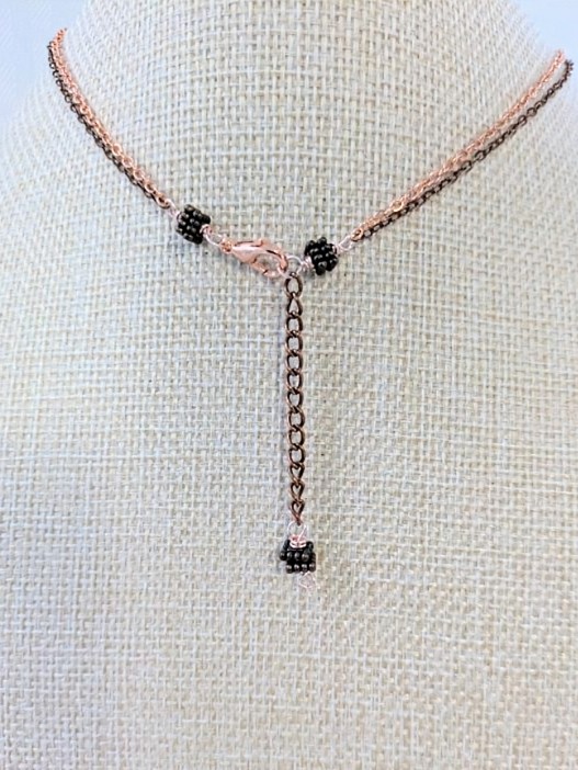 The double chain, one in copper and one in rose gold color, is approximately 16 1/2" in length with a 2" extender and finished with copper beads.