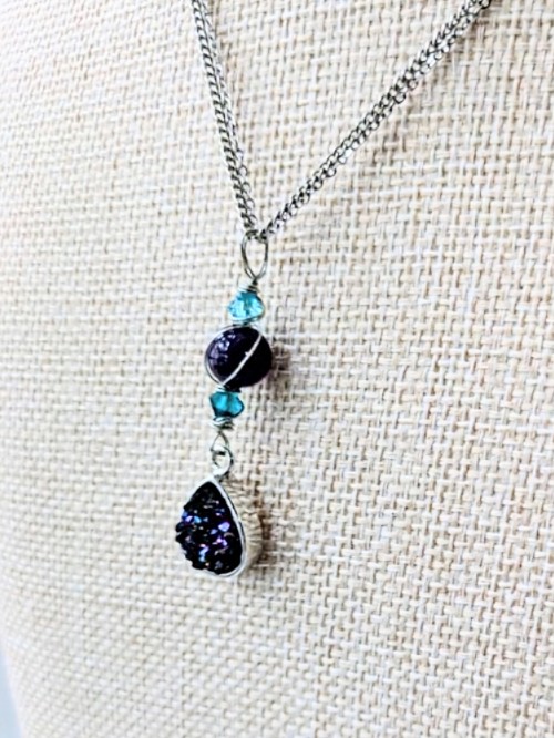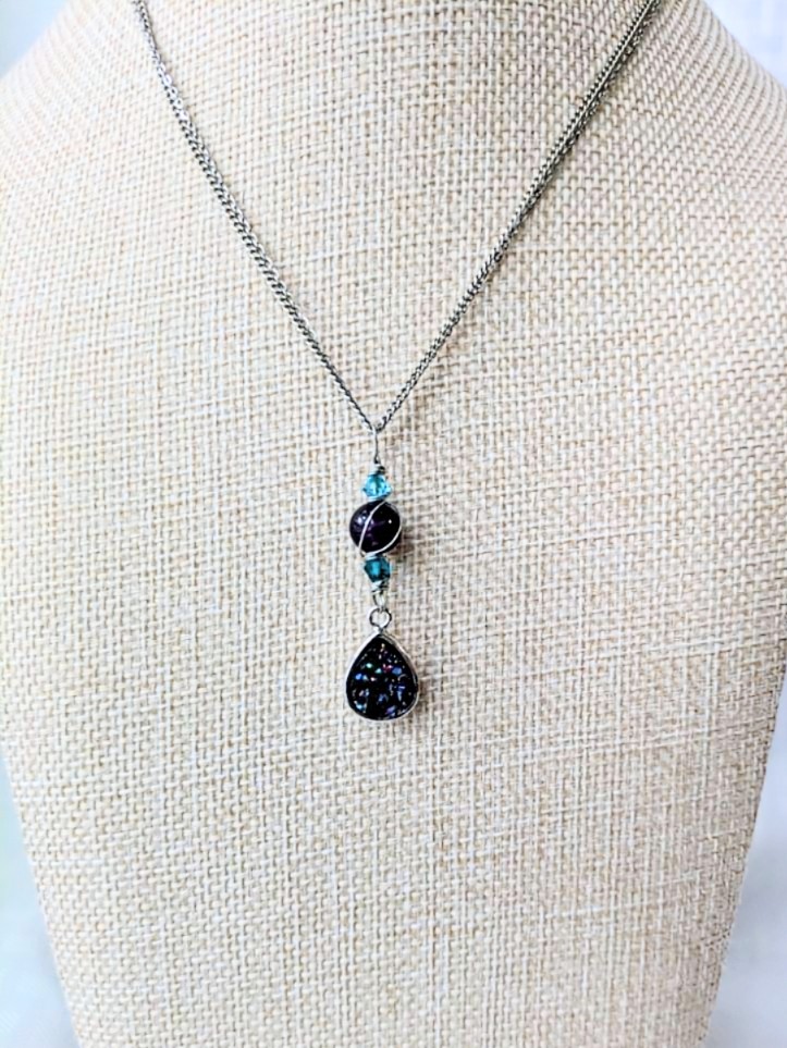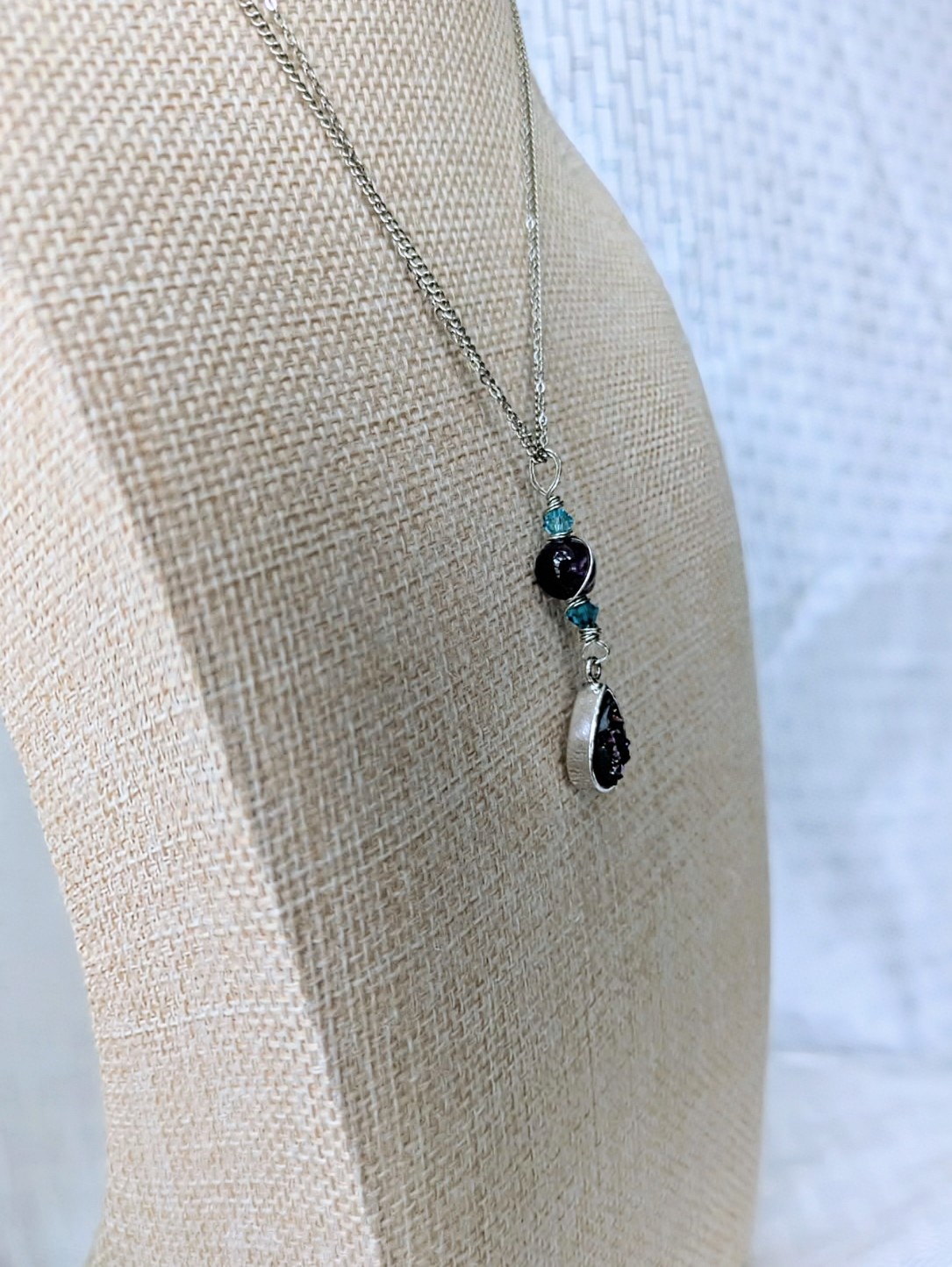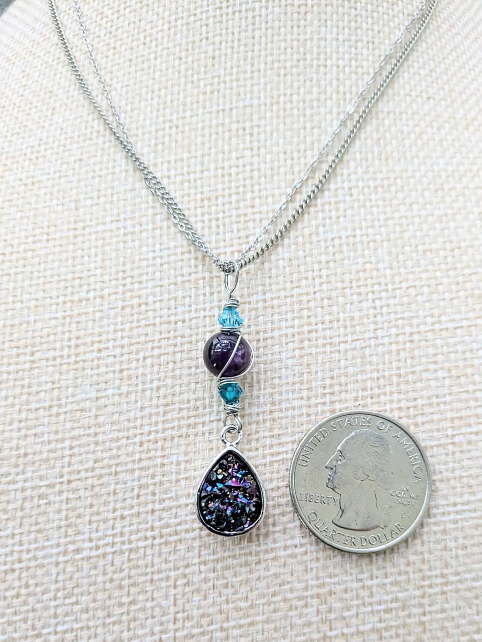 This teardrop Druzy Quartz is approximately 1/2" long by 5/8" wide at its widest point. It is suspended from an 8 mm Amethyst bead with two 4 mm Bicone Swarovski Crystal beads, in two shades of turquoise, to pick up the colors in the teardrop.