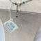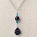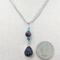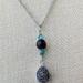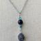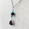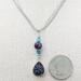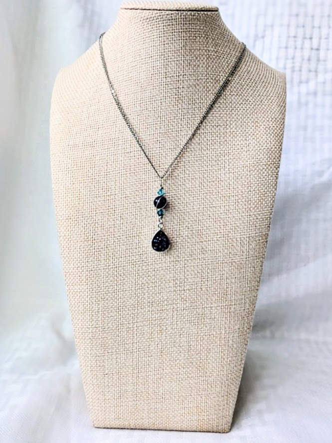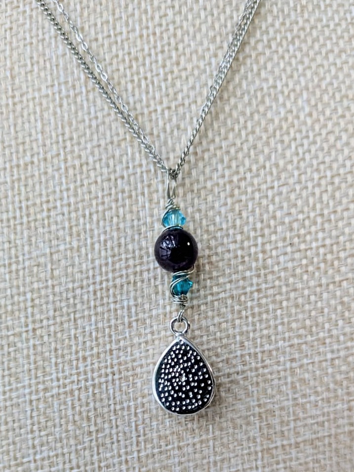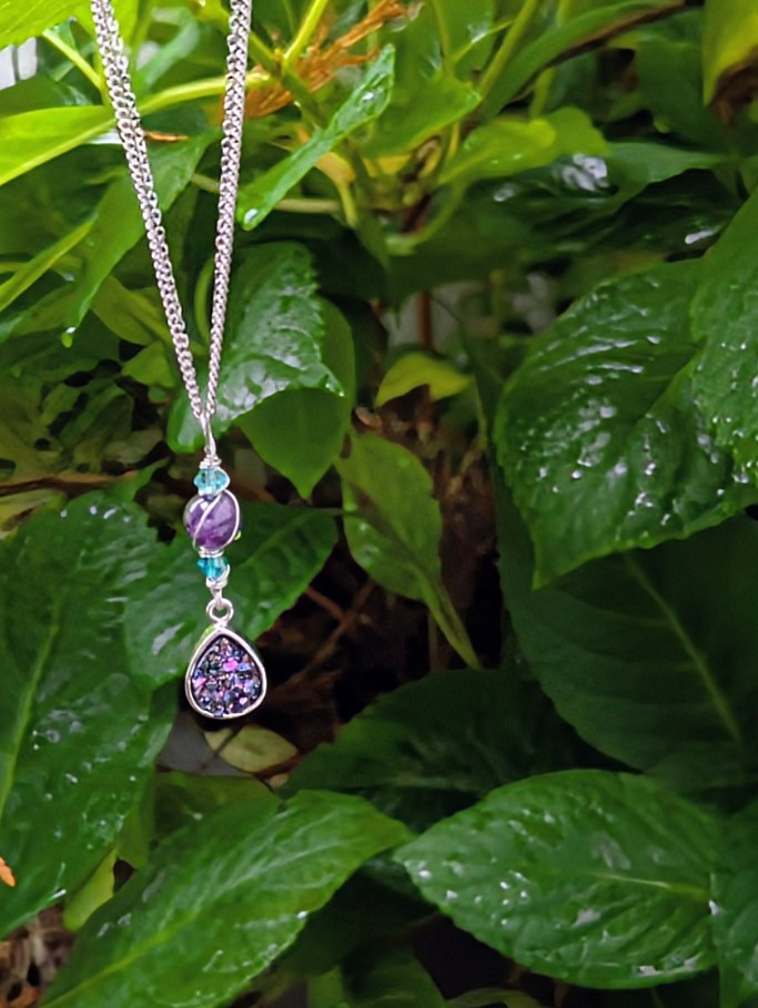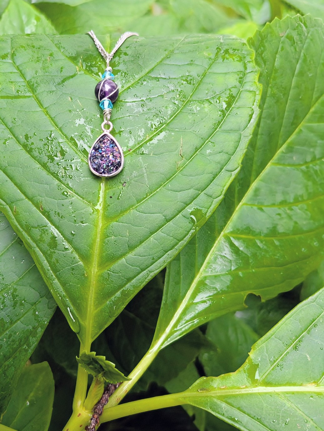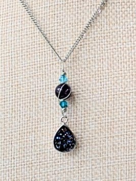 This teardrop Druzy Quartz is approximately 1/2" long by 5/8" wide at its widest point. It is suspended from an 8 mm Amethyst bead with two 4 mm Bicone Swarovski Crystal beads, in two shades of turquoise, to pick up the colors in the teardrop.