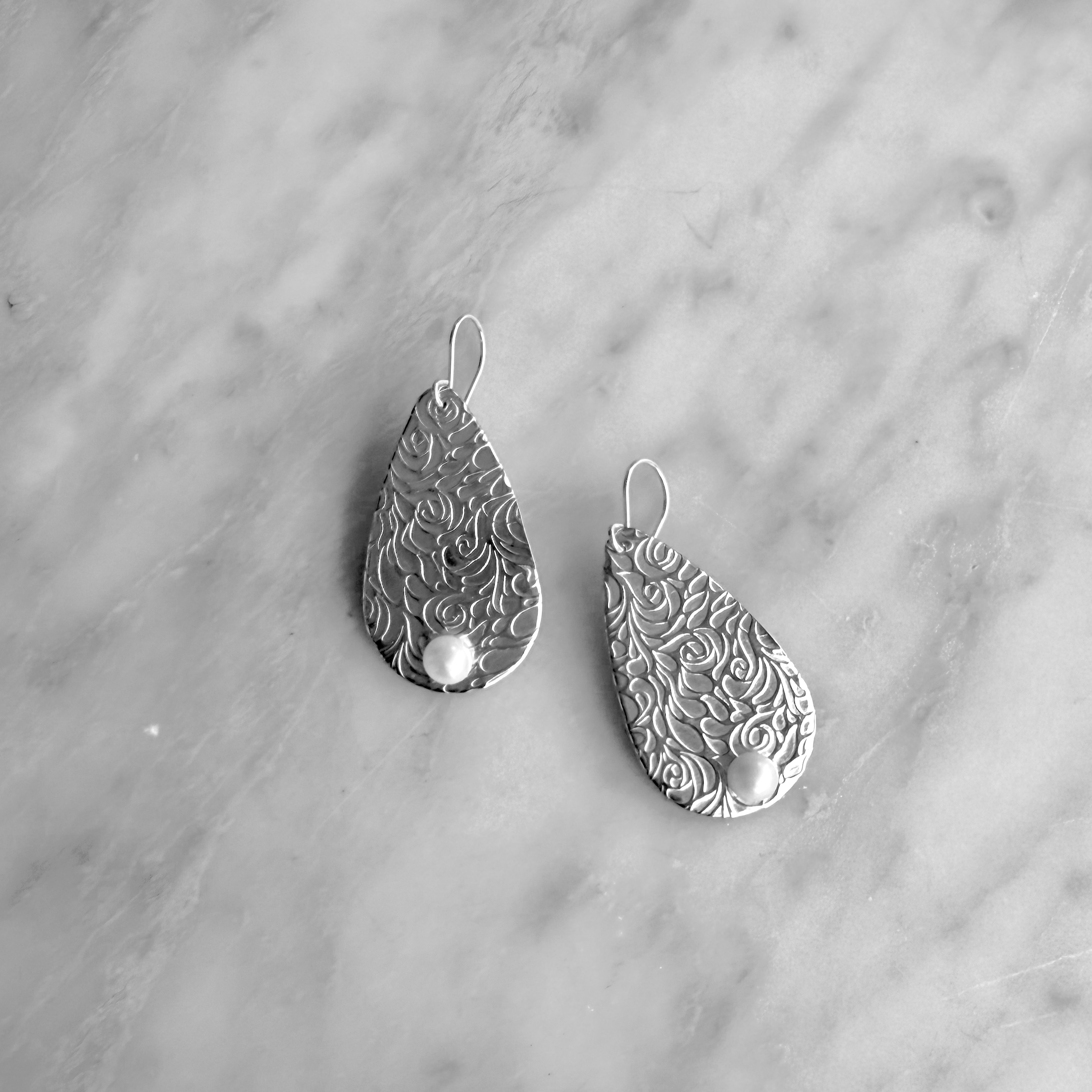 The pewter earrings are patterned, cut, filed, and cleaned. Pearlis attached. Then a hole is drilled in the top. The ear wires are made and attached.