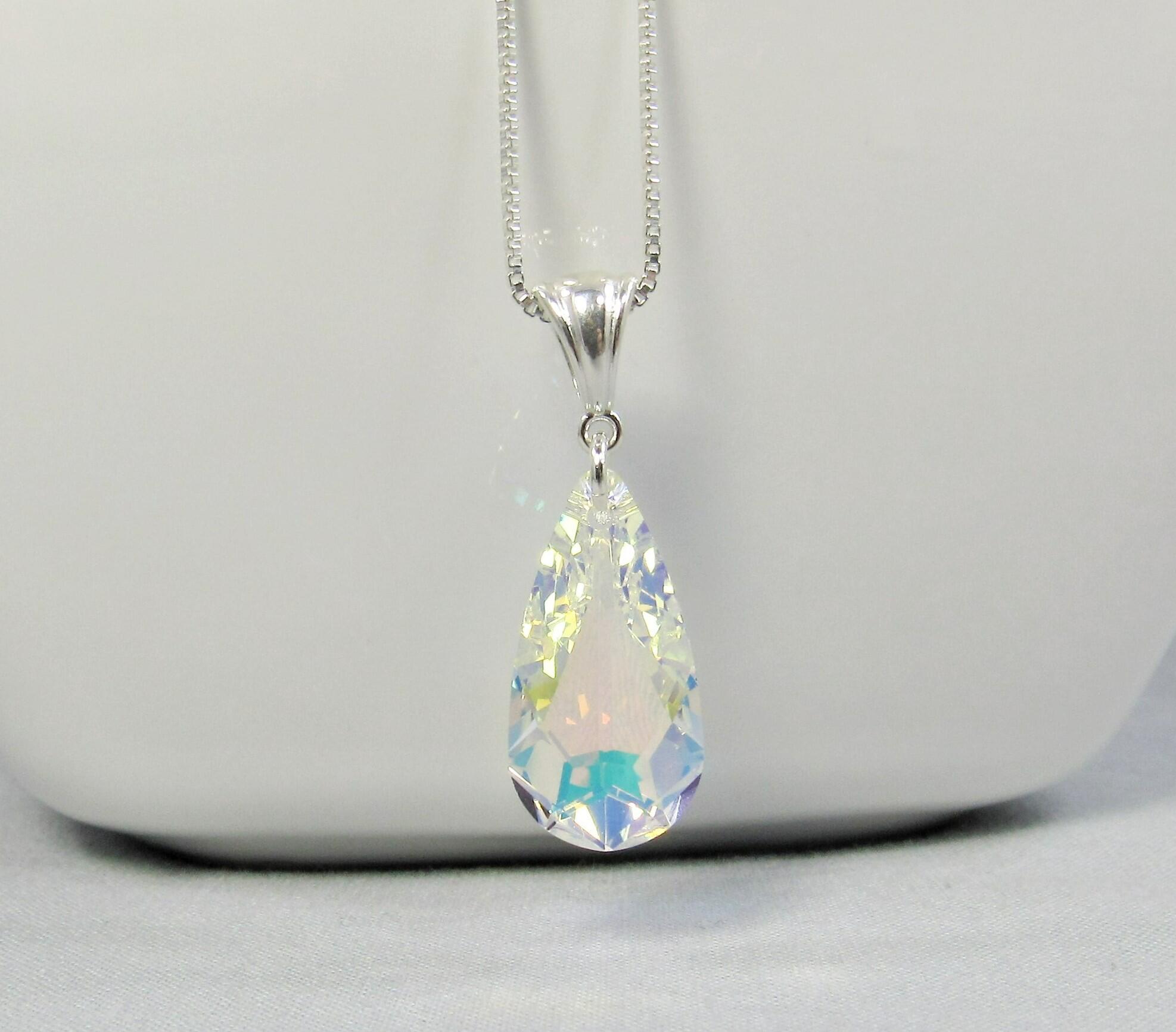 One beautifully faceted teardrop rainbow prism pendant necklace created with Swarovski Elements 12mm x 24mm aurora borealis crystal and a sterling silver bail. The bail has a nicely polished finish with a 6.5 x 3.9 mm opening. The pendant is sold alone or you can add a 1.1 mm sterling silver box chain in a 16 inch, 18 inch, or 20 inch or 24 inch length. The AB crystal coating on the back of the pendant creates a dancing sparkle of all the surrounding colors for a versatile wardrobe accessory.