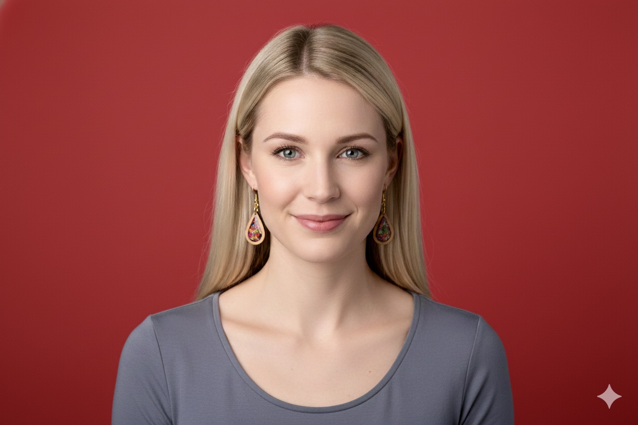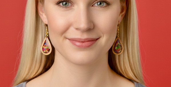These unique teardrop earrings capture the fiery beauty of an autumn sunset with their vibrant dichroic flakes encased within a smooth wooden frame. Each earring features a mesmerizing mosaic of shimmering reds, oranges, golds, and greens that catch the light with every movement, creating a dazzling display of color.