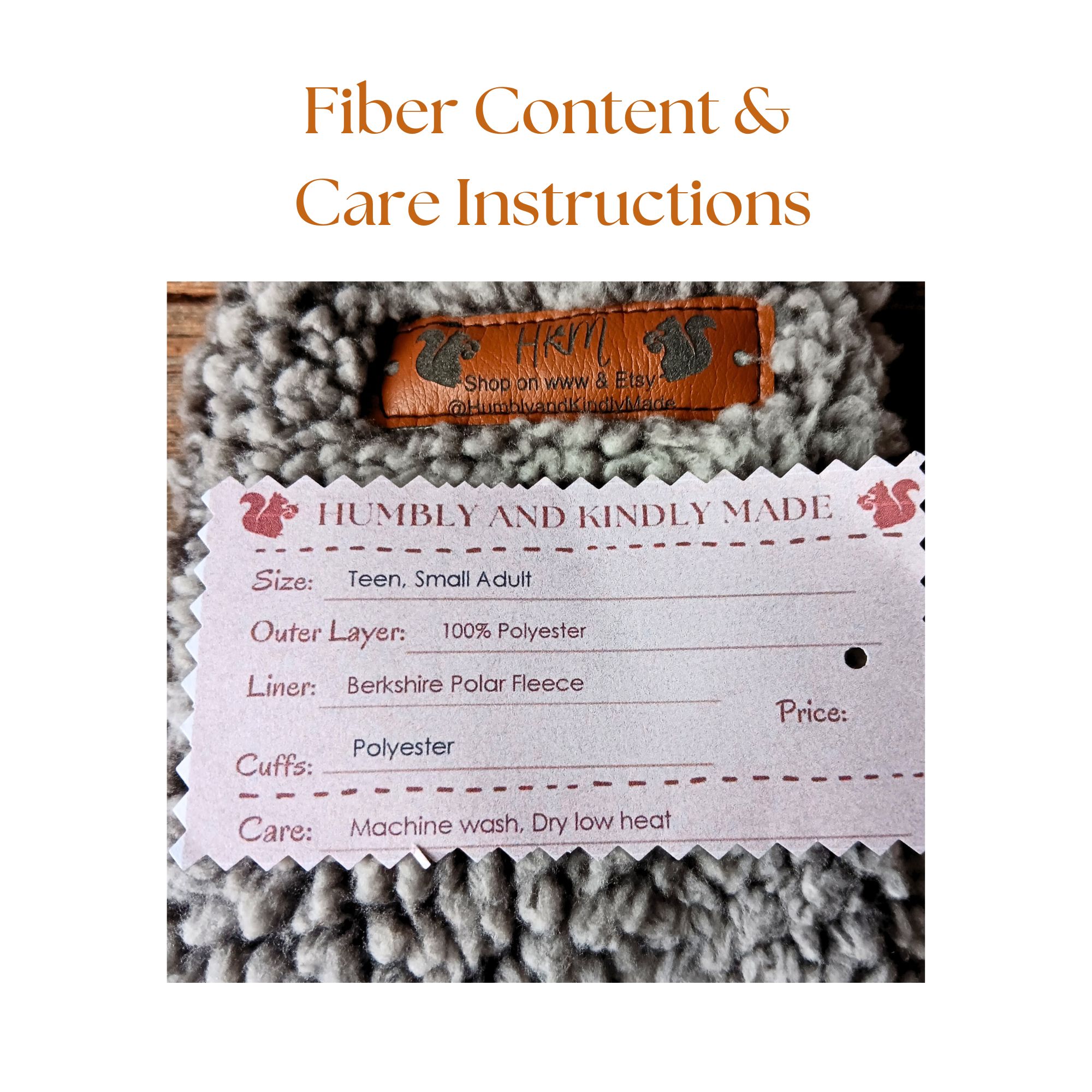 • Upcycled Fleece Mittens are handcrafted from recycled fleece pullovers and jackets. All fiber content is printed on the tag of each pair of mittens.