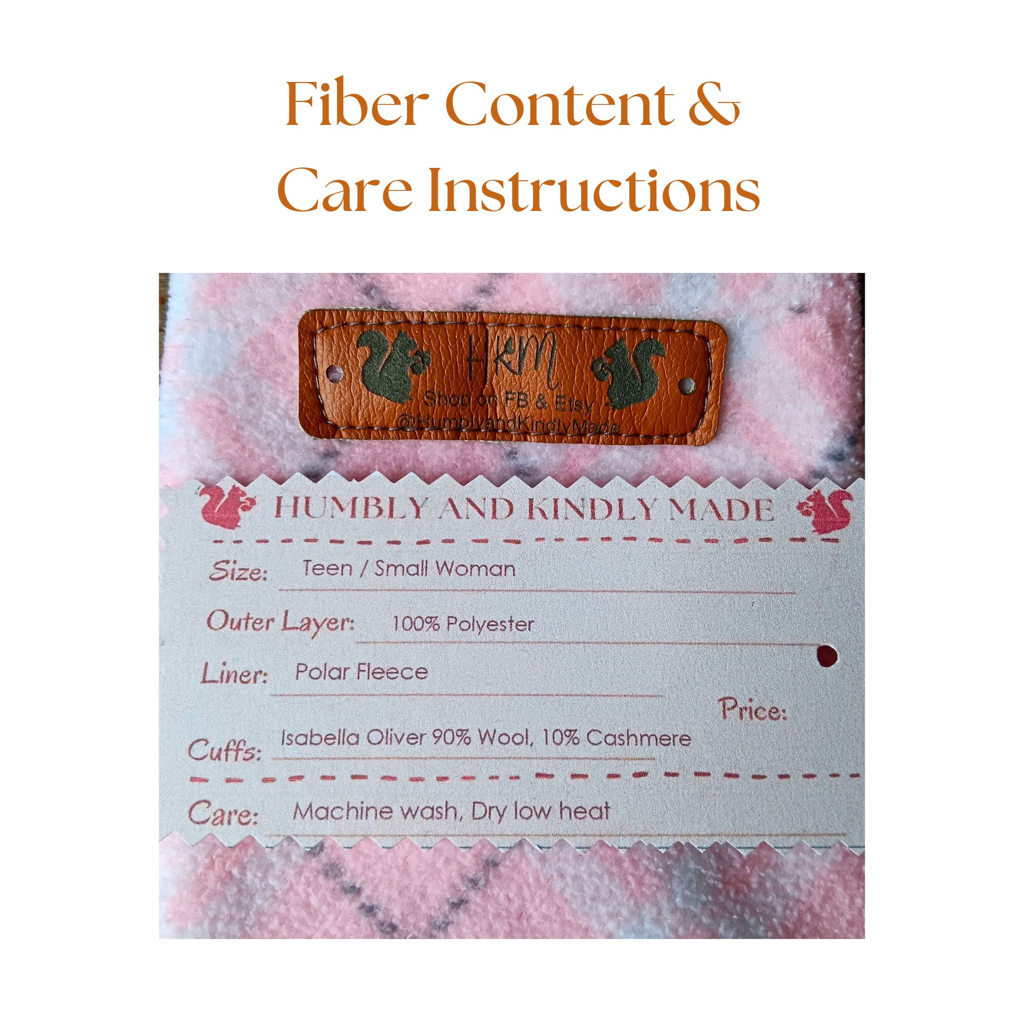 • Upcycled Fleece Mittens are handcrafted from recycled fleece pullovers and jackets. All fiber content is printed on the tag of each pair of mittens.