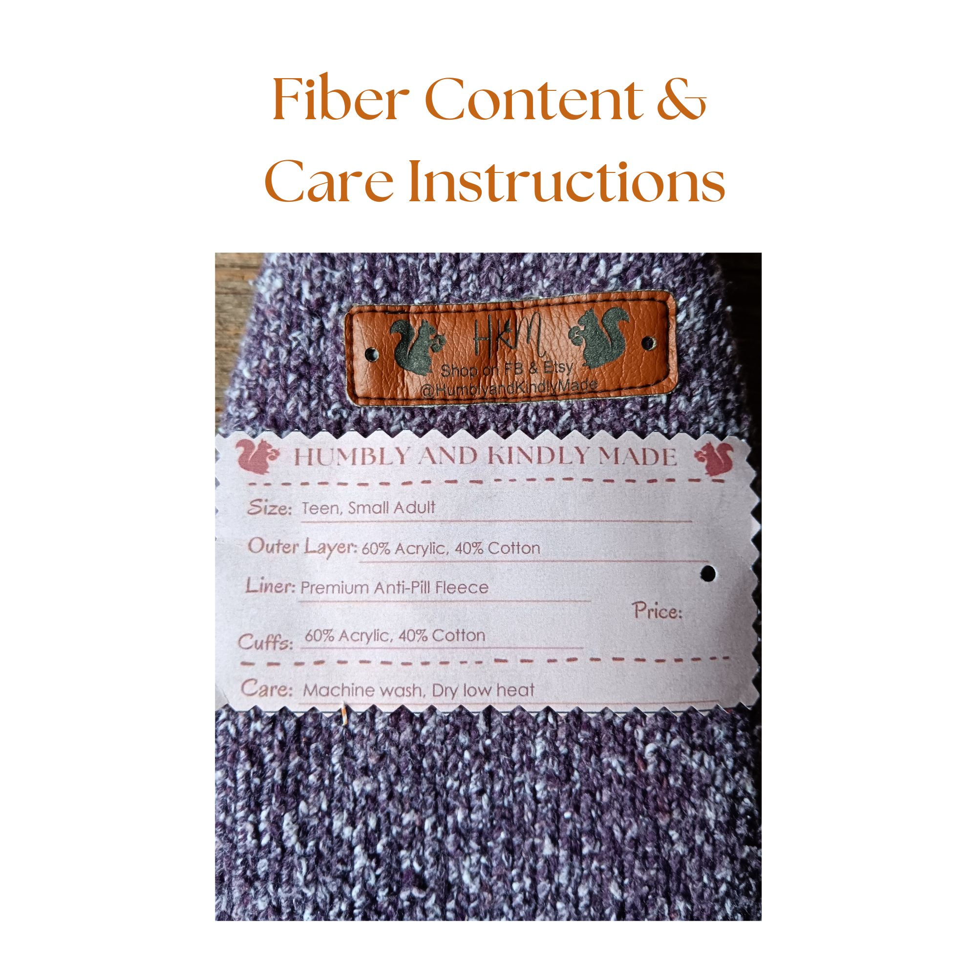 • Cuffs: Upcycled sweater cuffs (60% acrylic, 40% cotton) for a snug and comfortable fit.