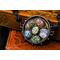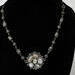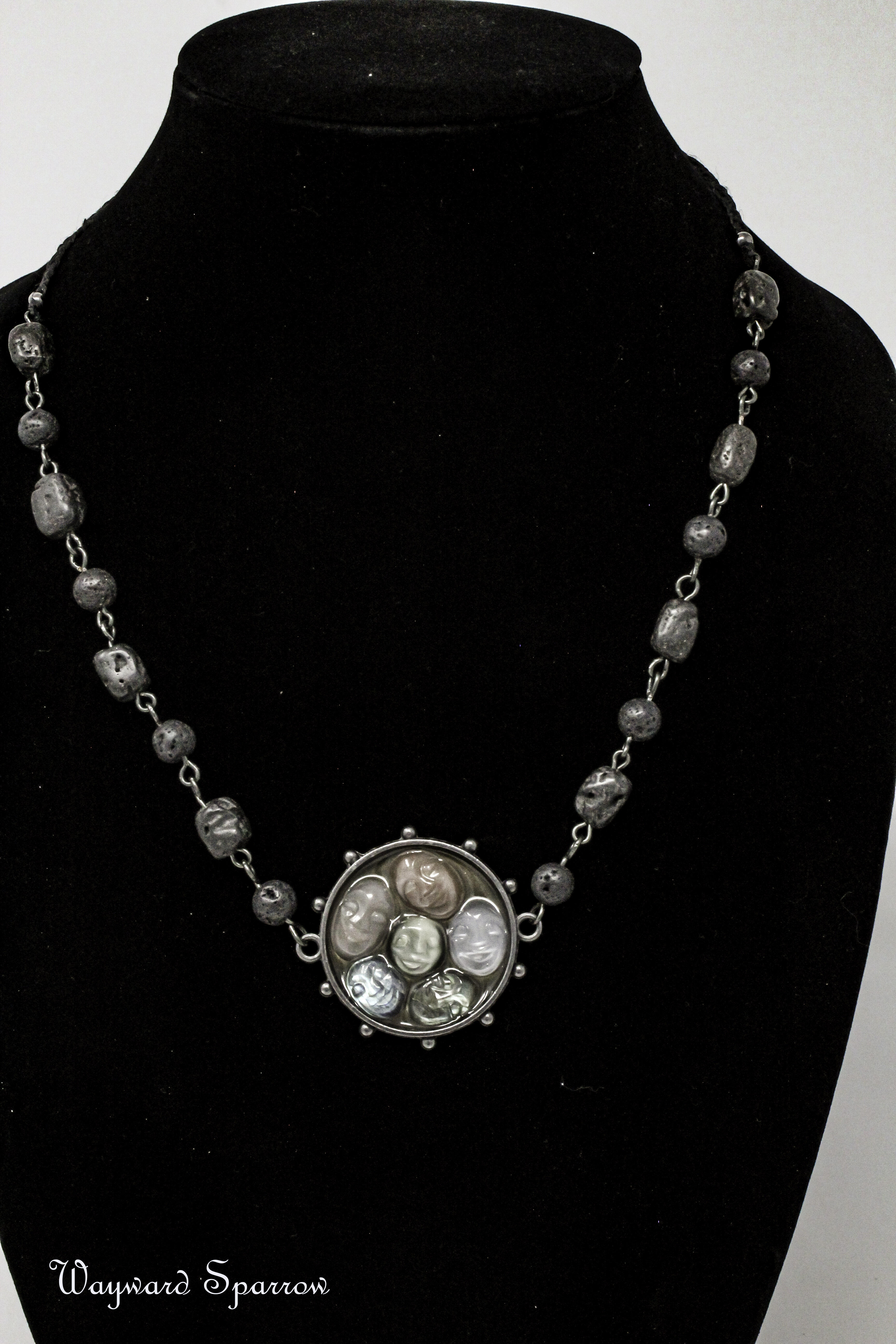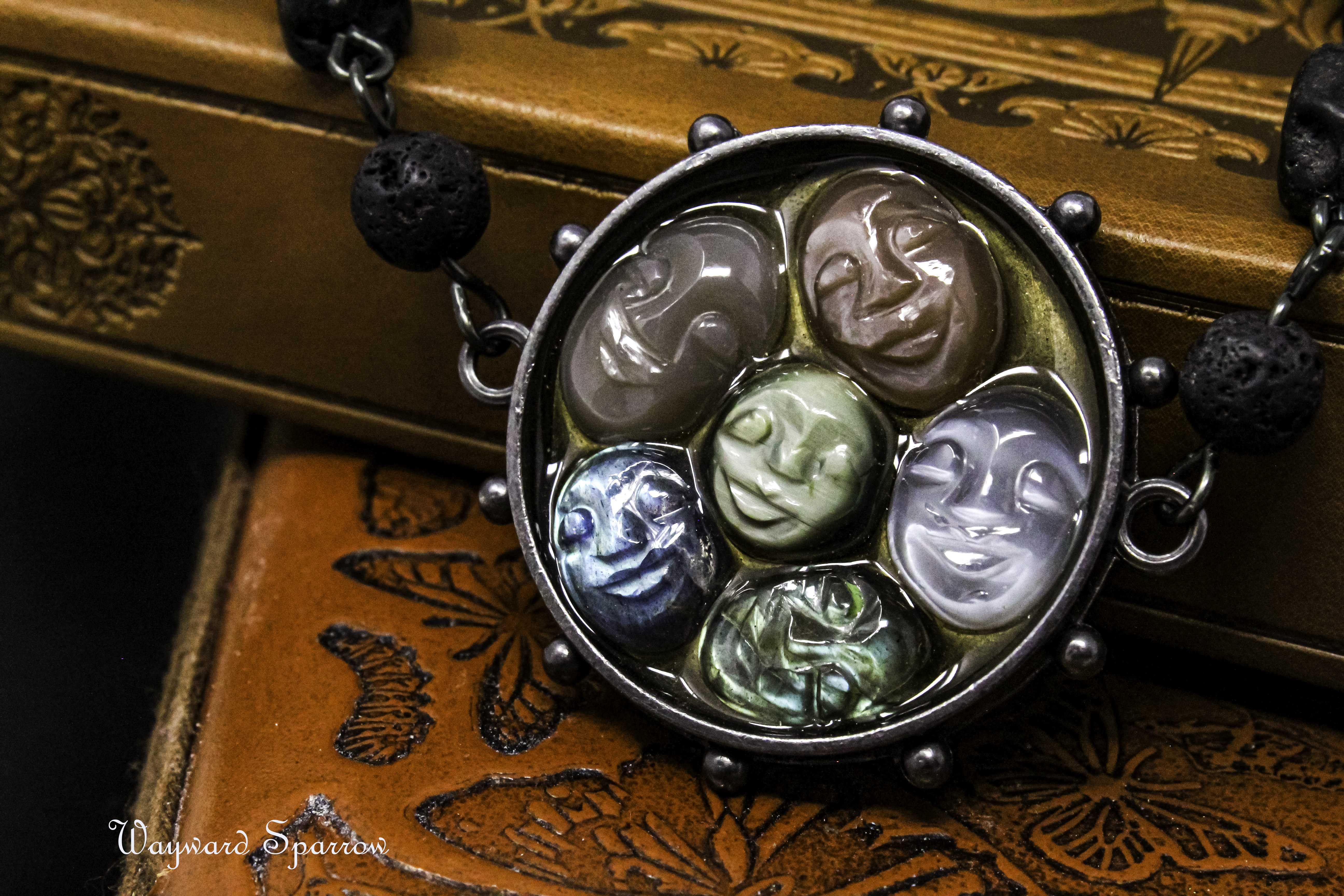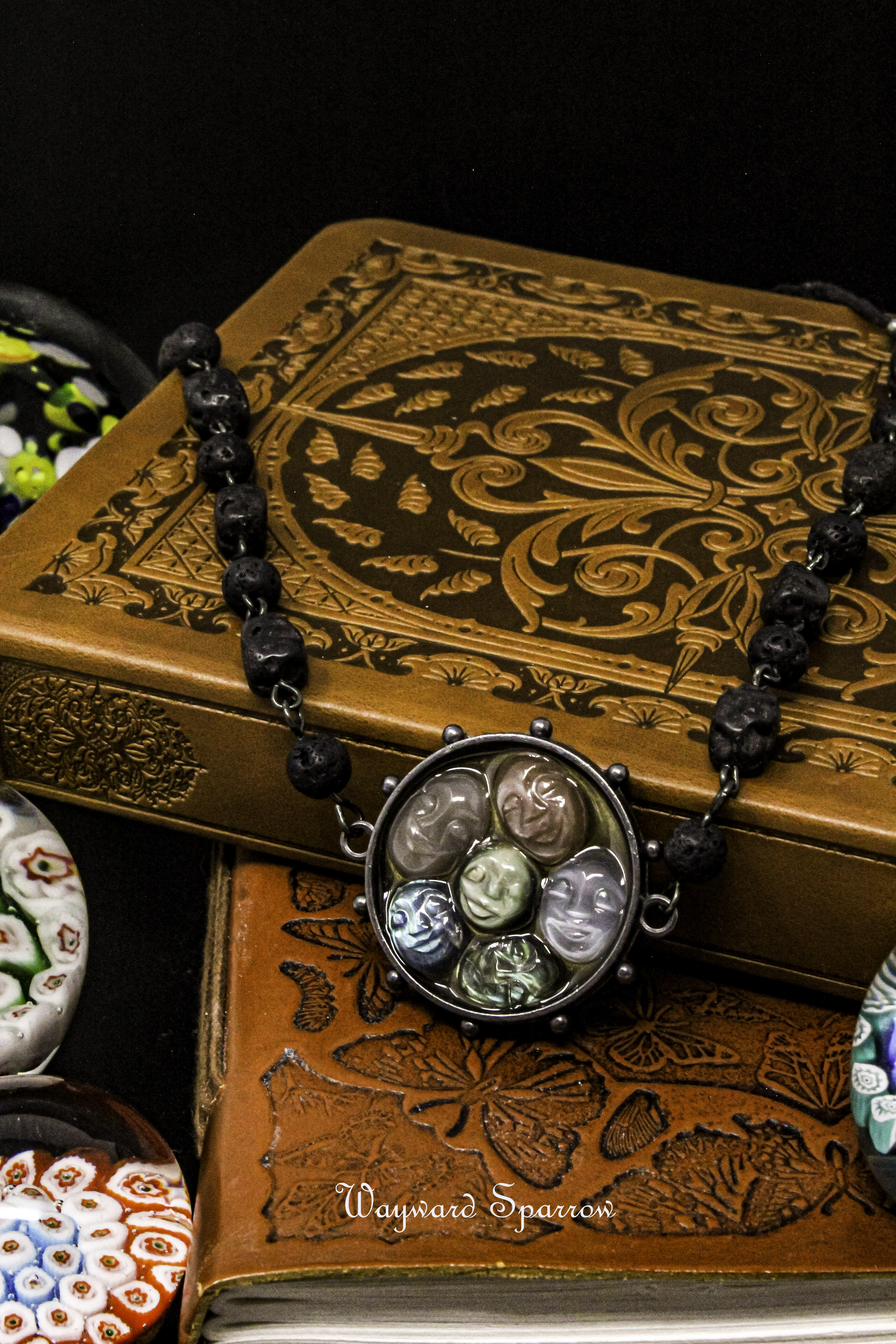 This statement necklace is a great reminder to smile! Tektite and lave stone are hand linked to a large pendant that has multiple shades of moonstone and labradorite smiling cabochons that are set in resin. Necklace measures 22 inches in length.