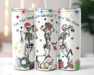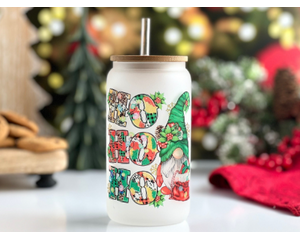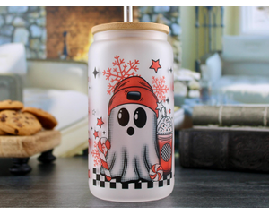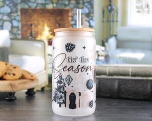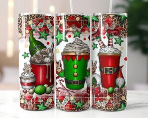 white mug with 4 different Christmas themed  iced coffee cups printed around it. One with candy canes, one with Poinsette, one with a snowman, and one with peppermint candies. Presents, gingerbread man and snowman cookie sit in between the cups.