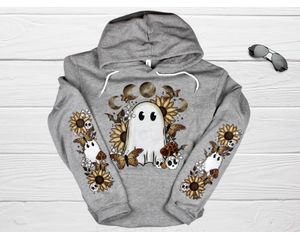 Boho Fall Moon Phase Ghost Hooded Sweatshirt with Sleeve Design