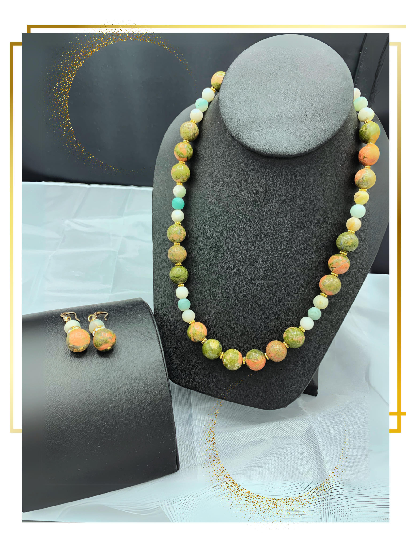 This handmade necklace and earring set is a combination of Mother Nature's color palette meets artisanal craftsmanship. This is not just jewelry, it's wearable geography, capturing the soft green of moss-covered stones, the warm terracotta of the sun-baked earth, and the tranquil blue of hidden forest pools.