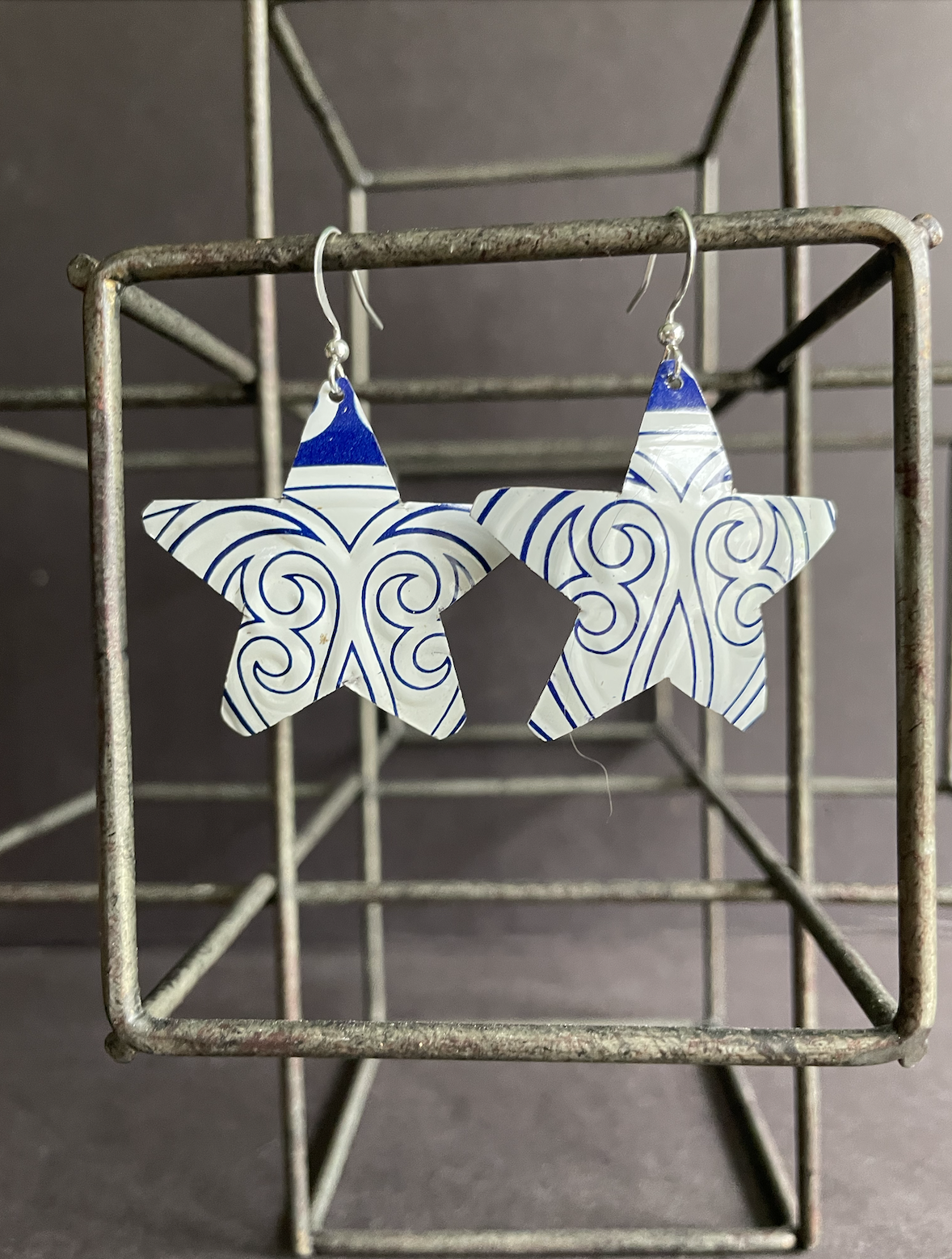 Tins are very light making them ideal for earrings as they don't weigh down your ears as the day goes on. Did you know the proper term for working with tin is "tinkering"? That made me really happy. I literally tinker in my art studio! I use old cookie tins, tea tins, and the like, break them down, and hand cut them into shapes and hand-hammer them into the 3-D shape I want them to be, finish and polish them, before putting them together like any other jewelry.