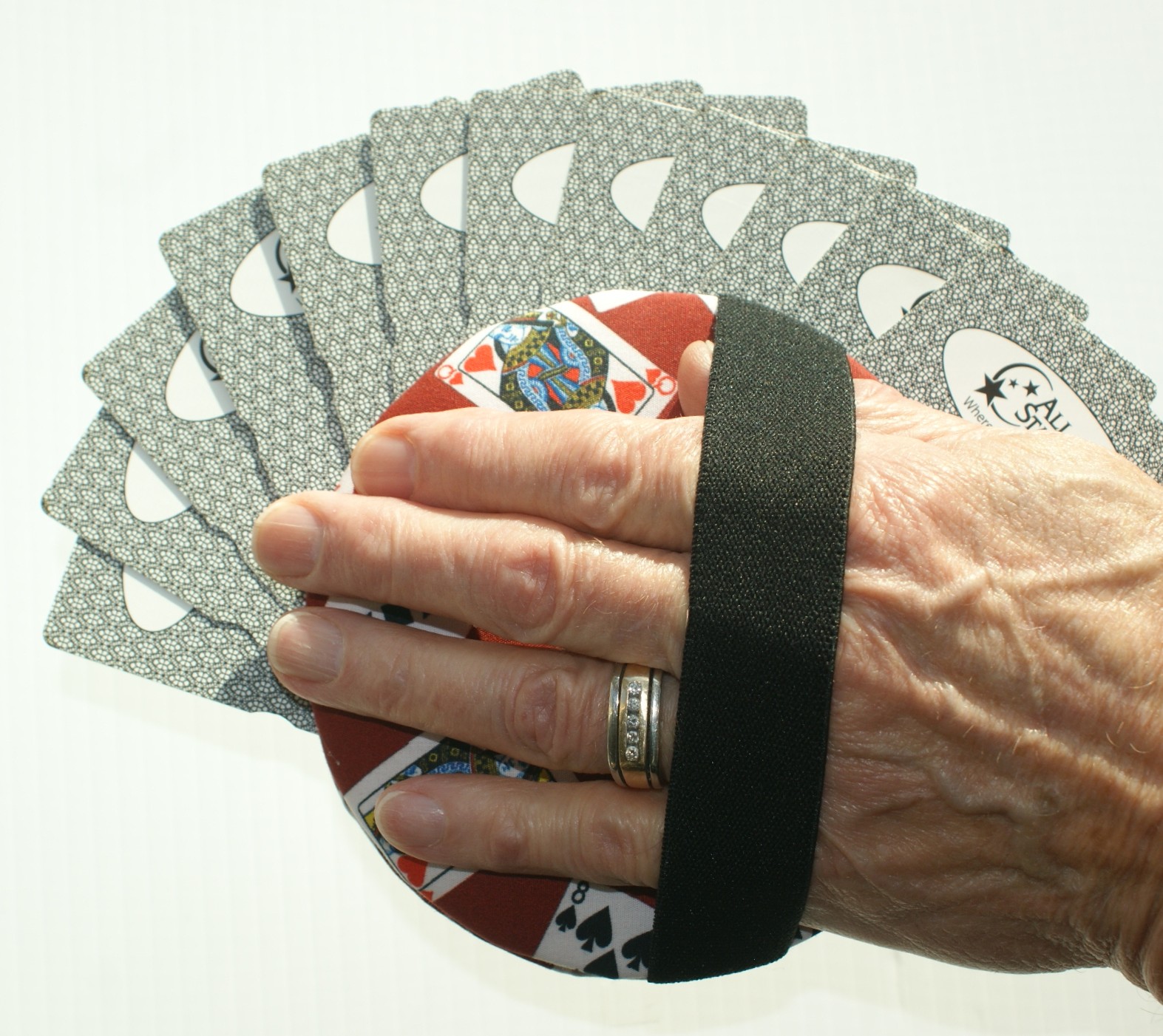 The HAND-AID playing card holders are designed specifically for the person with Parkinson’s, arthritis or other hand issues. Incorporating an elastic strap on the back, it enables that special person to slip the strap over the hand and play their favorite card games again! With the elastic strap, the card player doesn’t actually hold the cards; the HAND-AID does! And not only does it hold the card hand, but it HOLDS ITSELF to the player's hand using the elastic strap! (Be sure to view the photos.)