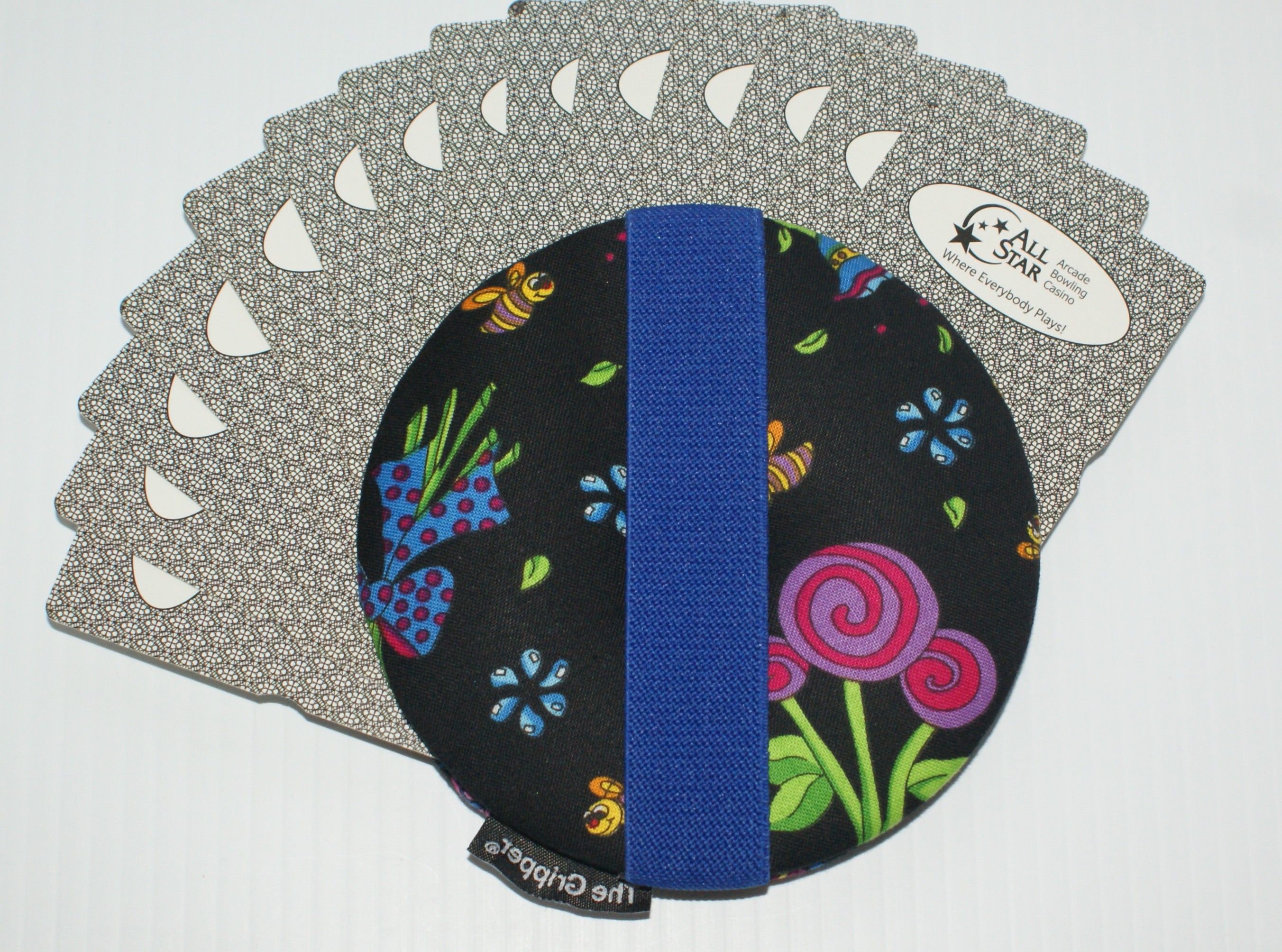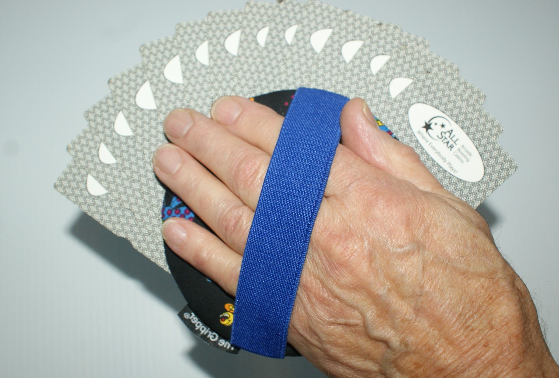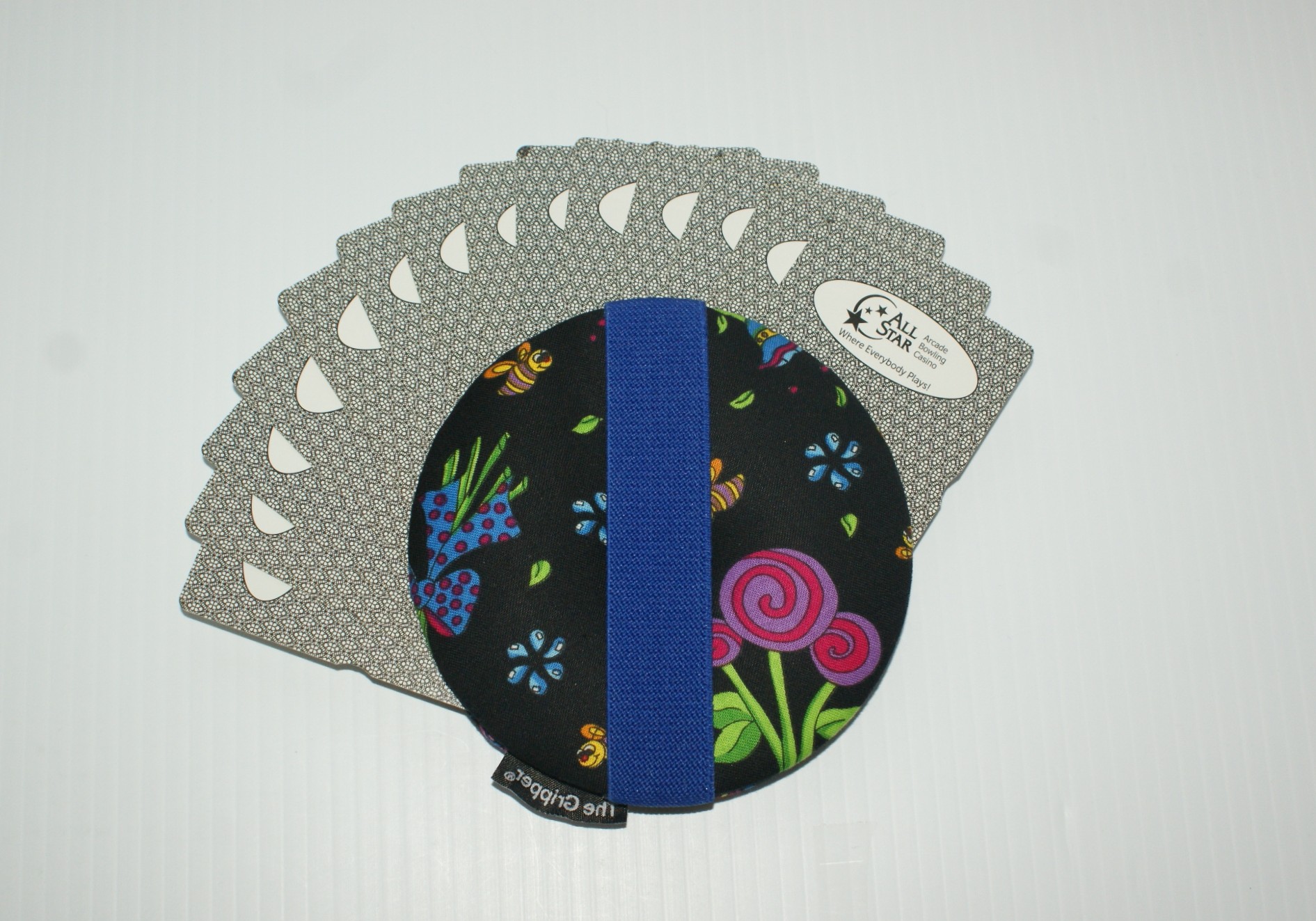 The Hand-Aid playing card holder is a circular card holder with a nice padded feel. I designed it specifically for those with Parkinson’s, arthritis and/or other hand issues.  Incorporating an elastic strap on the back, it enables people who have hand issues to play their favorite card games again! With the elastic strap, the card player doesn’t actually “HOLD” the card hand; the Hand-Aid holds the cards and ITSELF to your hand!