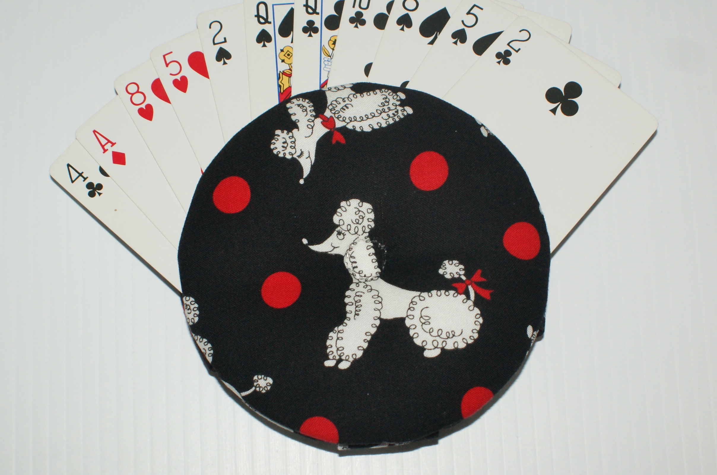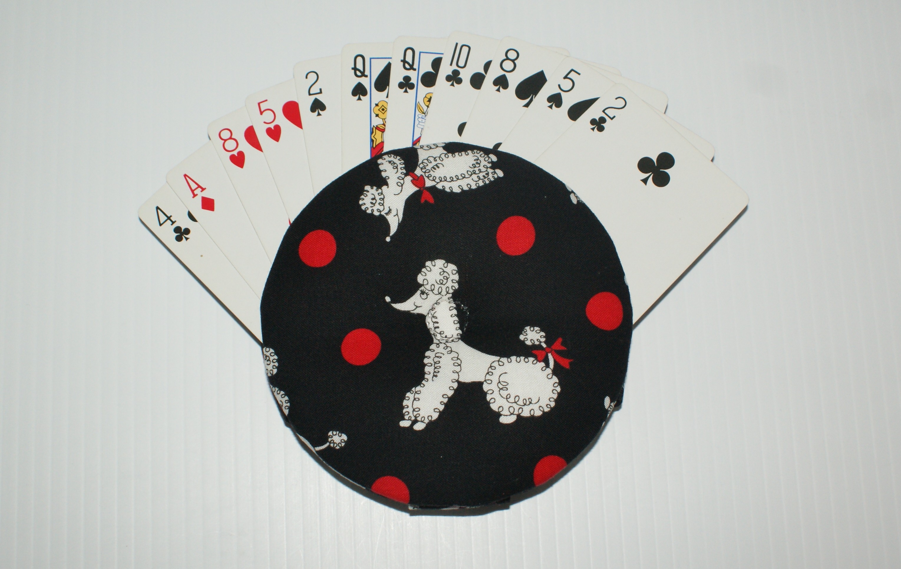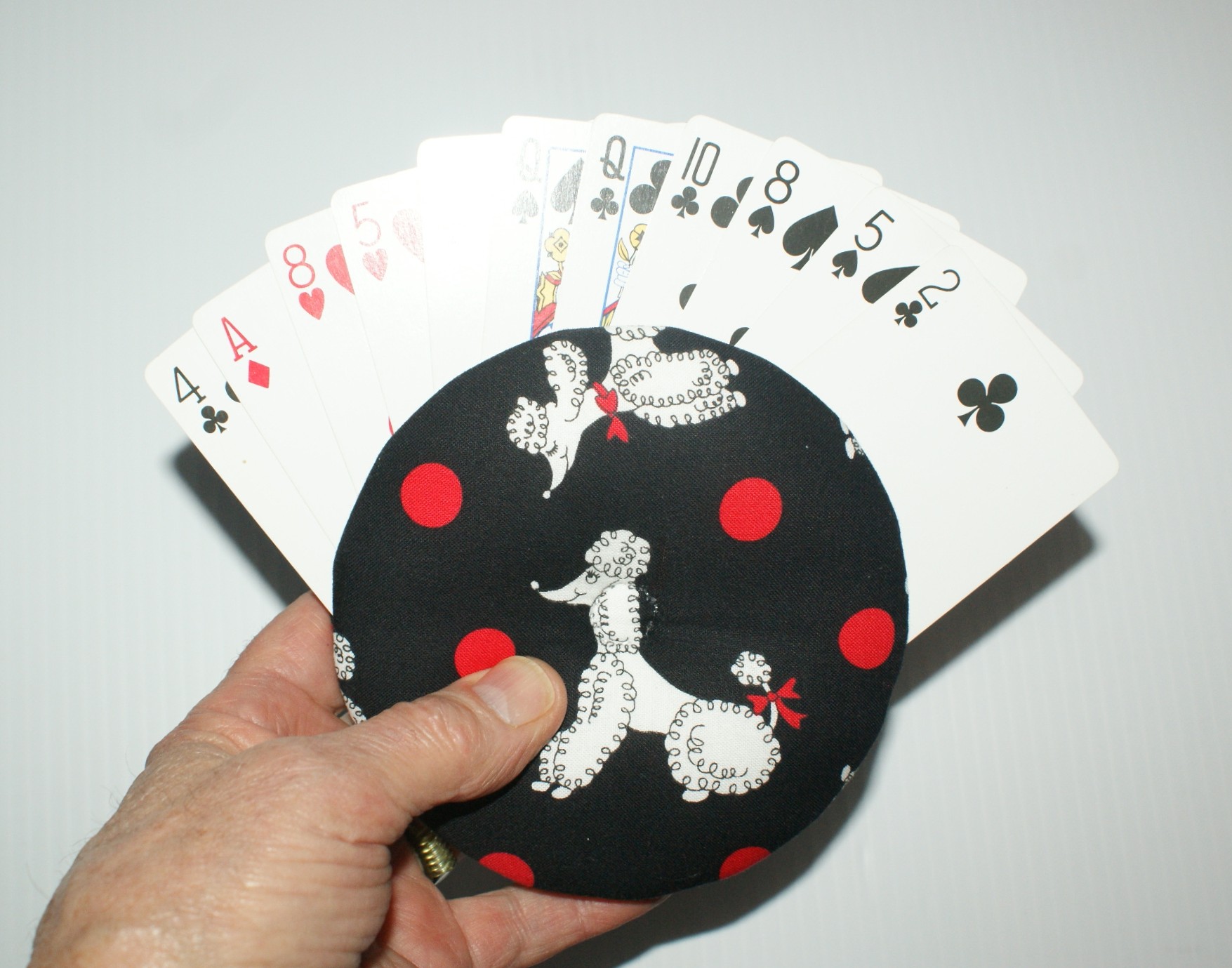 But while we were there I discovered that many retirees loved to play card games. However, I also learned that there were many who had problems holding the cards due to hand issues, way too many cards, etc. So I decided to set out to find a solution. After many trials and errors, I came up with a prototype which, after consulting with my wife (who has done quite a bit of sewing and quilting) I improved upon and set out to test my "invention" at craft fairs. To my surprise, they went over so well that I actually sold out at my first one! I quickly made more that evening and participated in another craft fair where I just about sold out again.