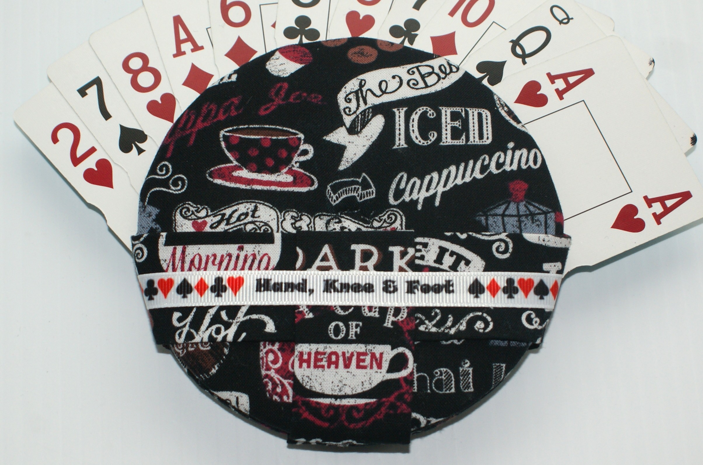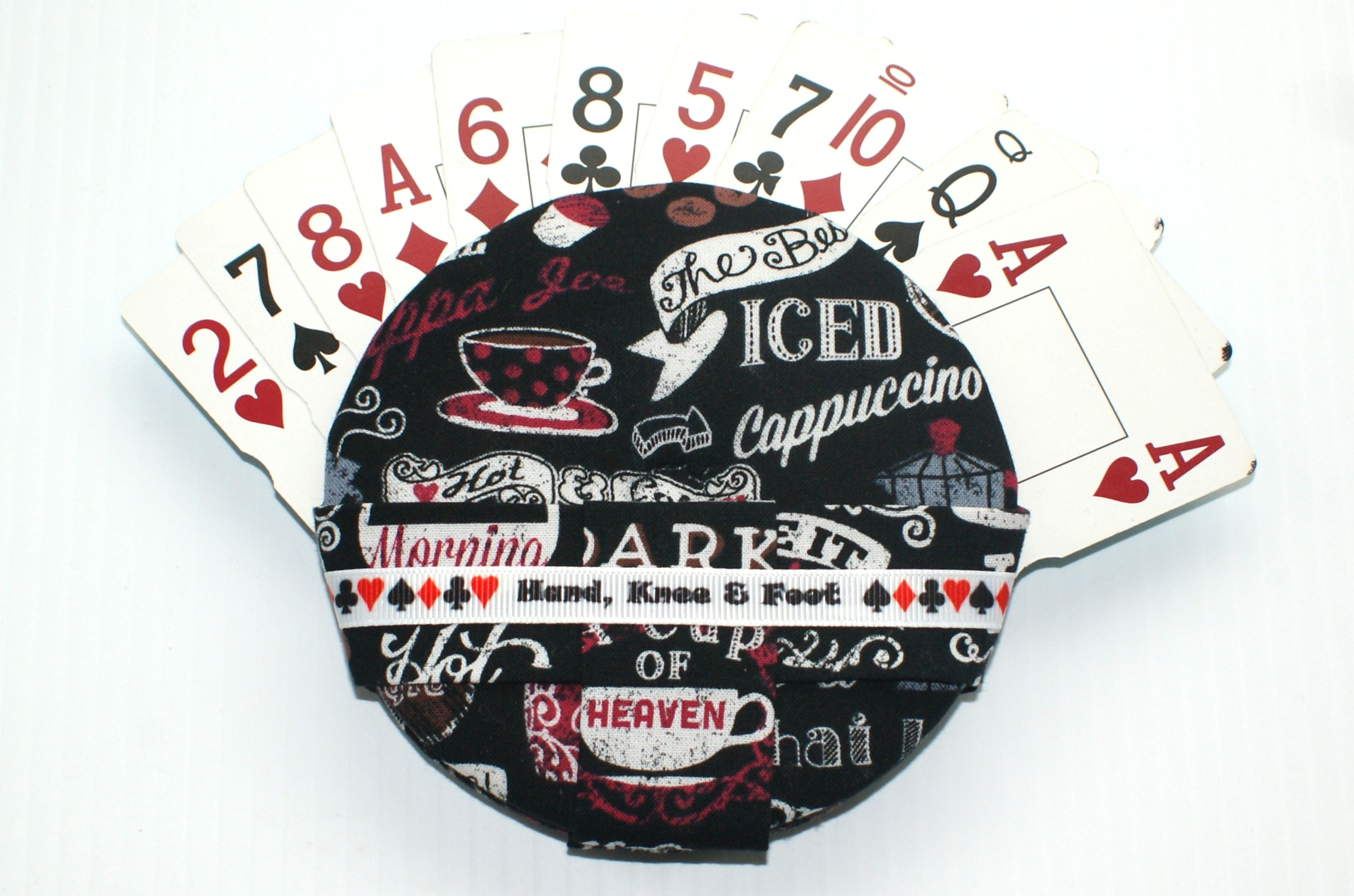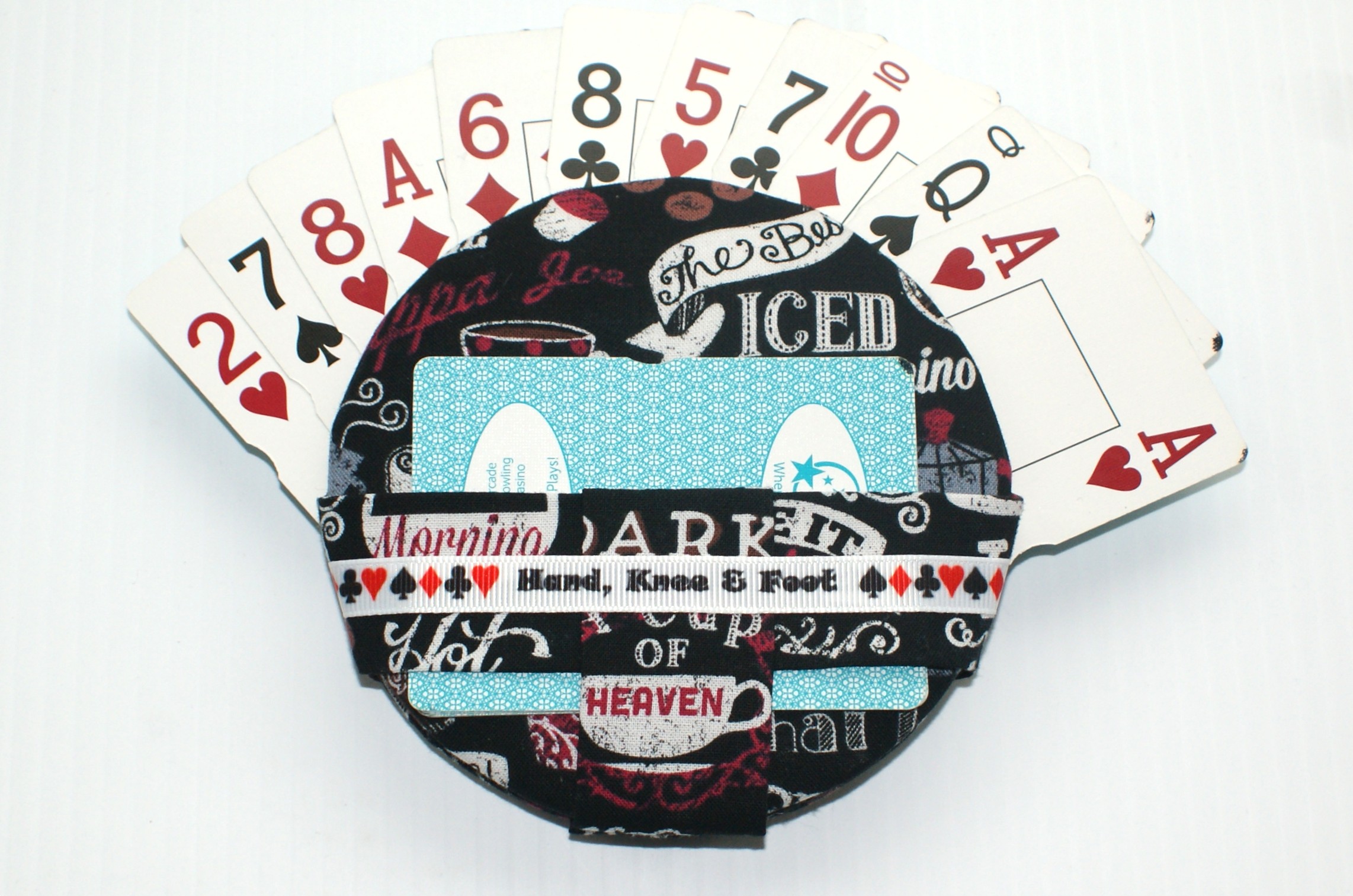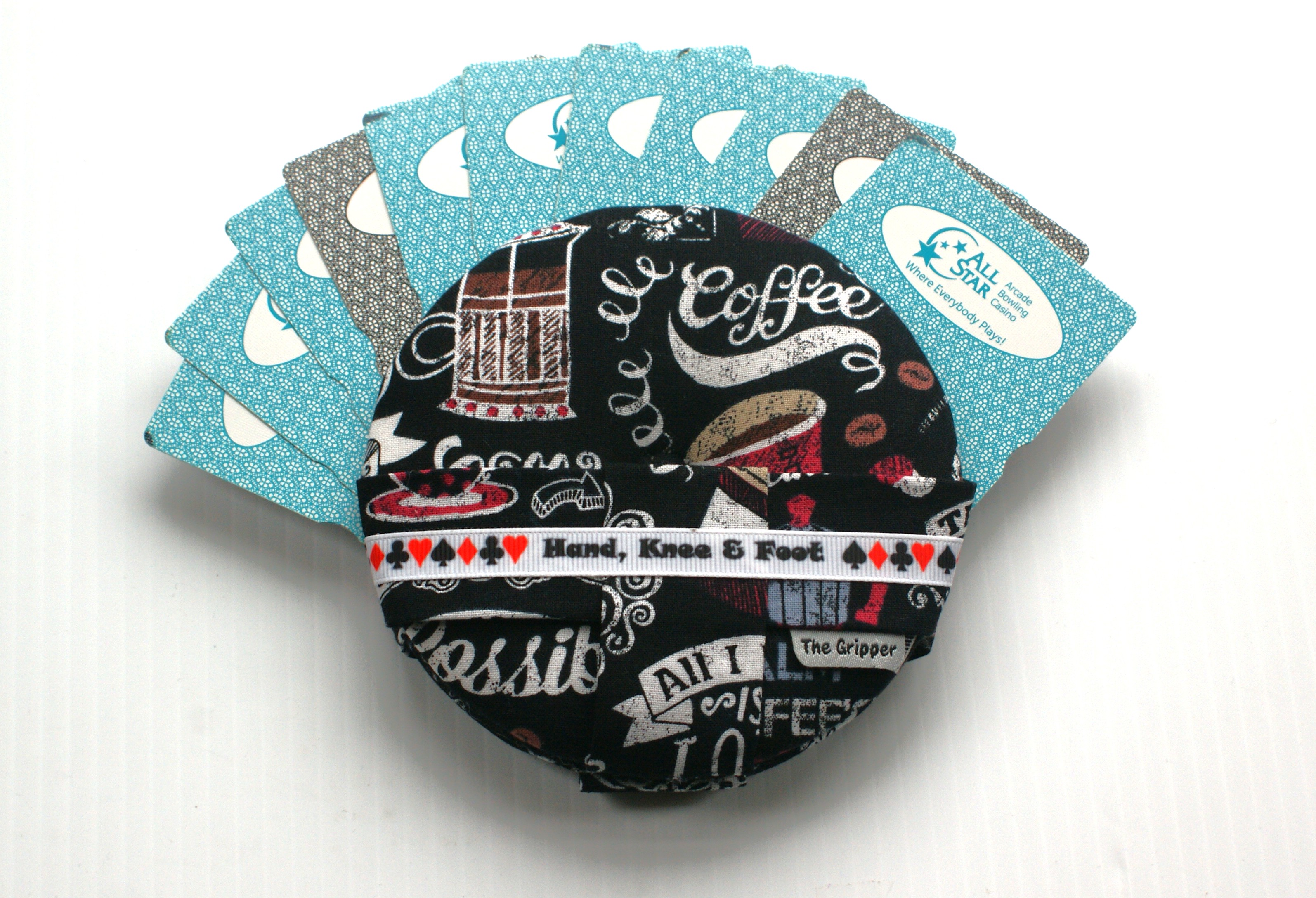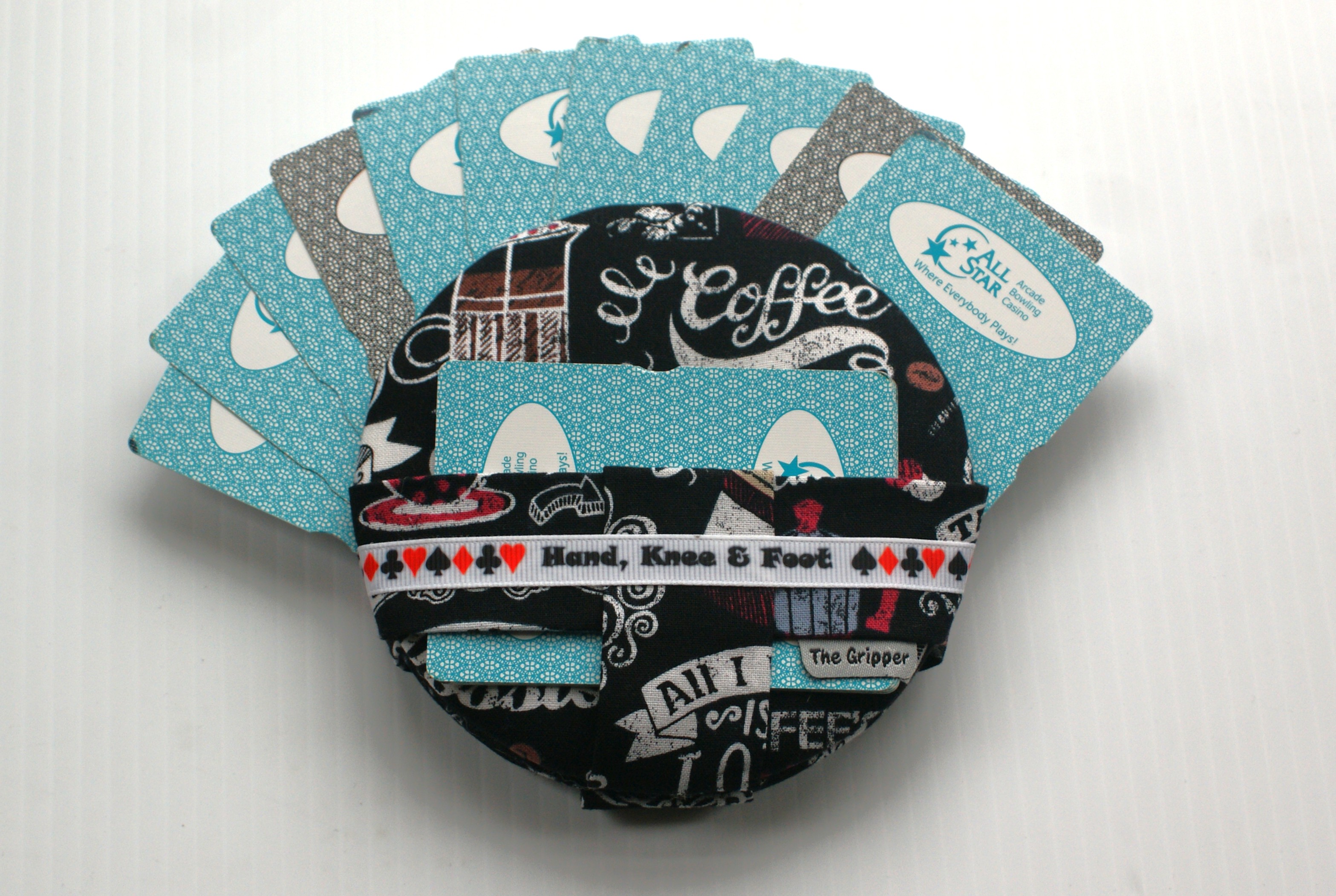 ***NEW! I recently designed a new special Hand, Knee, and Foot ribbon that I'll be using from now on. You can see the ribbon in the photos. Now you've got a special, unique playing card holder dedicated just to Hand, Knee, & Foot! For a game like Hand, Knee, TOE, & Foot, you'll have to hang a pocket around your neck or place the extra cards on the table, as I don't have enough room on my Grippers for another pocket!????