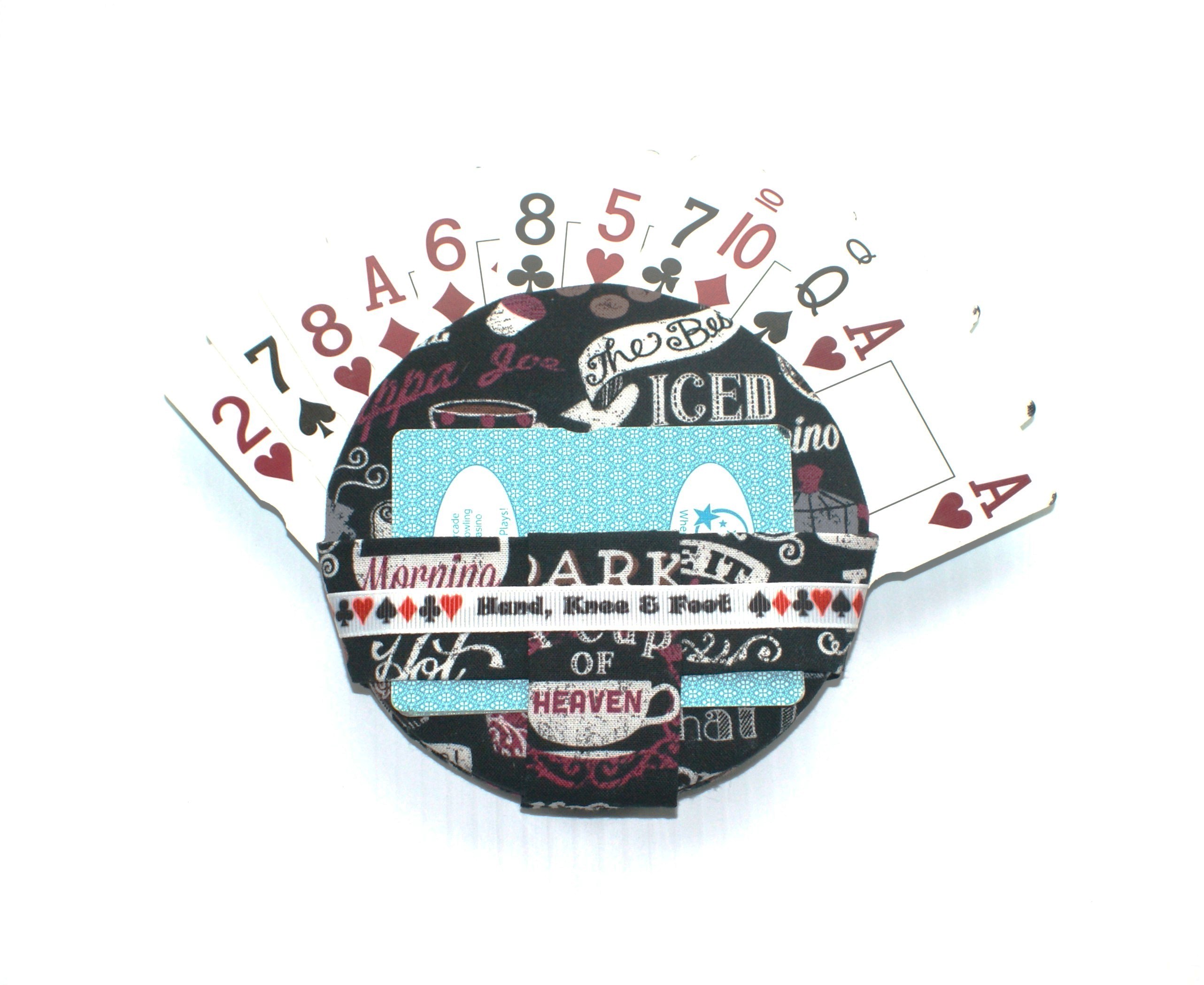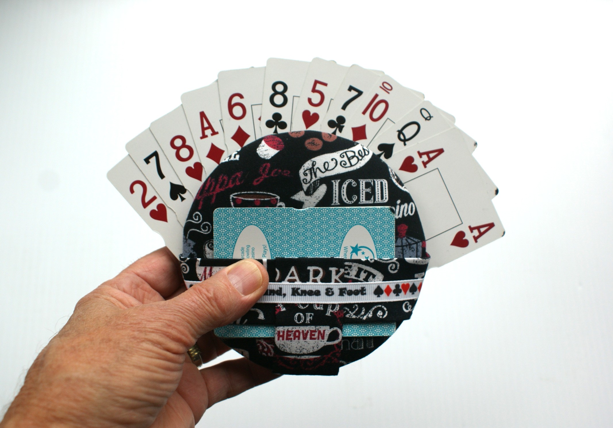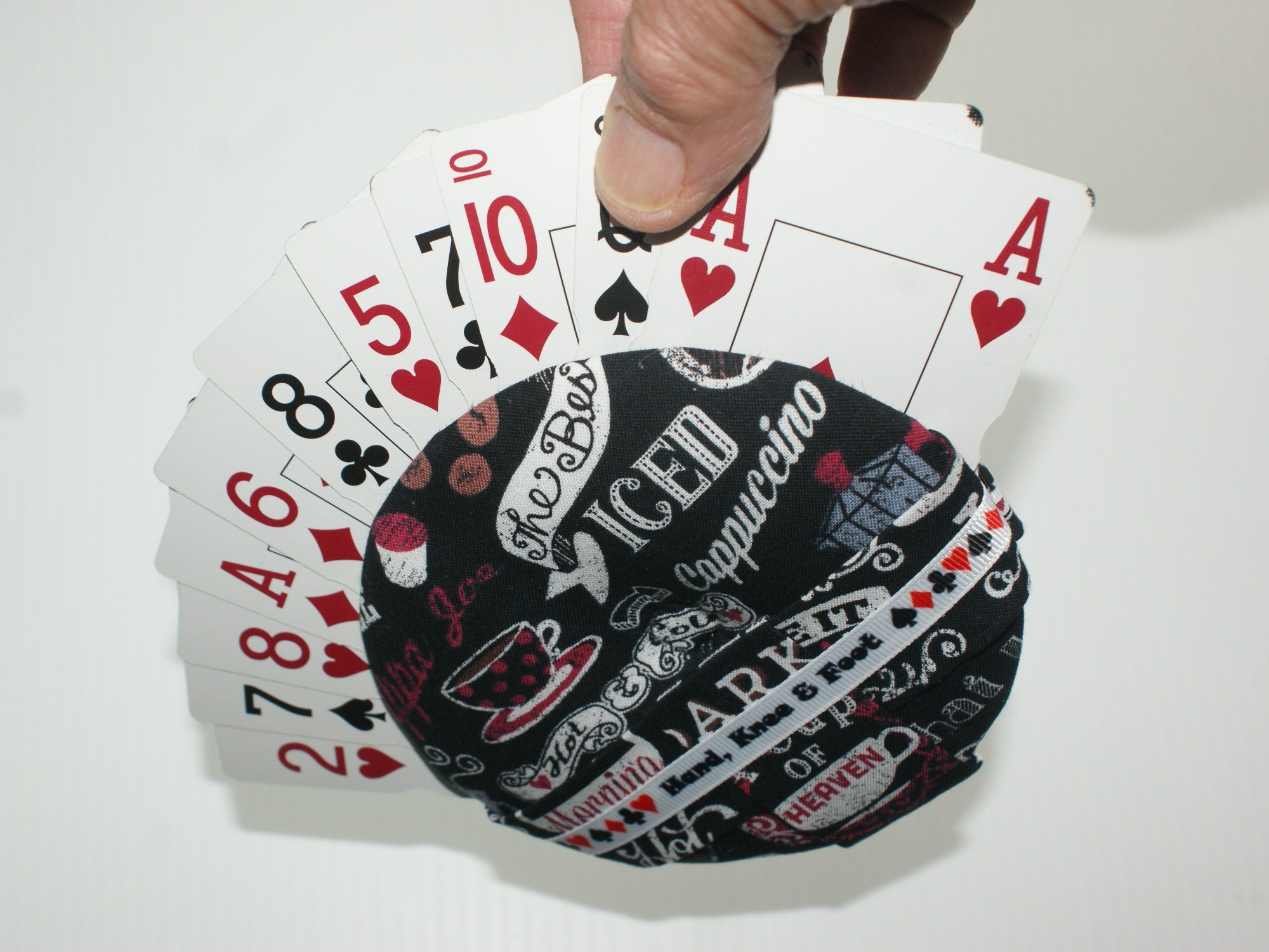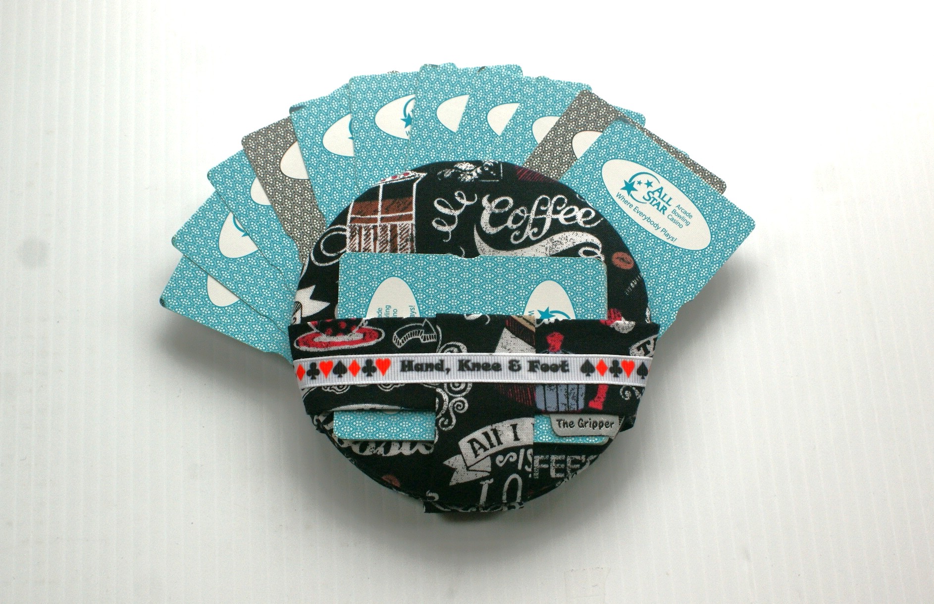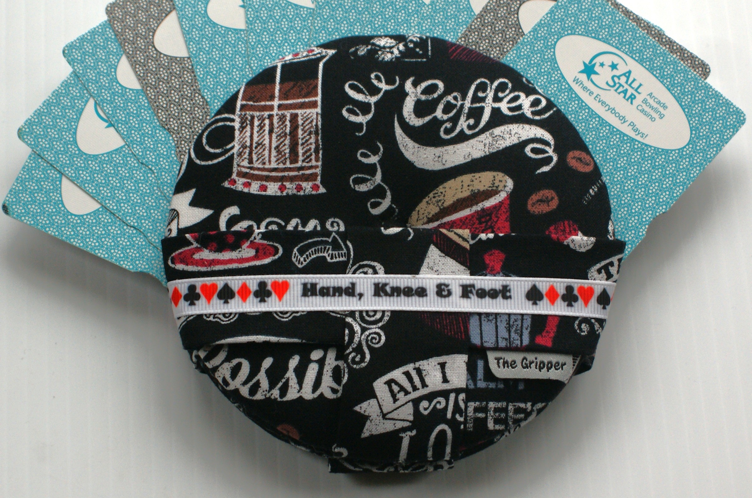 ***NEW! I recently designed a new special Hand, Knee, and Foot ribbon that I'll be using from now on. You can see the ribbon in the photos. Now you've got a special, unique playing card holder dedicated just to Hand, Knee, & Foot! For a game like Hand, Knee, TOE, & Foot, you'll have to hang a pocket around your neck or place the extra cards on the table, as I don't have enough room on my Grippers for another pocket!????