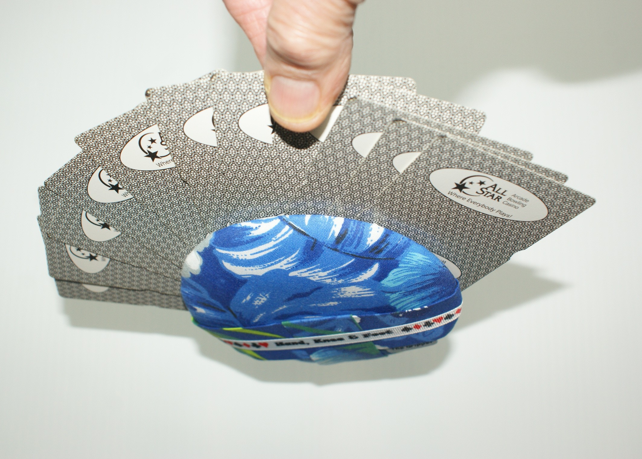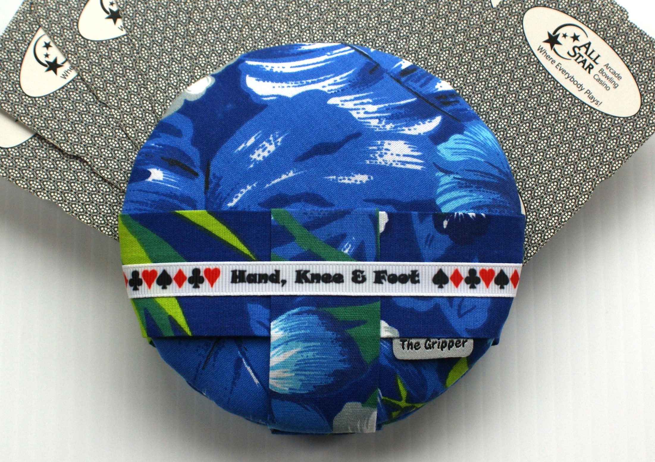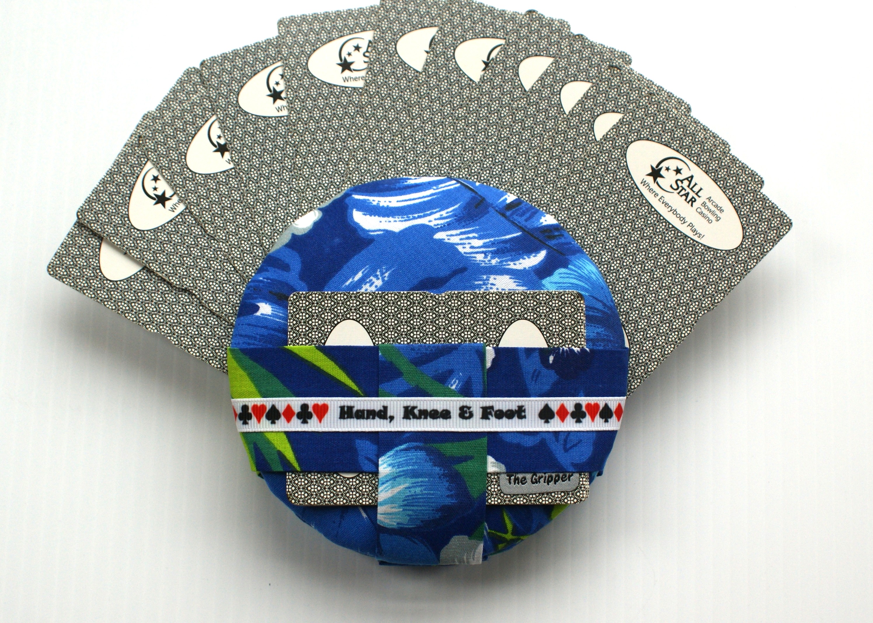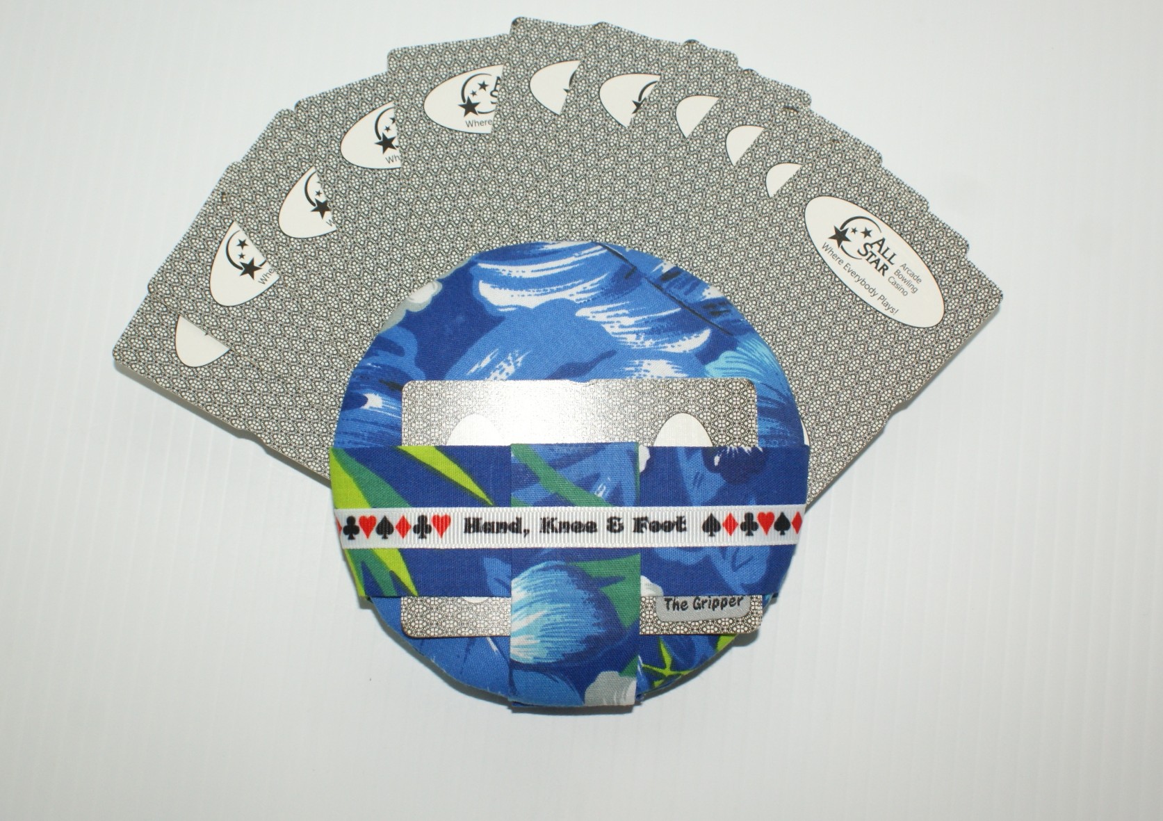 Here's how this unique playing cardholder works: Like all my Gripper playing cardholders, your "Hand" is held in the main holder by inserting the cards one by one between the two halves. Your "Knee" is kept in the pocket designed for it on the front of your cardholder, and your "Foot" is held in the convenient pocket on the back of the holder! (Please refer to the photos.)