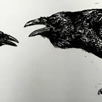 I often find inspiration from a traditional or historic account of the raven. First I decide on my title. Having a title helps me with the image and mood of the piece. Humor is often important but I also select titles that force the viewer to think more about the imagery.