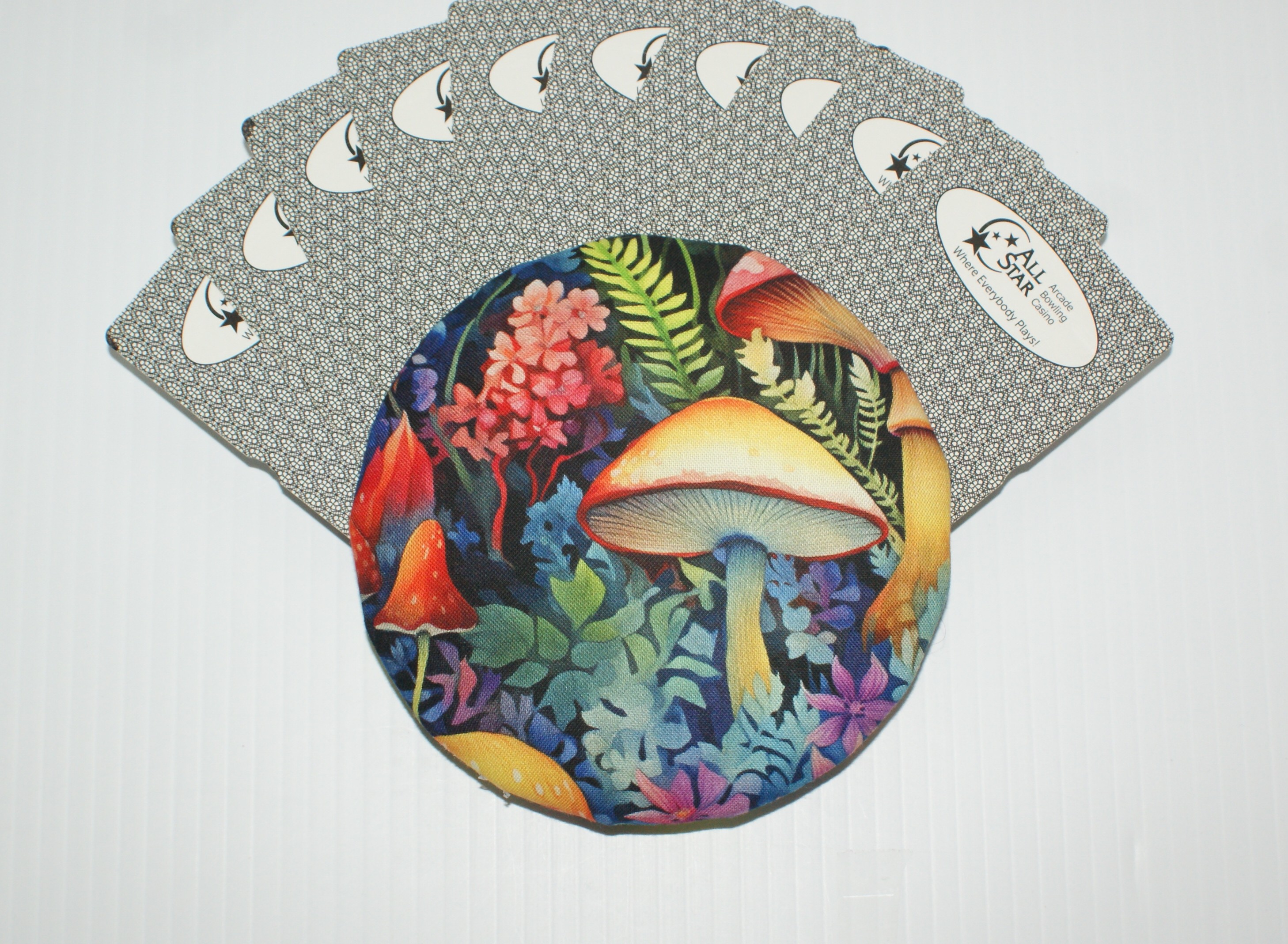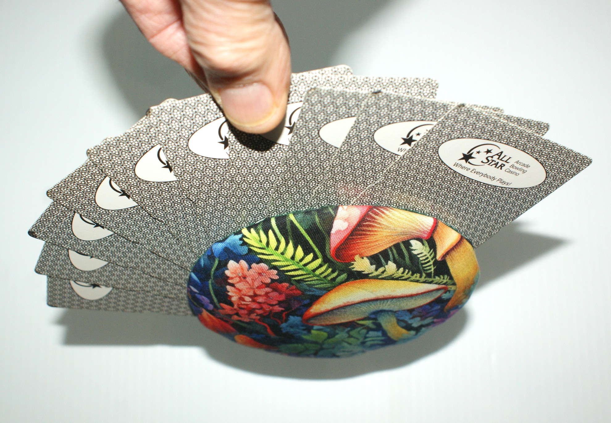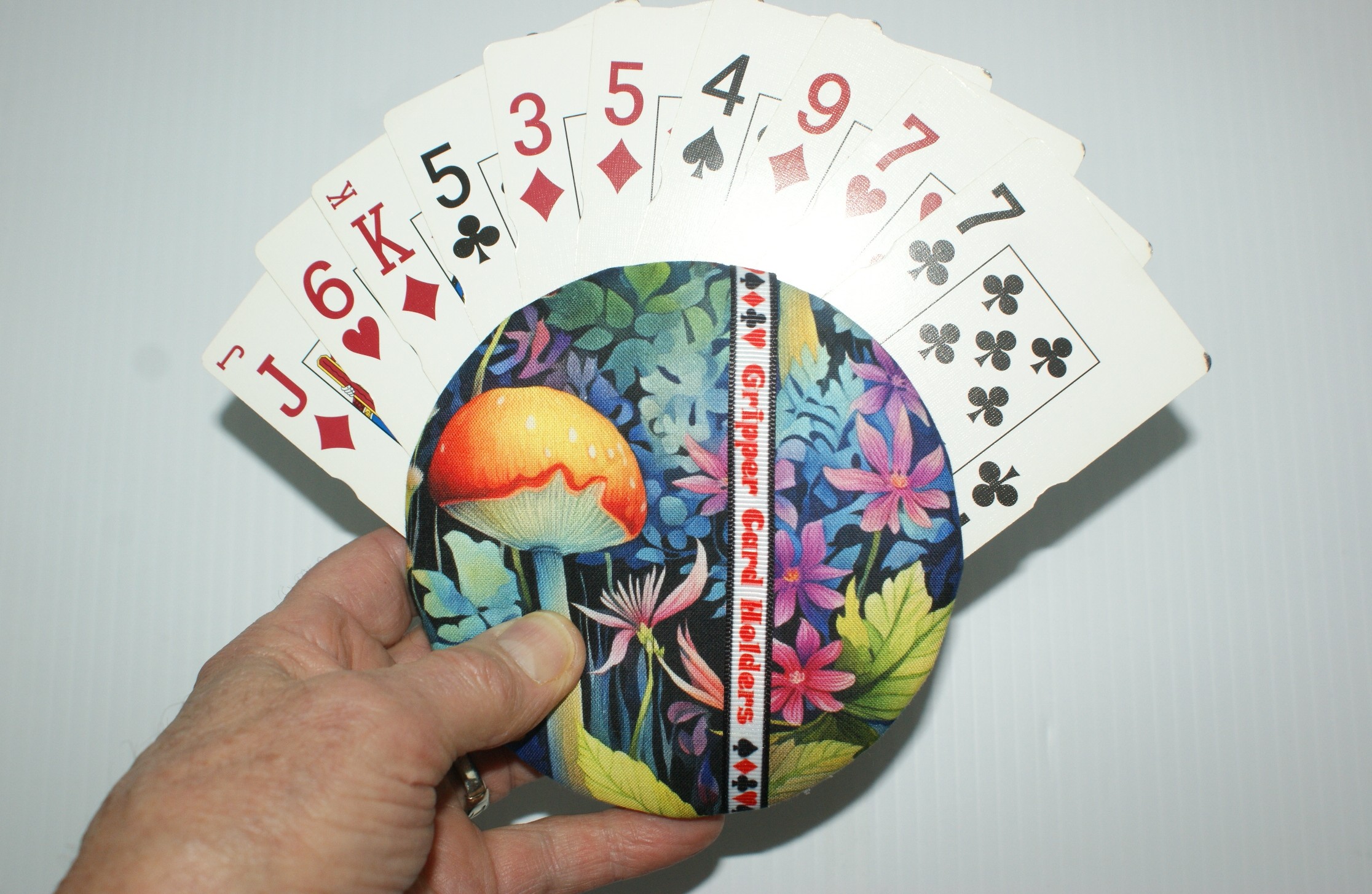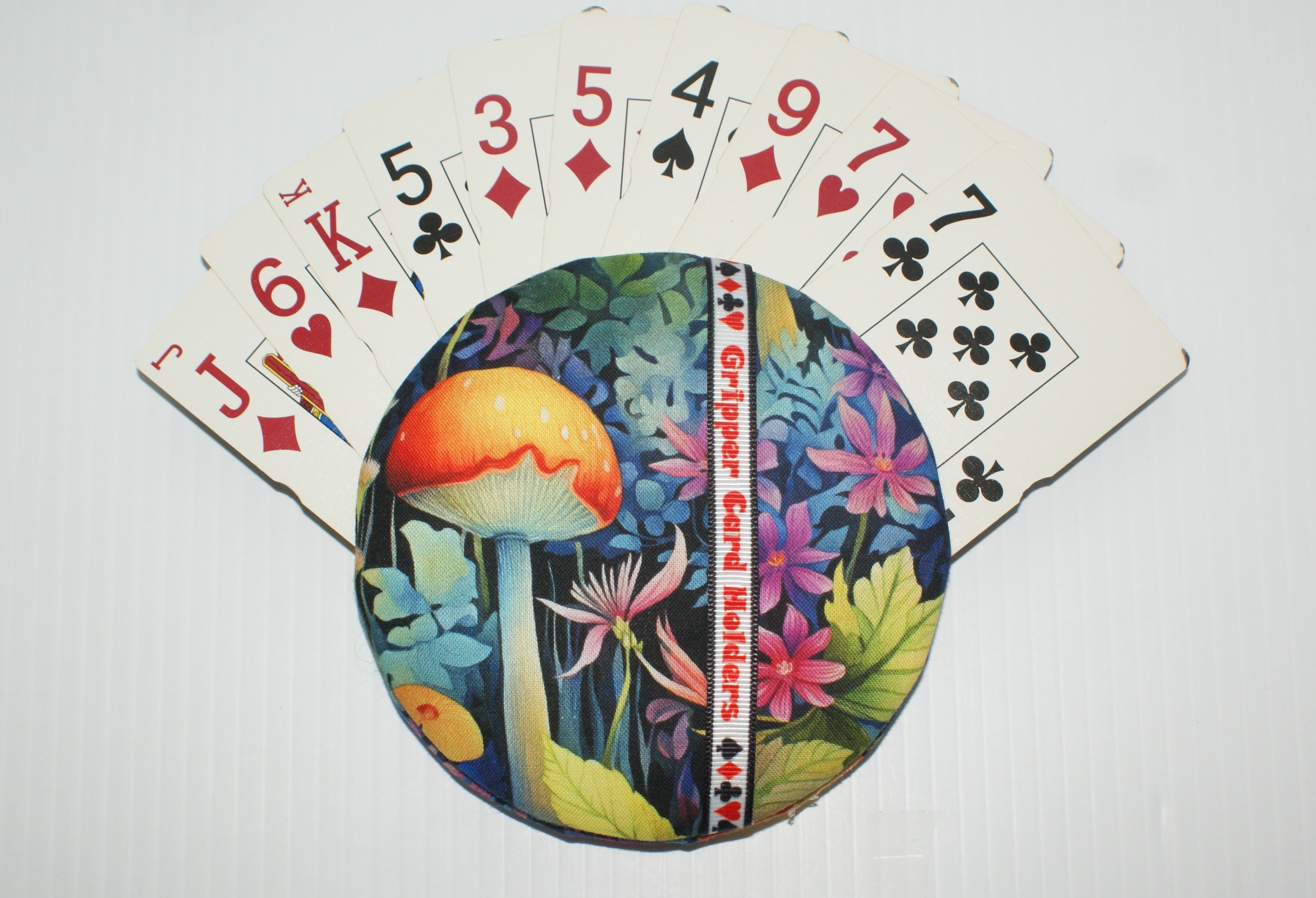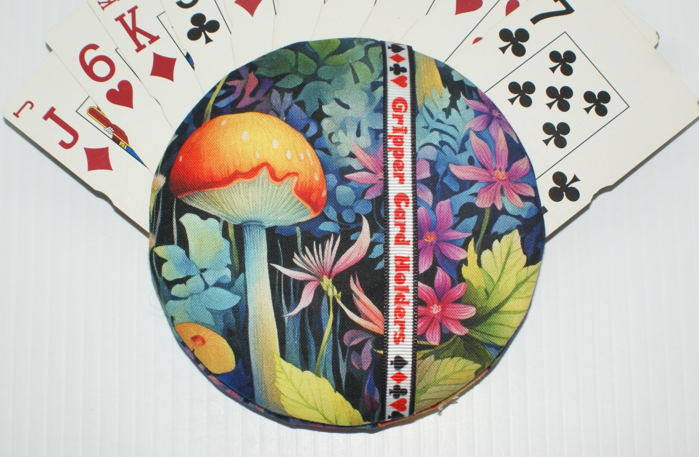 Made with quality materials, I create my Grippers in a little shop located in my backyard. I do it all: buy all the materials needed, prepare everything to be made into one of my unique playing card holders, package and ship them, and do all the advertising needed. Unlike all the imitators out there, all my Grippers are meticulously made with love and great attention to detail. There are many steps involved with each one including but not limited to, making the decision on where to cut the fabric to best fit the image. Also involved is the fabric decision to be used on the back of the holder. I use different types of glues, padding & felt. Due to that, each playing card holder actually takes anywhere from 1 to 2 days to complete. Whew! :o)