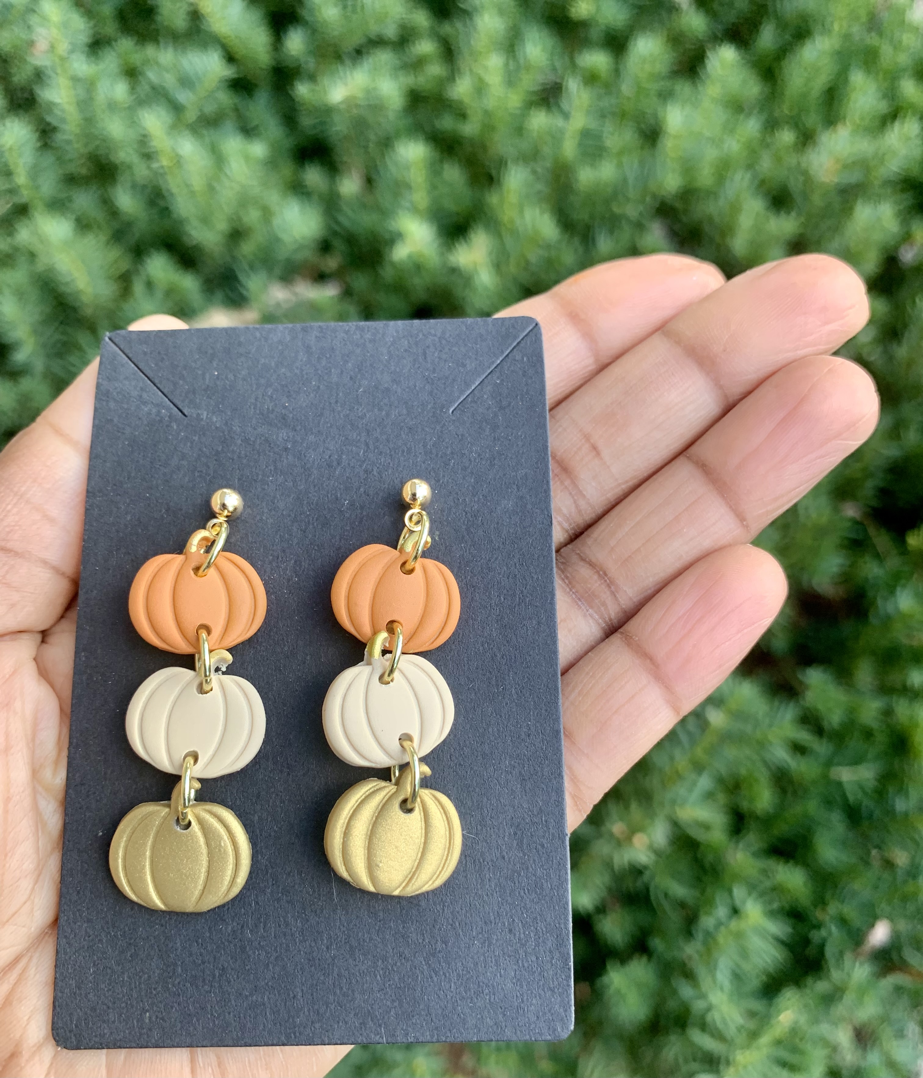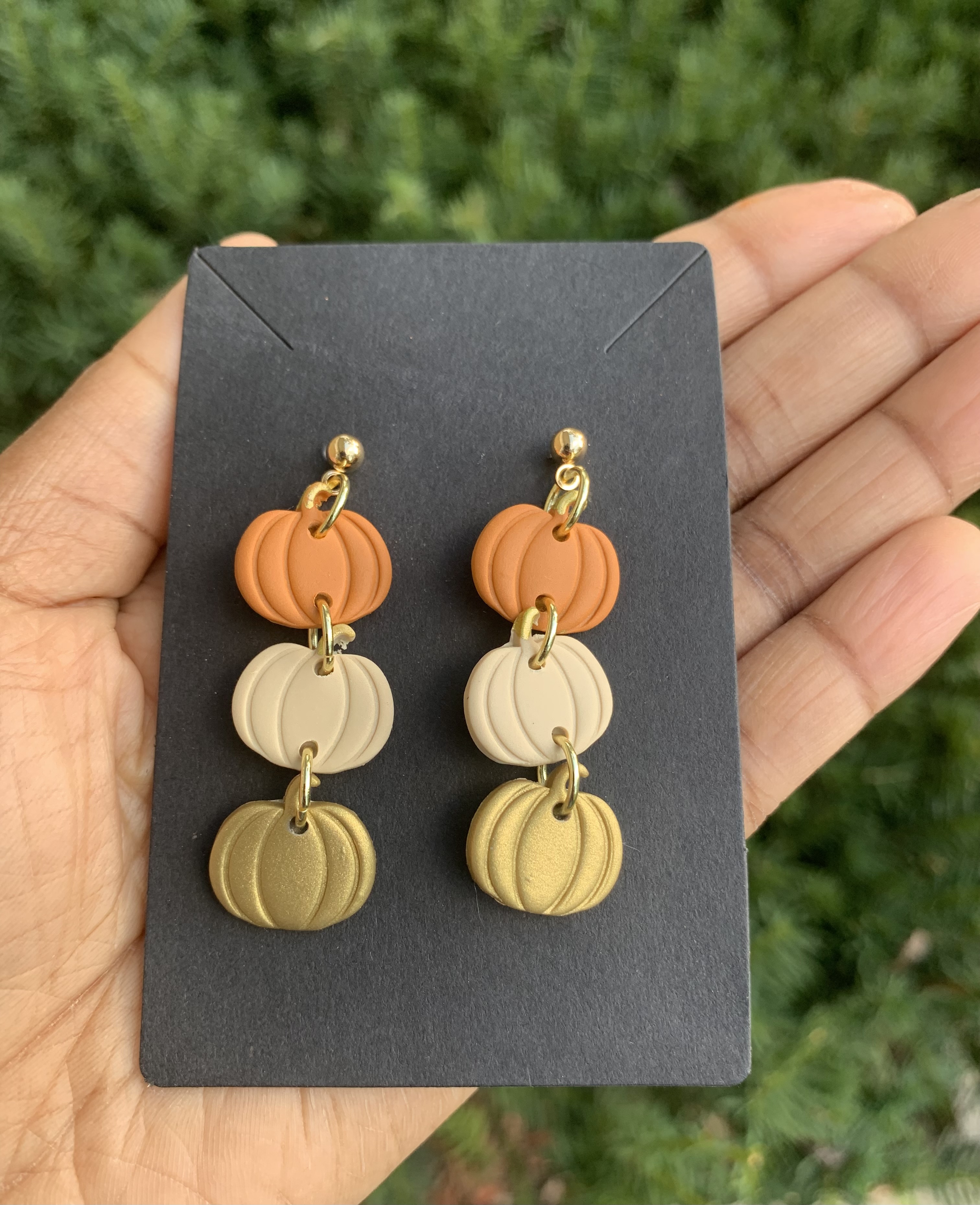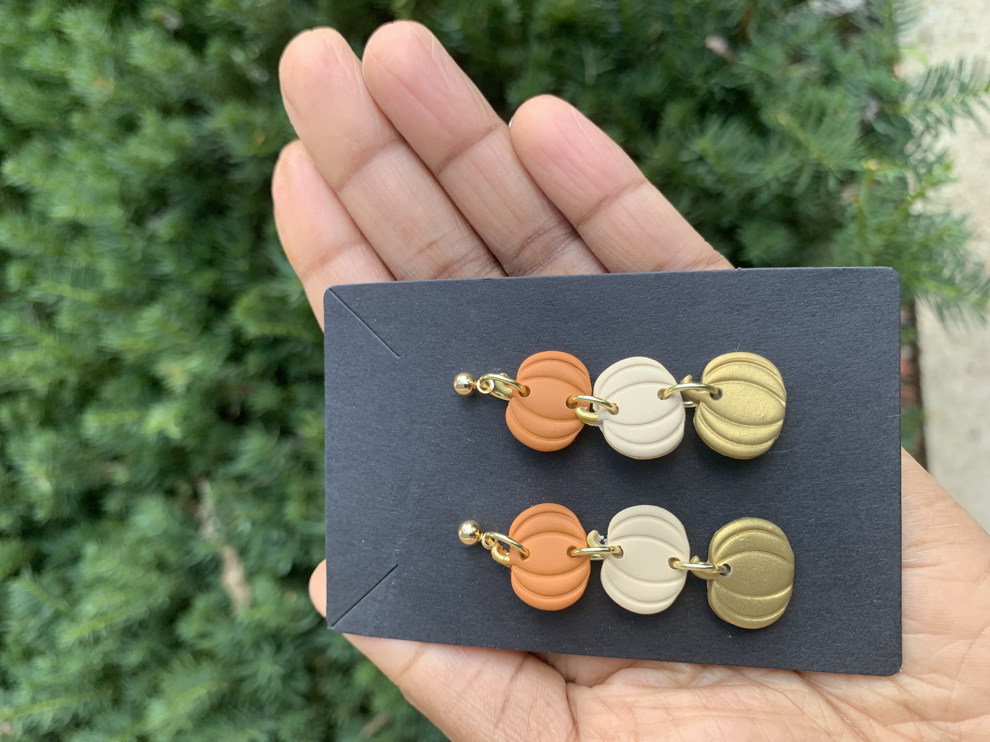 Bring the beauty of autumn to your outfit with these Handmade Mini Triple Pumpkin Dangle Earrings. Each pair is crafted from lightweight polymer clay, featuring a stacked triple-pumpkin in the warm hues of rust orange, khaki and antique gold. These beauties are perfect for the fall season.