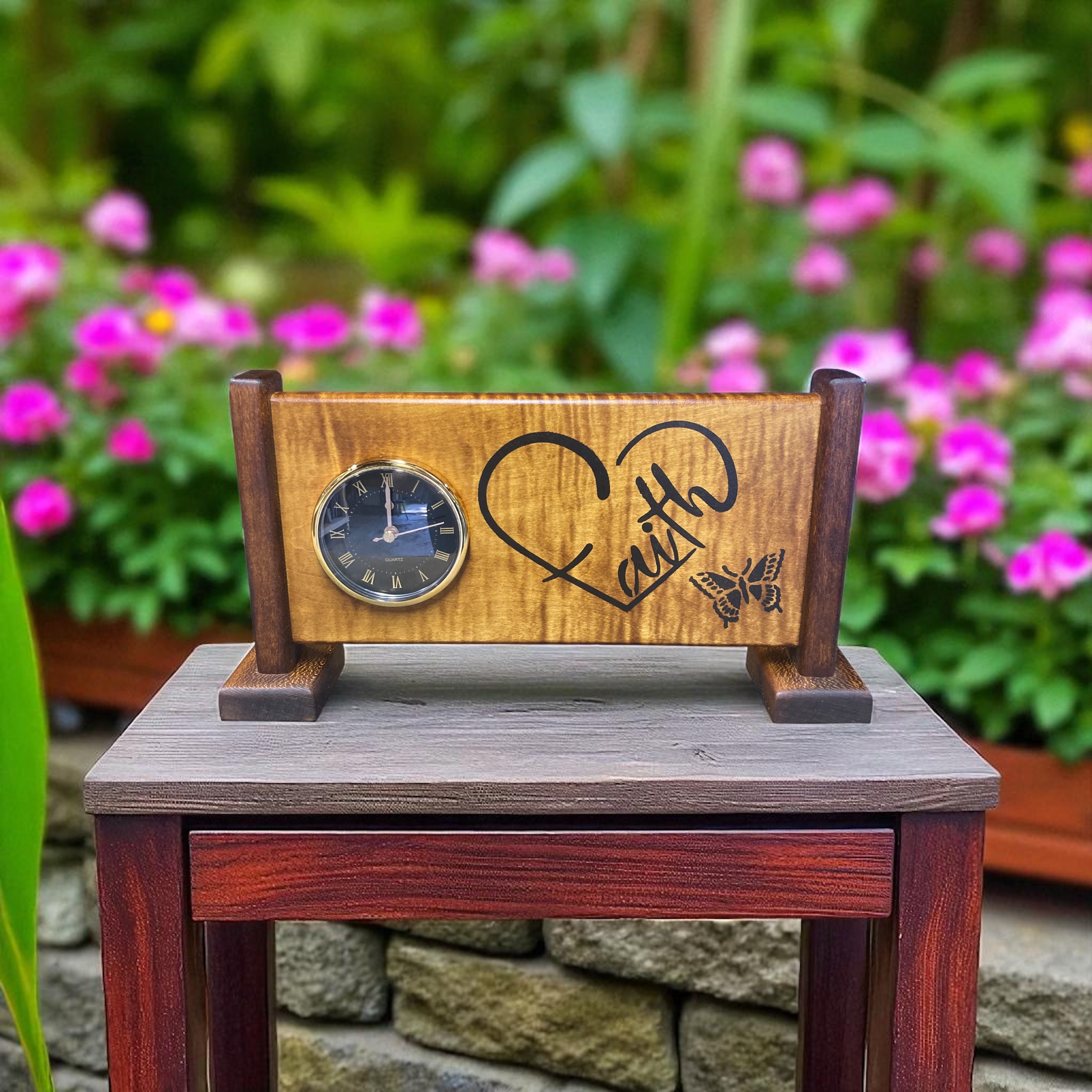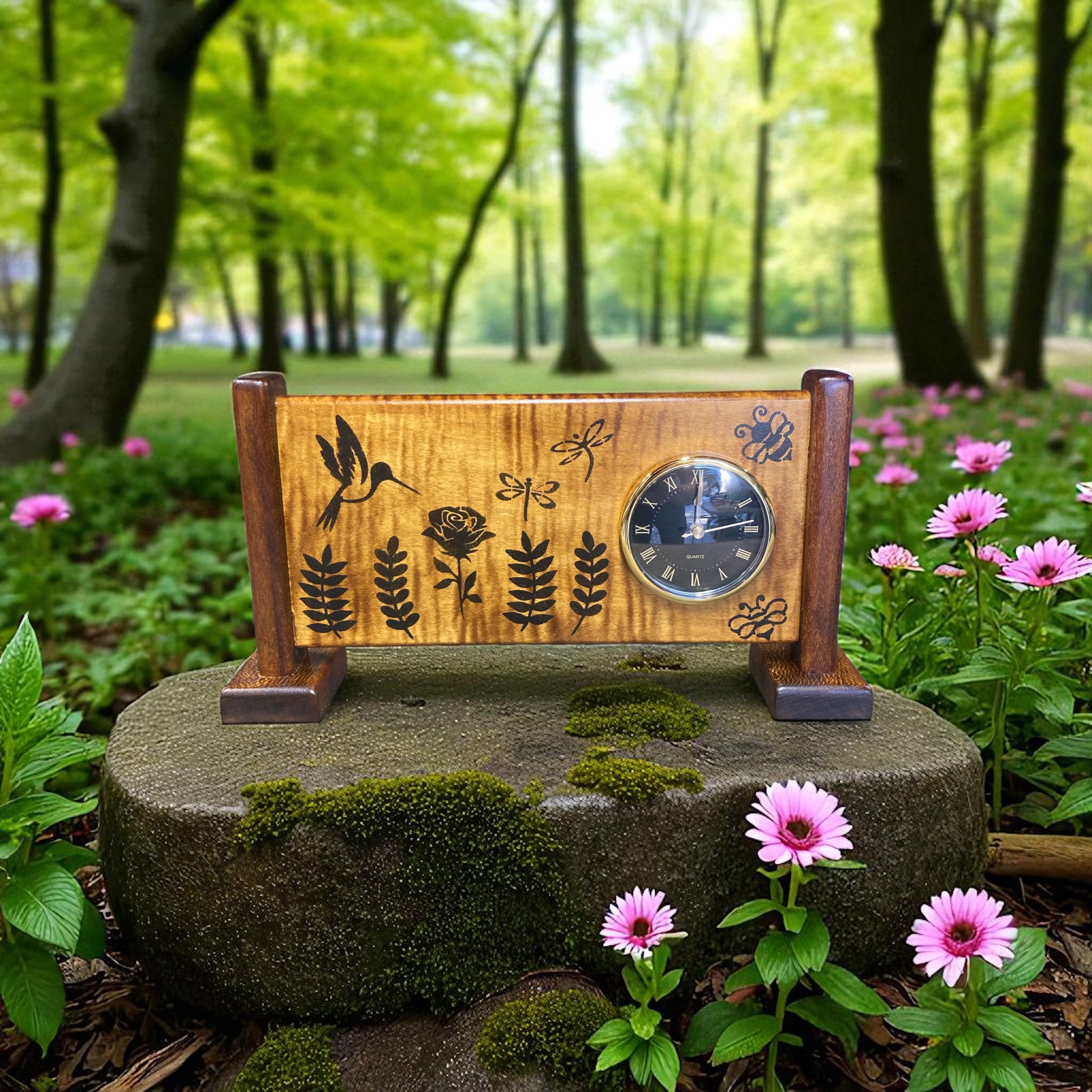 This beautiful Garden series clock is approximately 13" in length and 8" in height. It is made from Curly Maple and Quarter-Sawn Sycamore hardwood. There is a quartz movement that can be pulled out to replace battery or reverse the clock with the design on the opposite side.This clock has a two tone appeal that makes it stand out from others. I call this design my reversible clock.