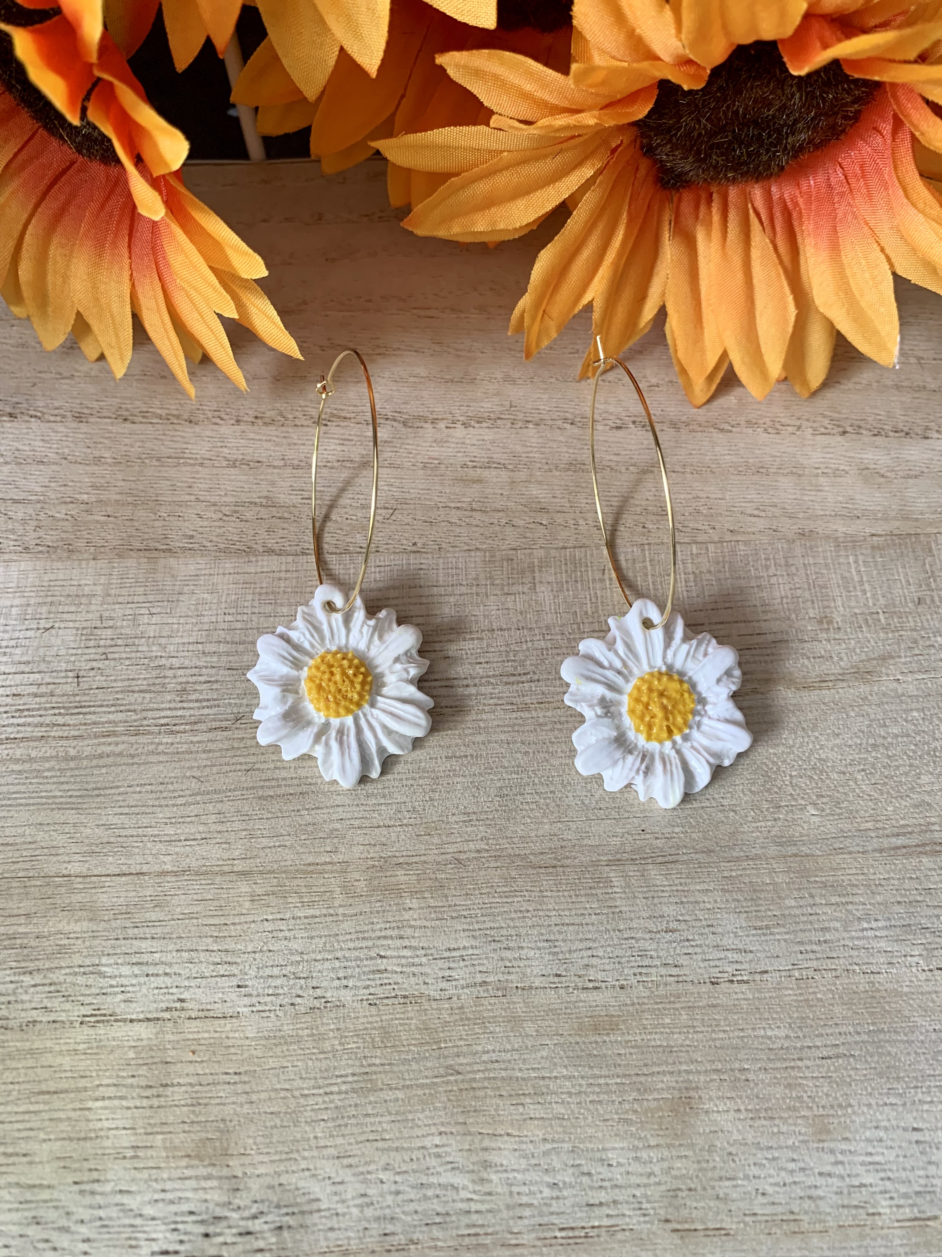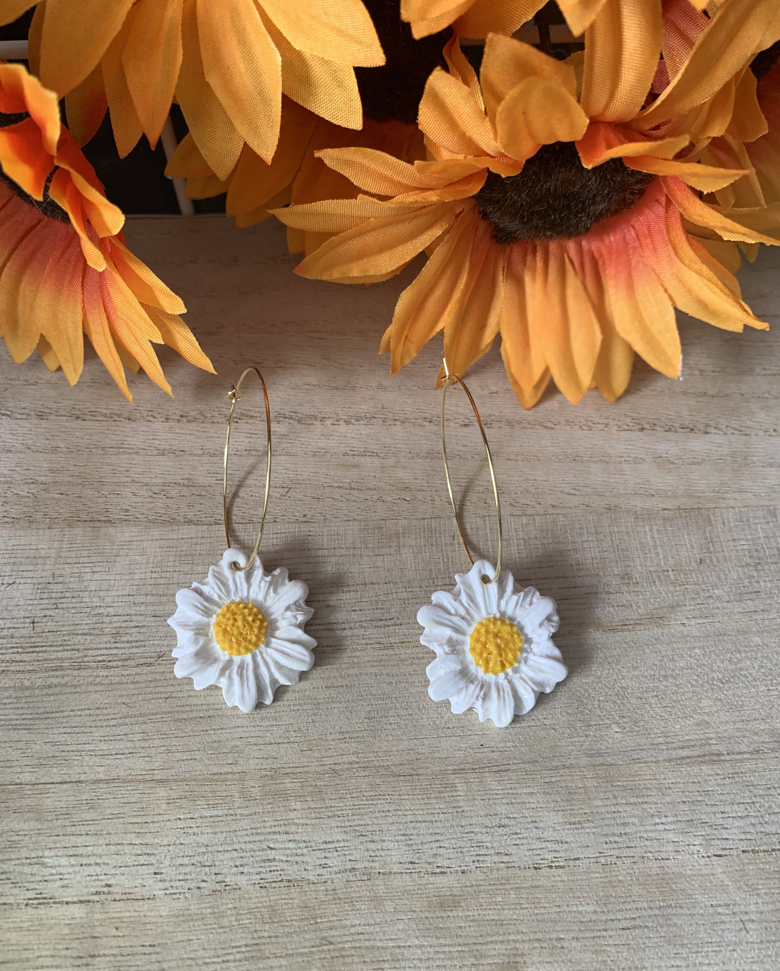 Add some charm with these lightweight 40mm hoop earrings with chic daisy floral crafted from polymer clay. Made with stainless steel for durability and comfort. These beauties are perfect for spring and summer.