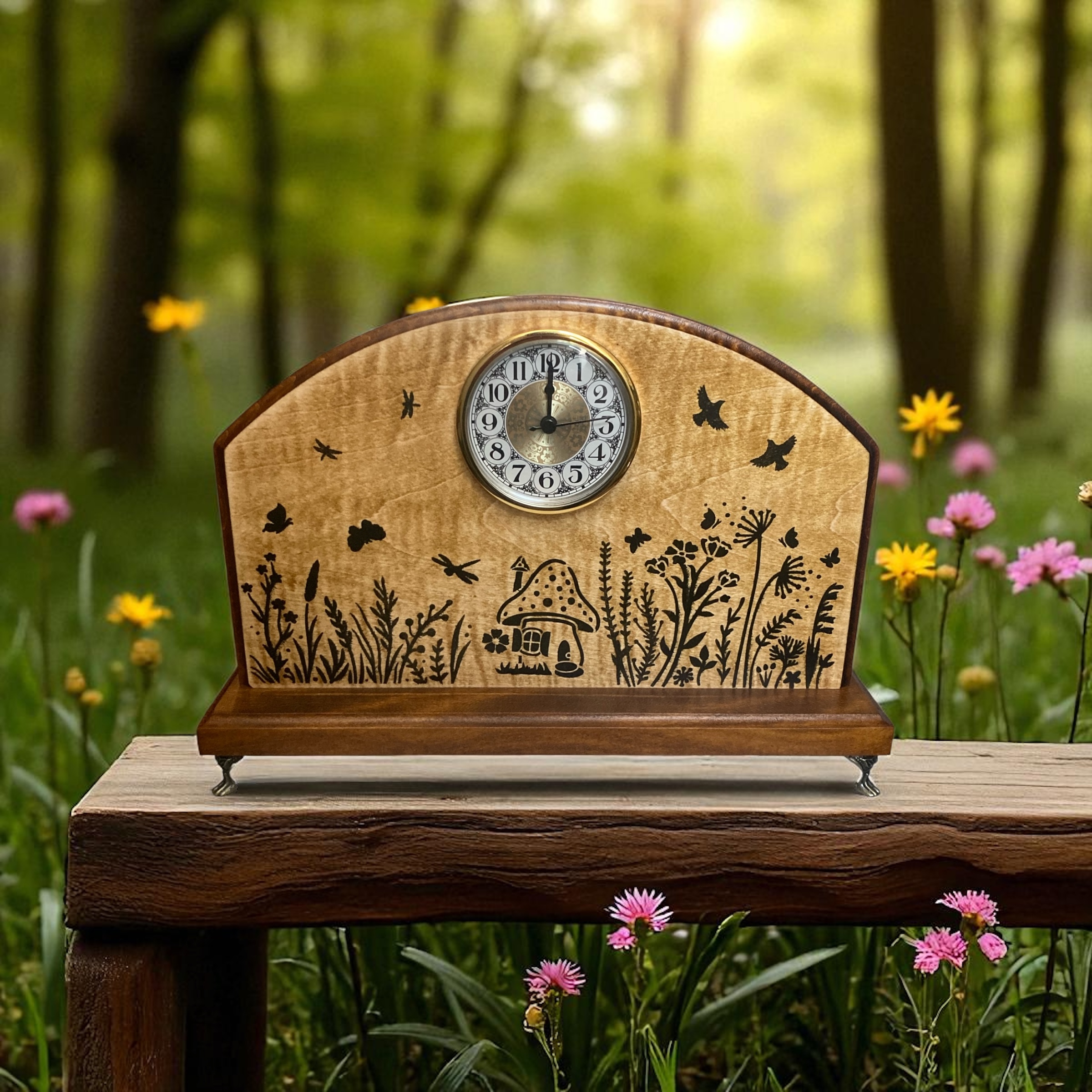 This clock is 13" x 8" she is made from Curly Maple and Sycamore hardwoods. She is beautifully decorated with garden scenery on both sides. She has a quartz movement for accurate timing and wood feels very good to her touch.