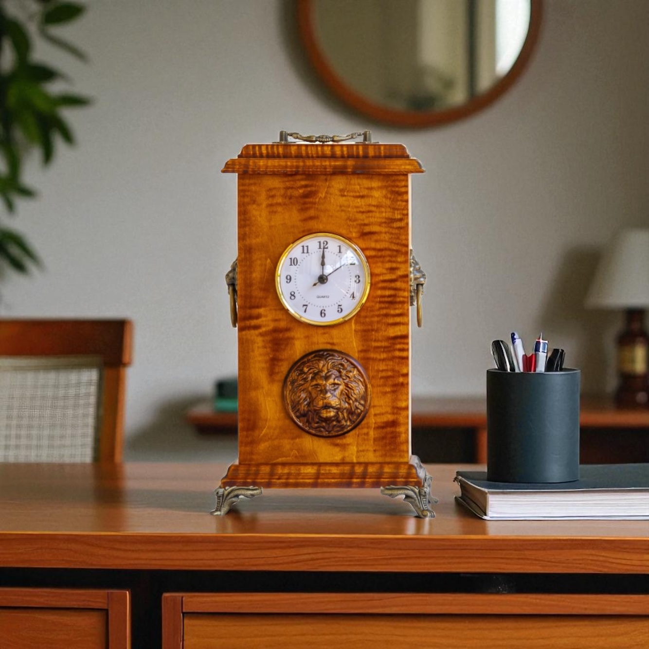 This clock was constructed with 1/2" and 3/4" Curly Maple wood. Glued construction with titebond glue and dyed with a custom color. There is a medium brown, Honey maple and Sunburst yellow formula that creates this perfect color combination. I added the lions head that was crafted in Ukraine by a master woodworker and the lions feet (legs) help support the clock and feeling of a man's clock.
