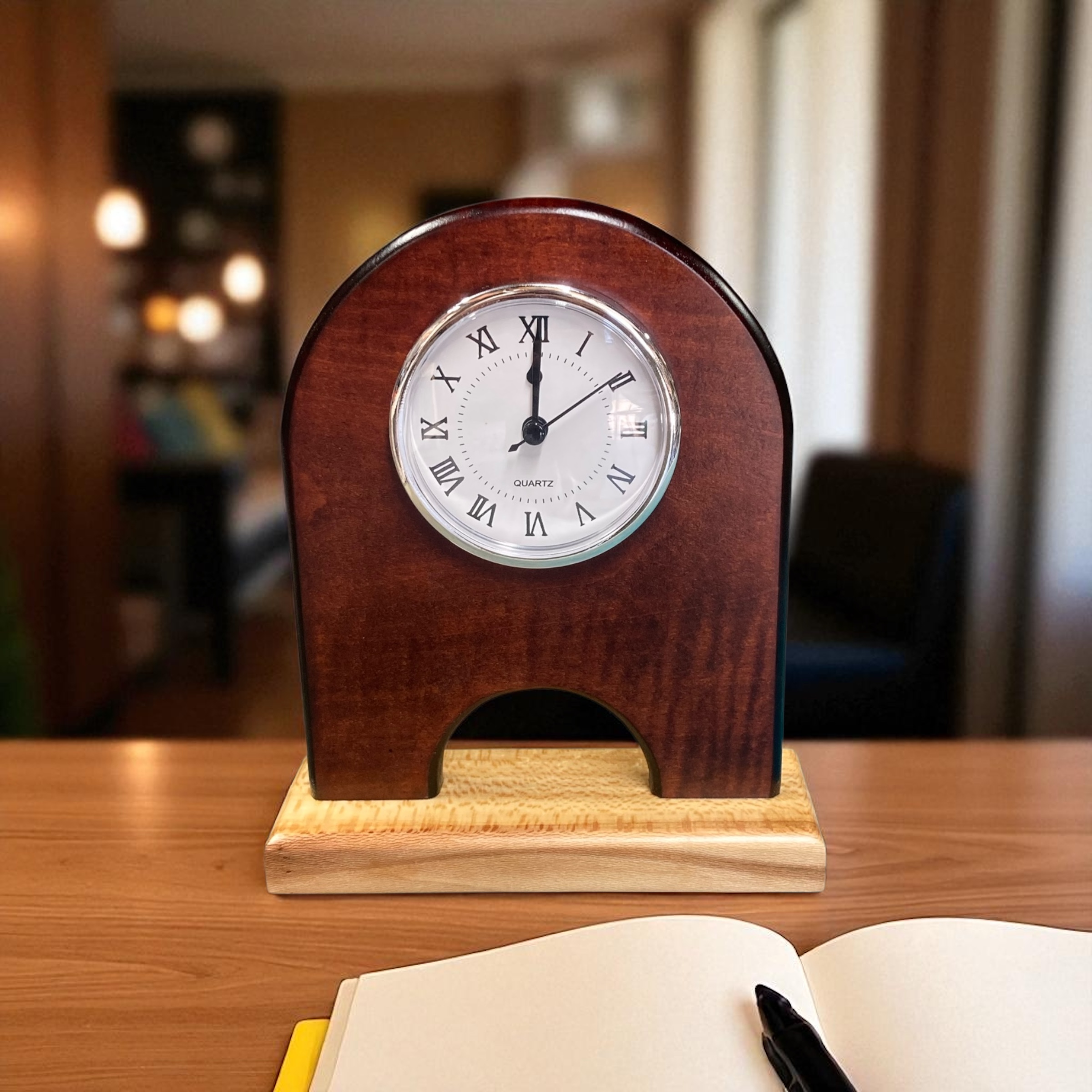 This beautiful little clock was designed with the office space in mind. It has a beautiful finish to enhance the curly maple. It may be small, but it will still stand out in the room. It's a great way to start a conversation.