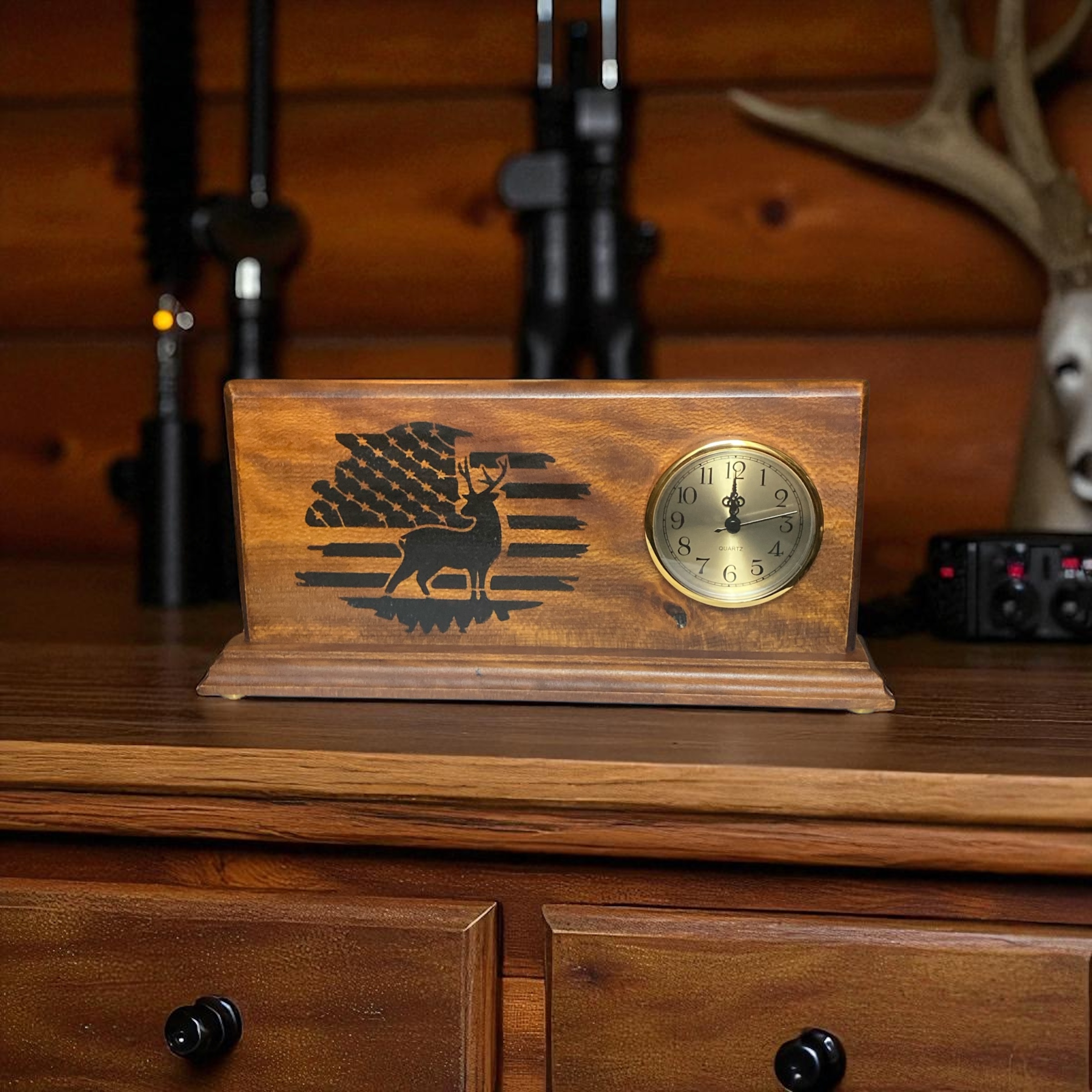 This Patriotism Clock is proudly displaying an Buck on the American flag, this series of clocks will show off your patriotism to everyone that sees it. American made by an American craftsman.