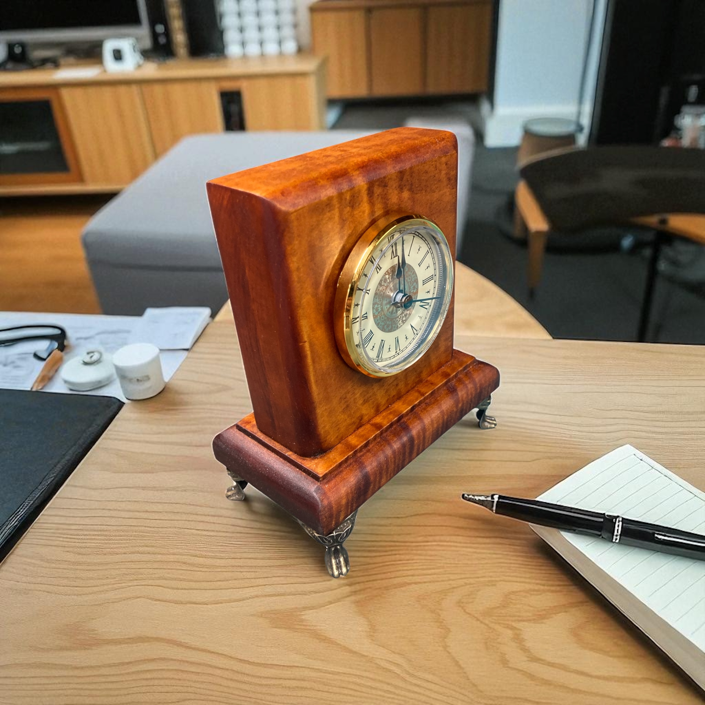 This little clock looks great sitting on a vanity or end table being just a little larger than a hand. She is very smooth to the touch and the finish is a satin clear look. There is a quartz's movement that pulls out to change to battery. The Curly Maple clock just looks awesome .