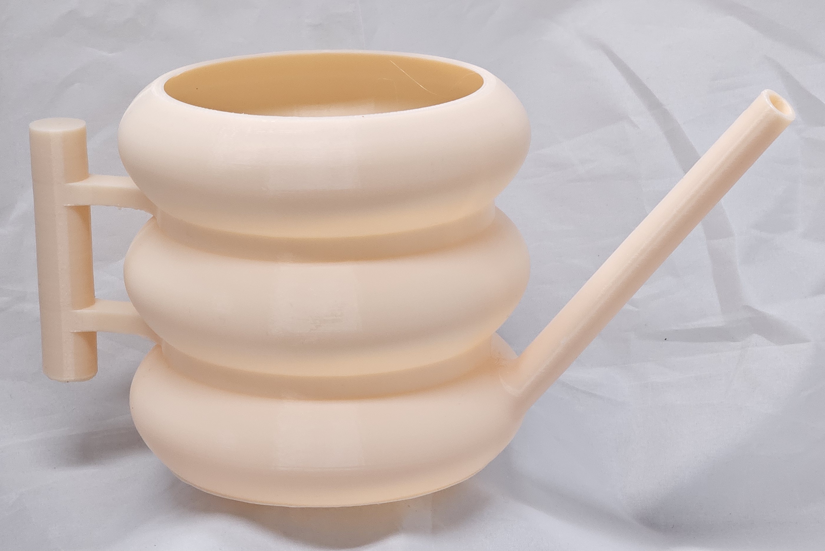 These 3D printed watering can is designed by Modern Machine. The light peach color is modern and useful for home or garden plant needs. It has been tested and does hold water to allow plant watering.