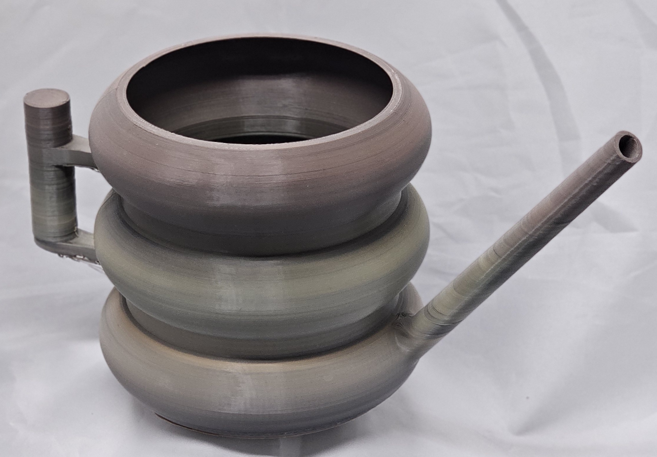 These 3D printed watering can is designed by Modern Machine. The grey/brown color is modern and useful for home or garden plant needs. It has been tested and does hold water to allow plant watering.