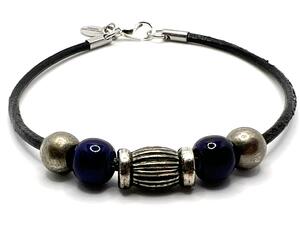 Blue and Silver Beaded Bracelet on Leather Cord