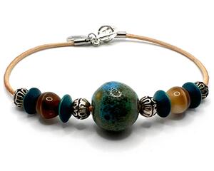 Brown, Aqua and Silver Beaded Bracelet on Leather Cord