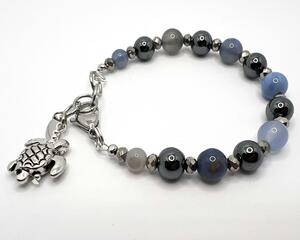 Light Blue Agate and Hematite Beaded Bracelet with Sea Turtle...