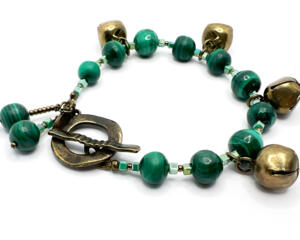 Vintage Green Bead & Bronze Bell Holiday Bracelet