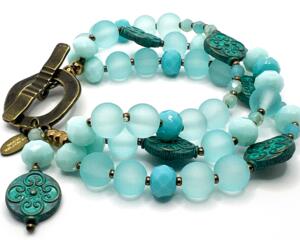 Triple-Strand Aqua Glass & Bronze Bracelet