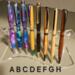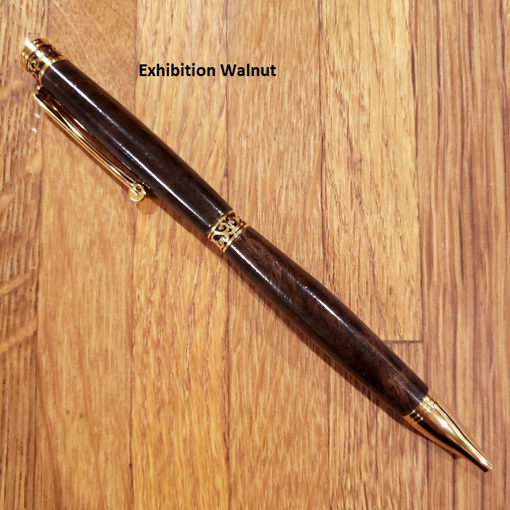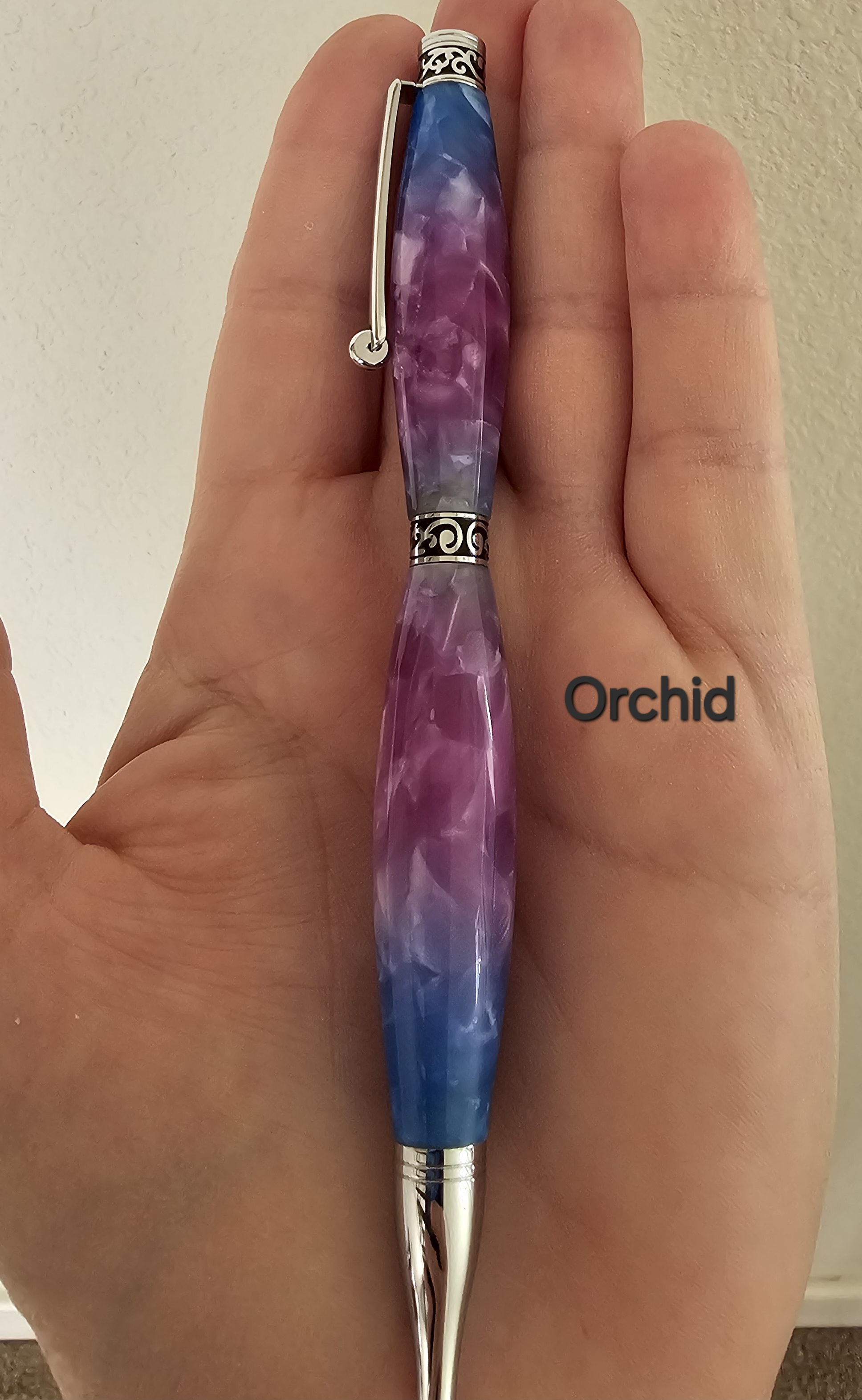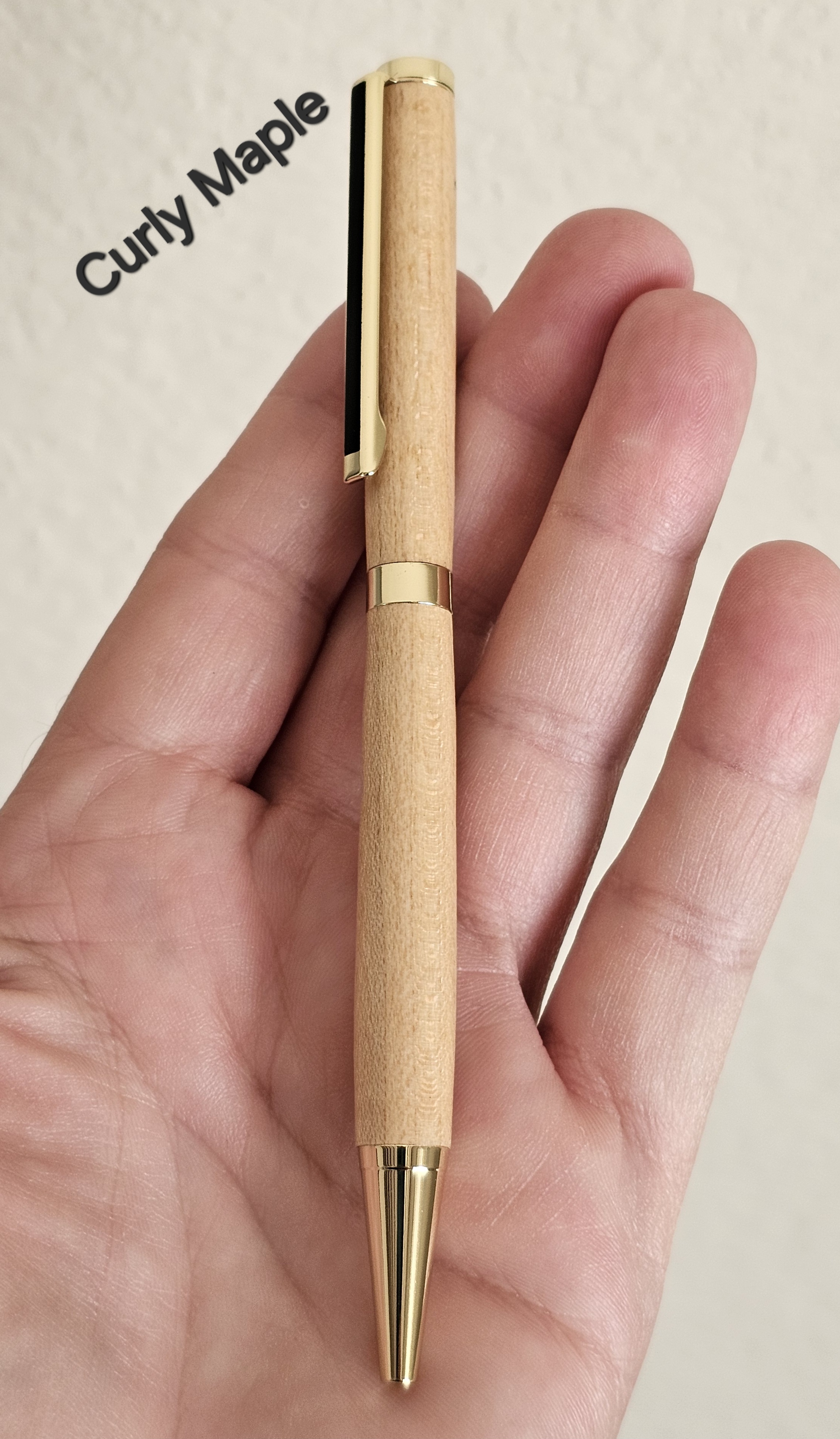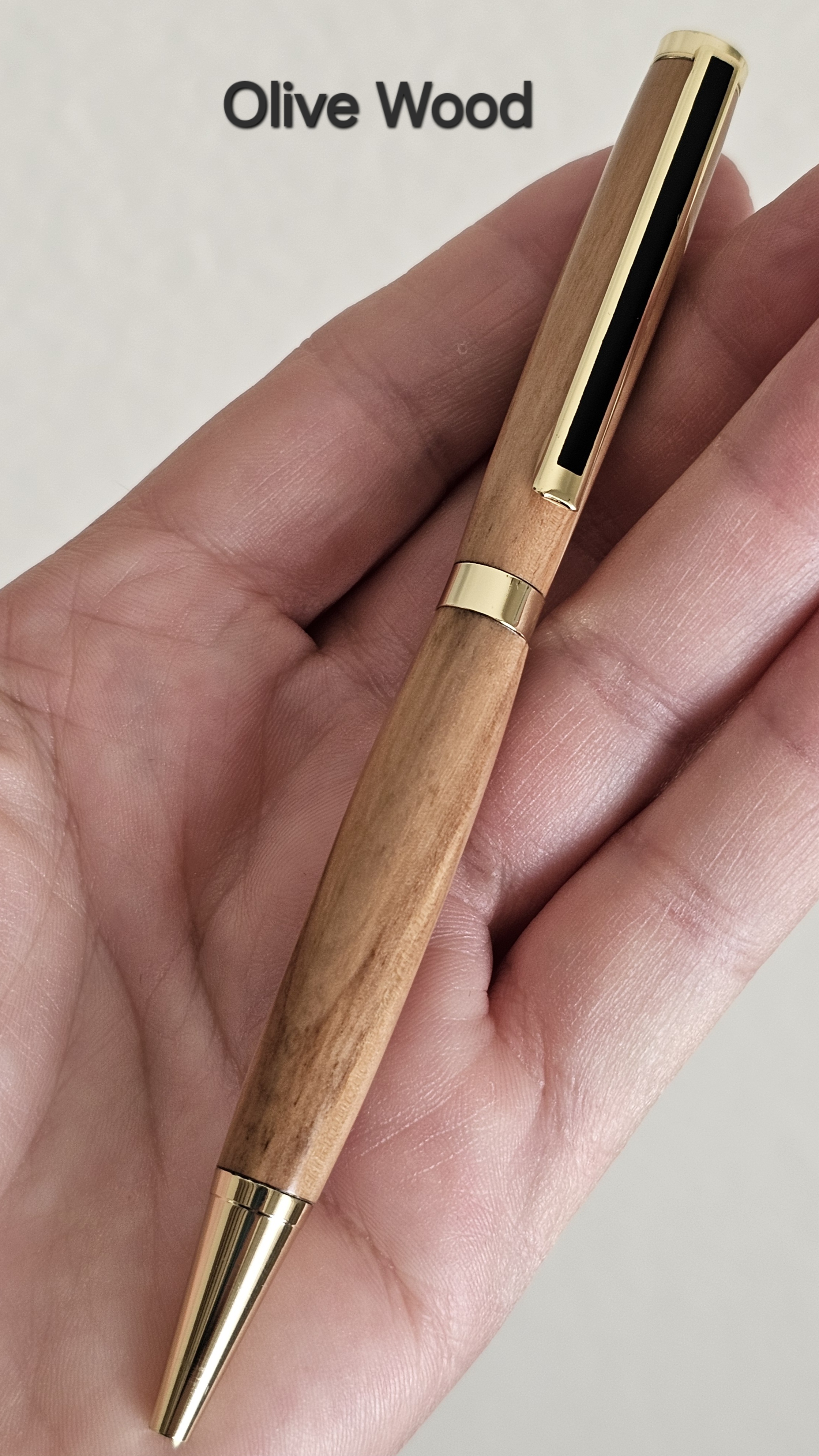 Great gift accessory for journals. Your choice of writing pens from colorful acrylics to warm woods. Each pen measures approximately 5" long and widths vary up to 1/2" wide. All have a twist mechanism. The pen bodies were turned on a lathe and polished to bring out the beauty of the material used. All wood pens are sealed with a high friction polish. Pens described with "24k" are gold plated.