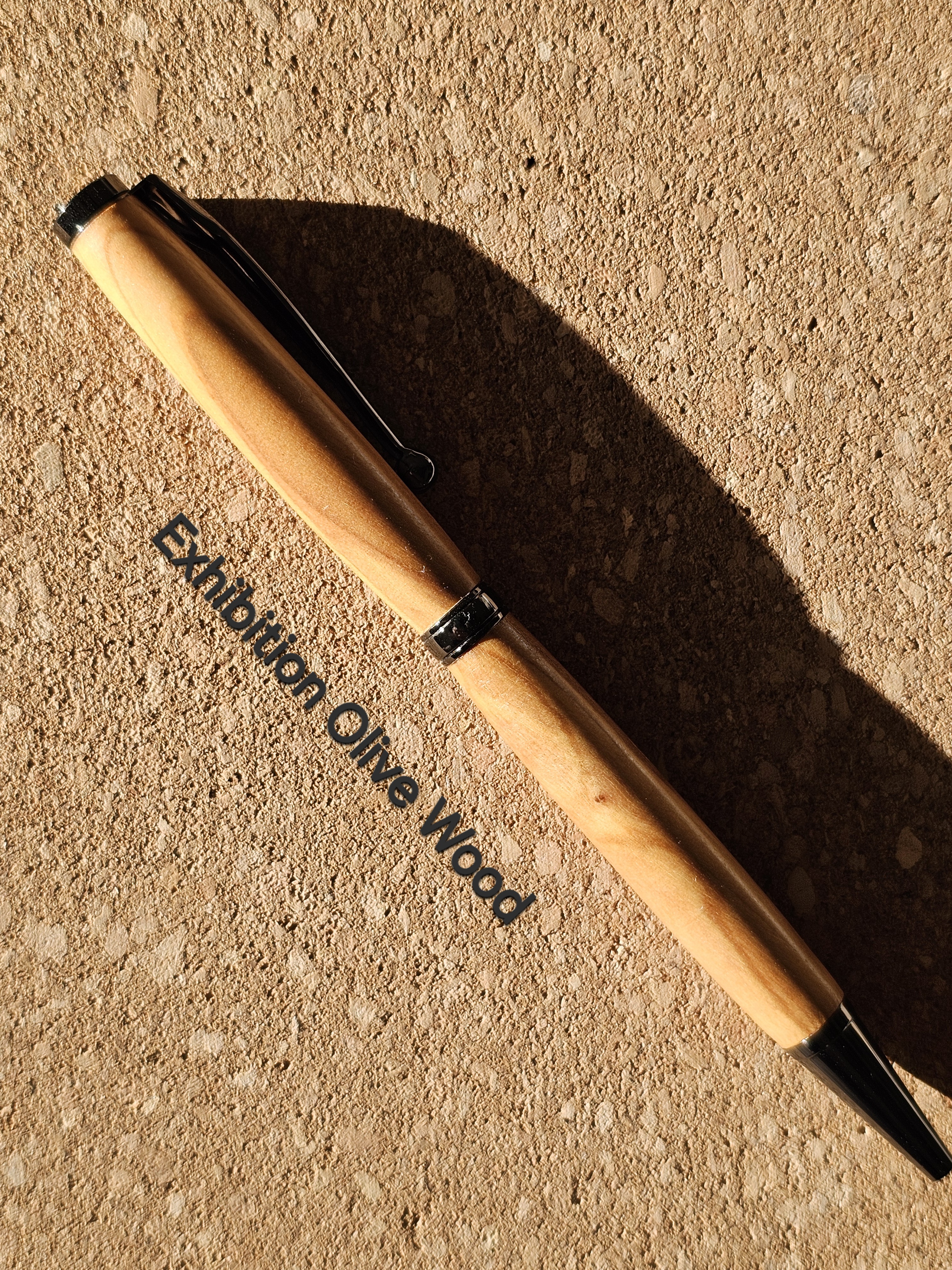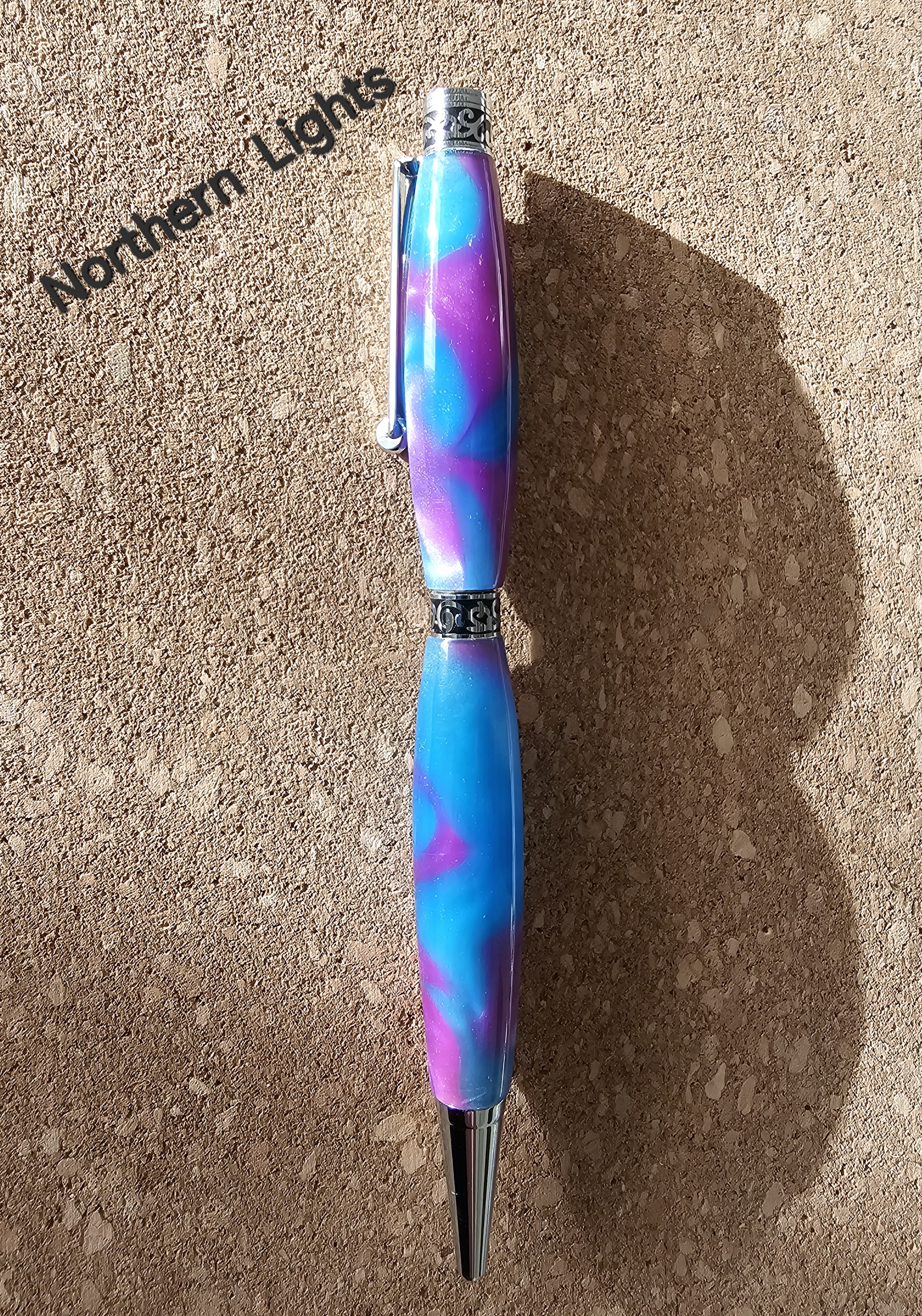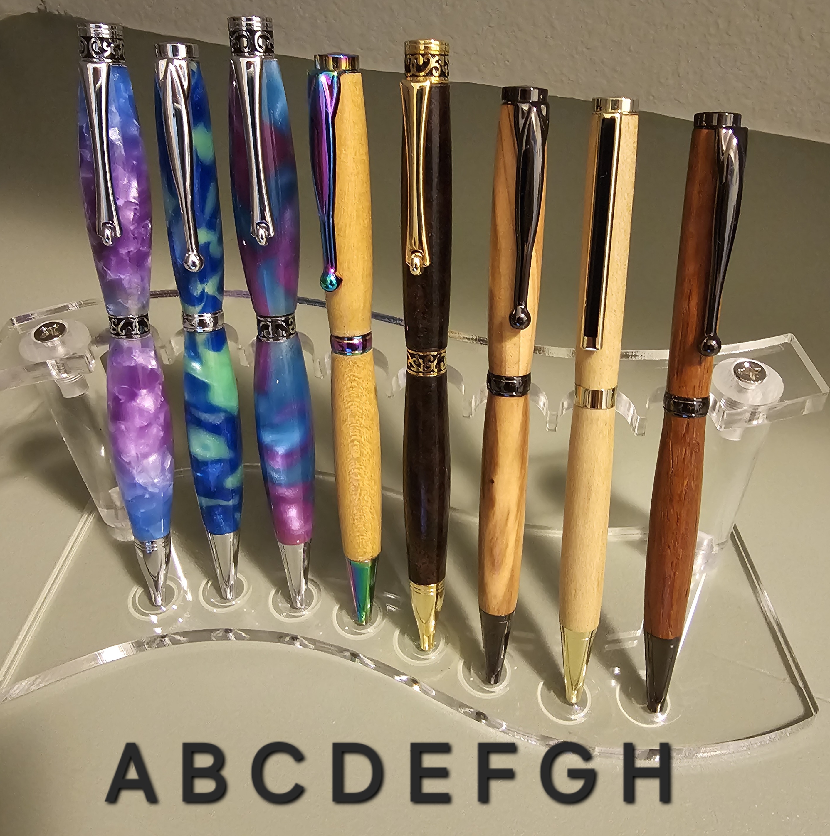 Pen bodies are turned on a lathe, then polished to a sheen (wood) or high gloss (acrylics). Once polished they are assembled with a pen kit hardware.