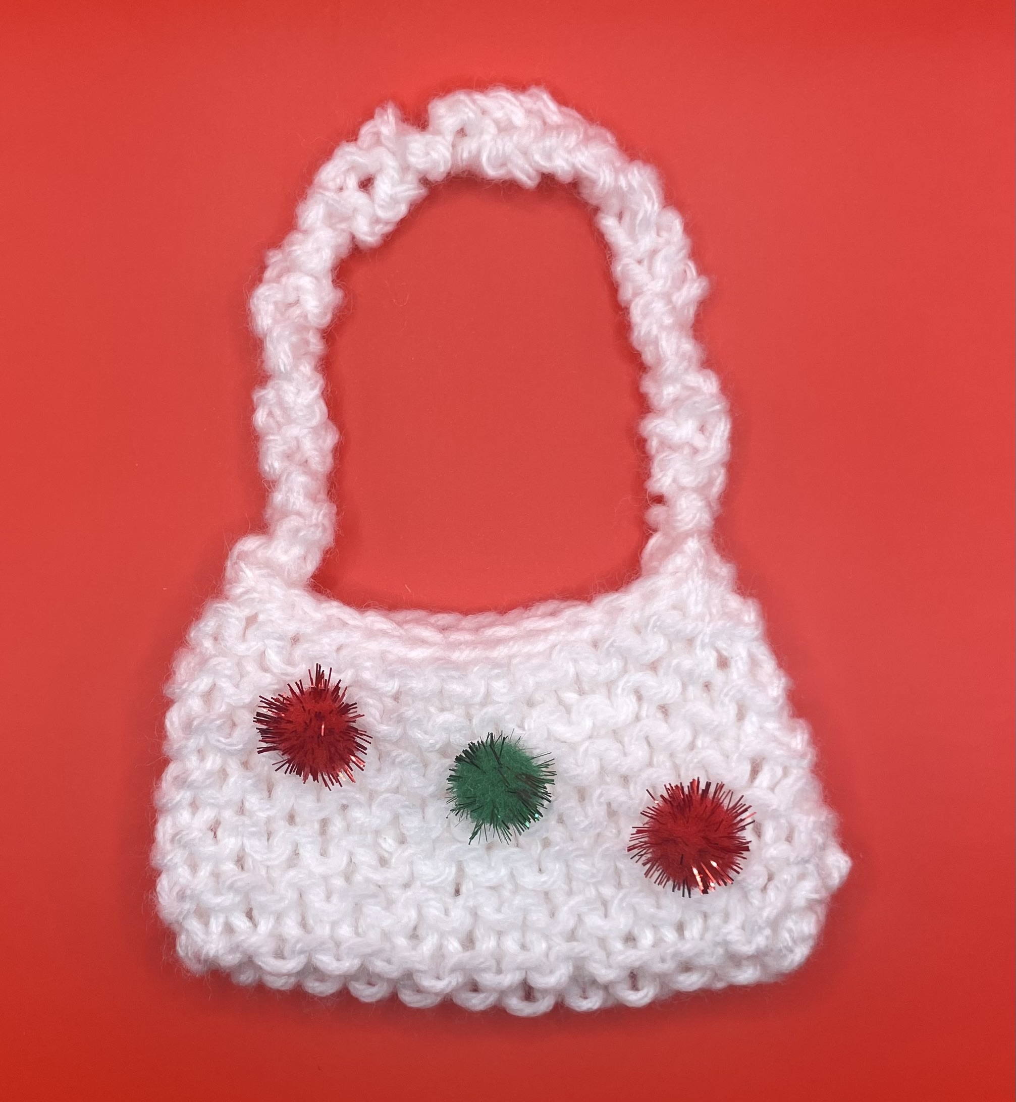 First, I always choose a yarn color (holidays are THE best) that “speaks to me.” Next comes hand knitting the base of the bag followed by adding a strap - also hand knitted. The last step (my favorite) is adding the embellishment! Through the process I imagine the child receiving this doll accessory. That always puts a big smile on my face. Enjoy❣️