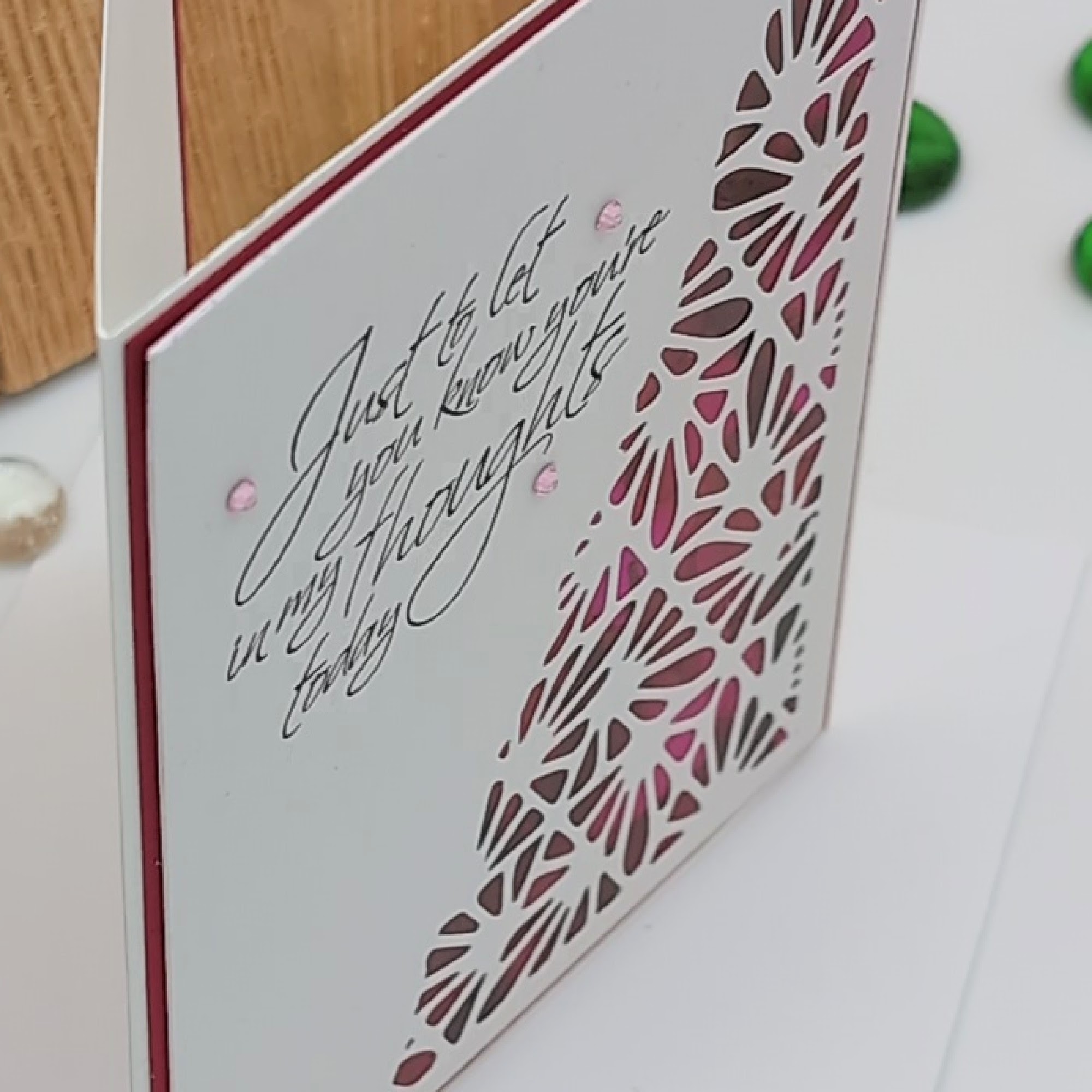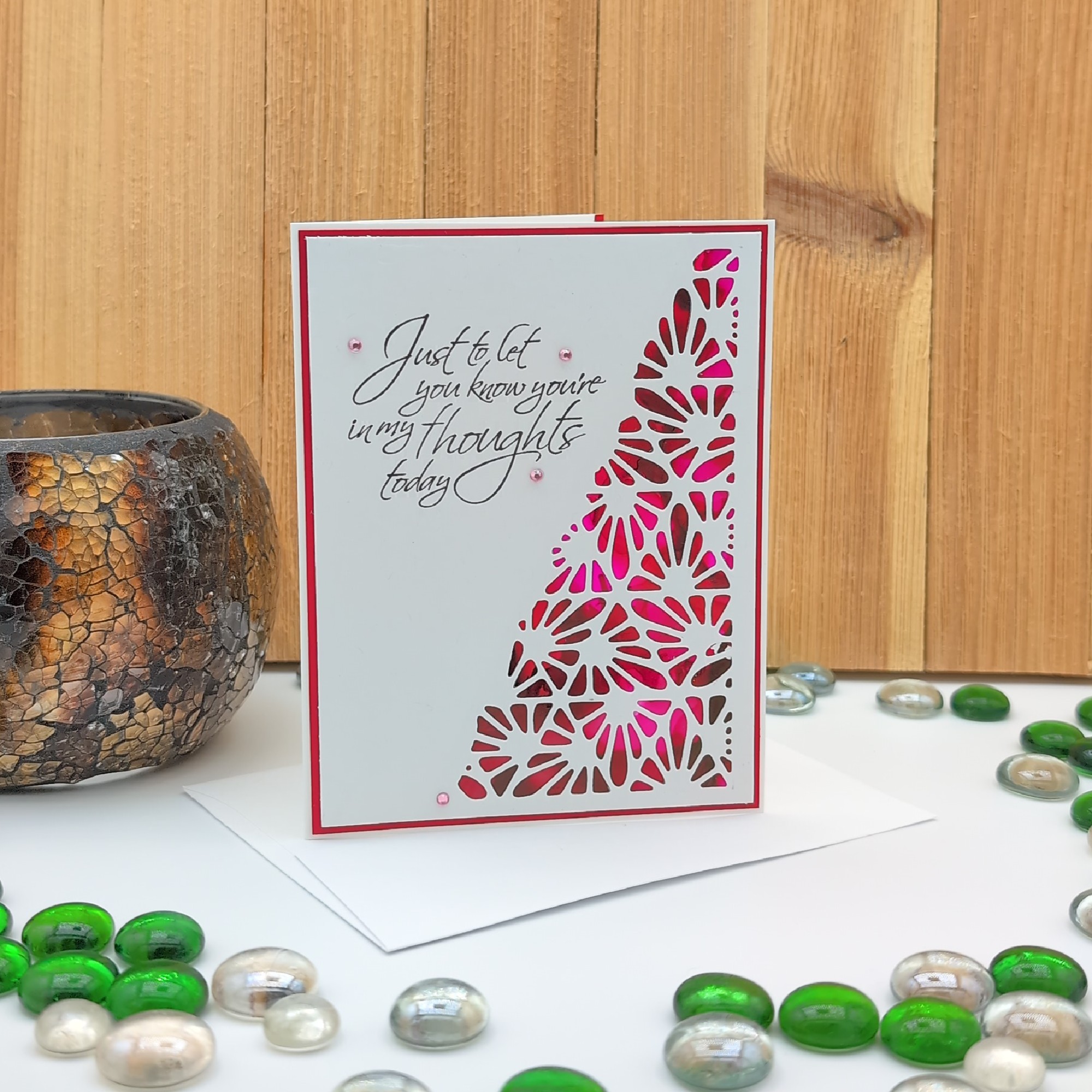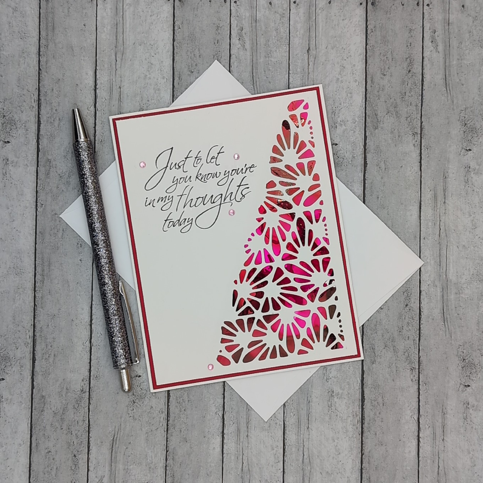 This handmade card offers a quiet moment of connection. The front reads, “Just to let you know you're in my thoughts today,” set against a rich alcohol ink background in warm reds and pinks. Blank inside for your personal message, it’s perfect for sending comfort, encouragement, or a simple reminder that someone is loved. Crafted with care and painterly detail, this card is ideal for any occasion that calls for warmth and sincerity. Comes with a blank envelope.