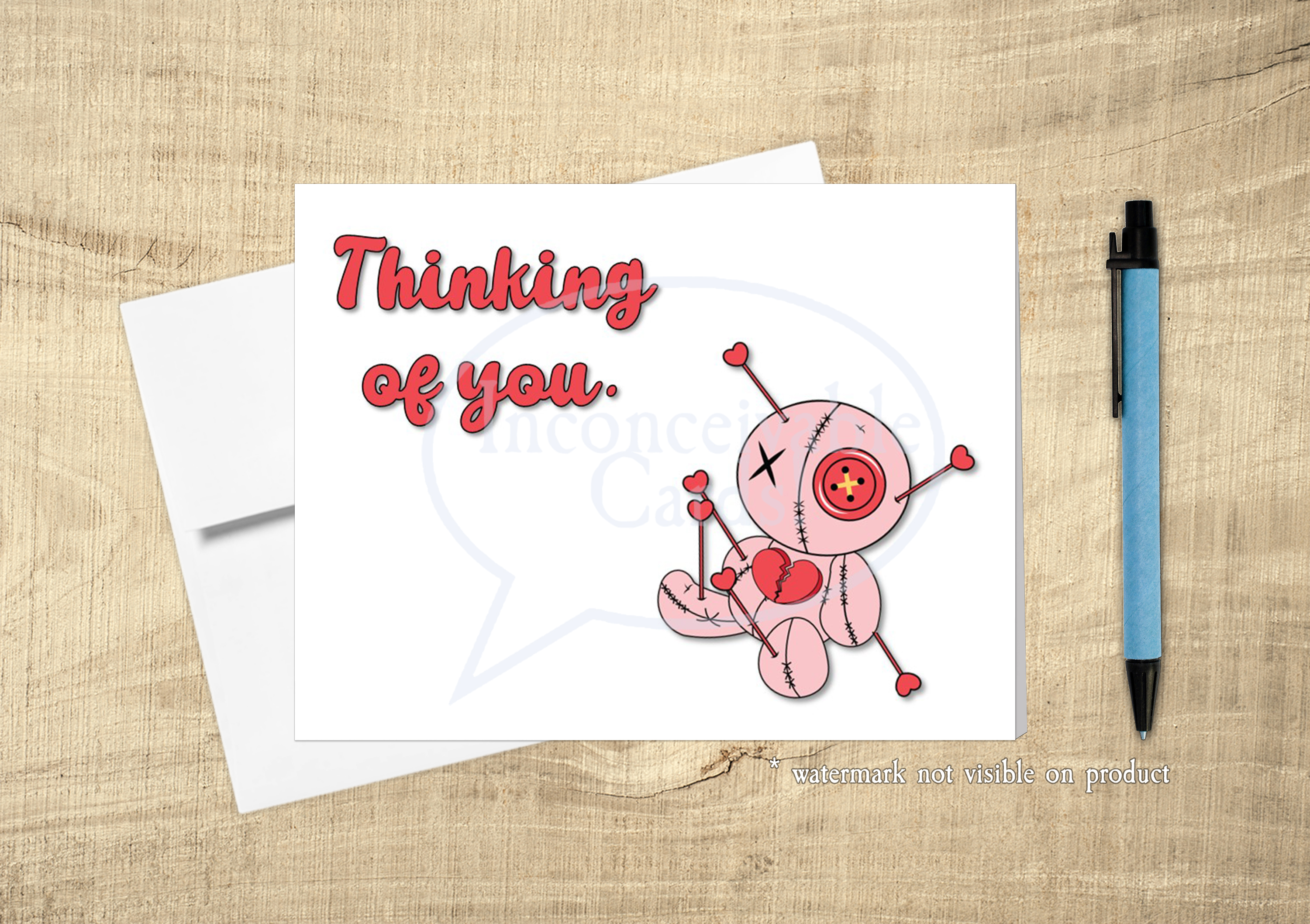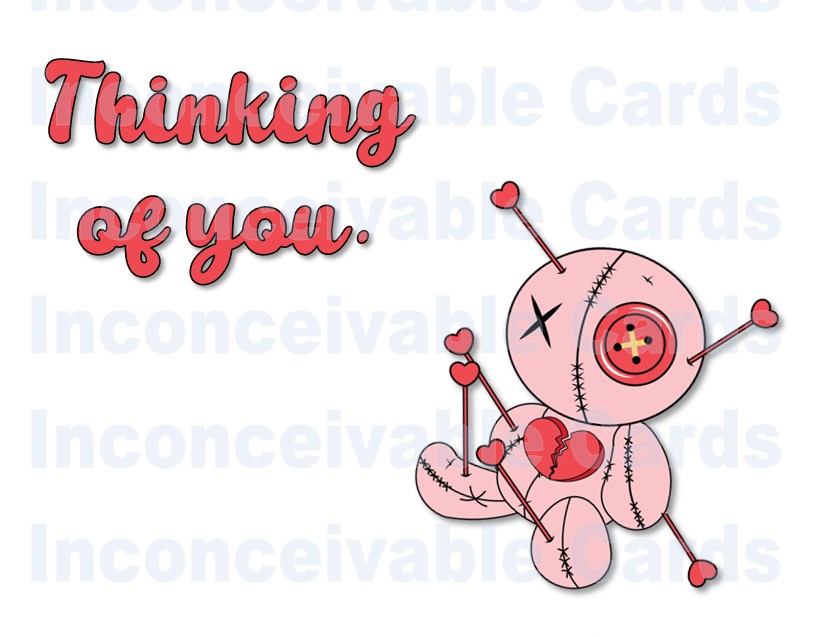 Because nothing says “you’re on my mind” quite like a stitched-up doll with pins in its broken heart. This card walks the perfect line between "I care deeply" and "I have questions about my coping skills." Use it for exes, besties, frenemies, or your therapist — you're welcome.